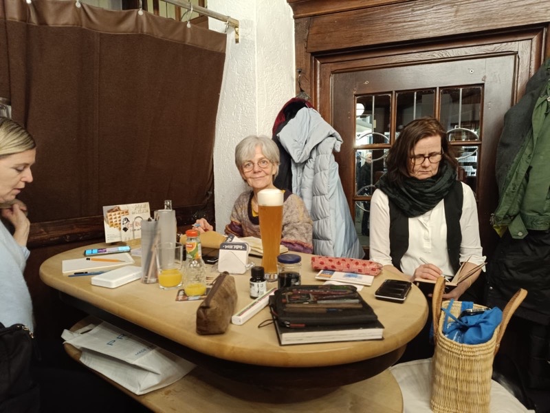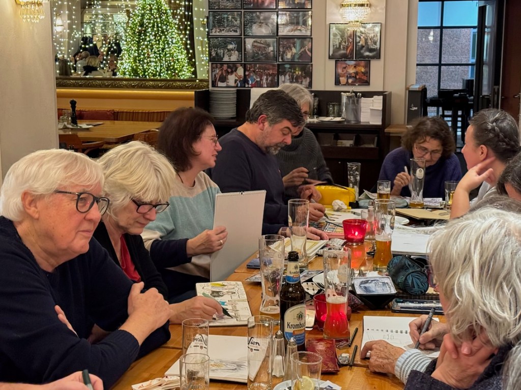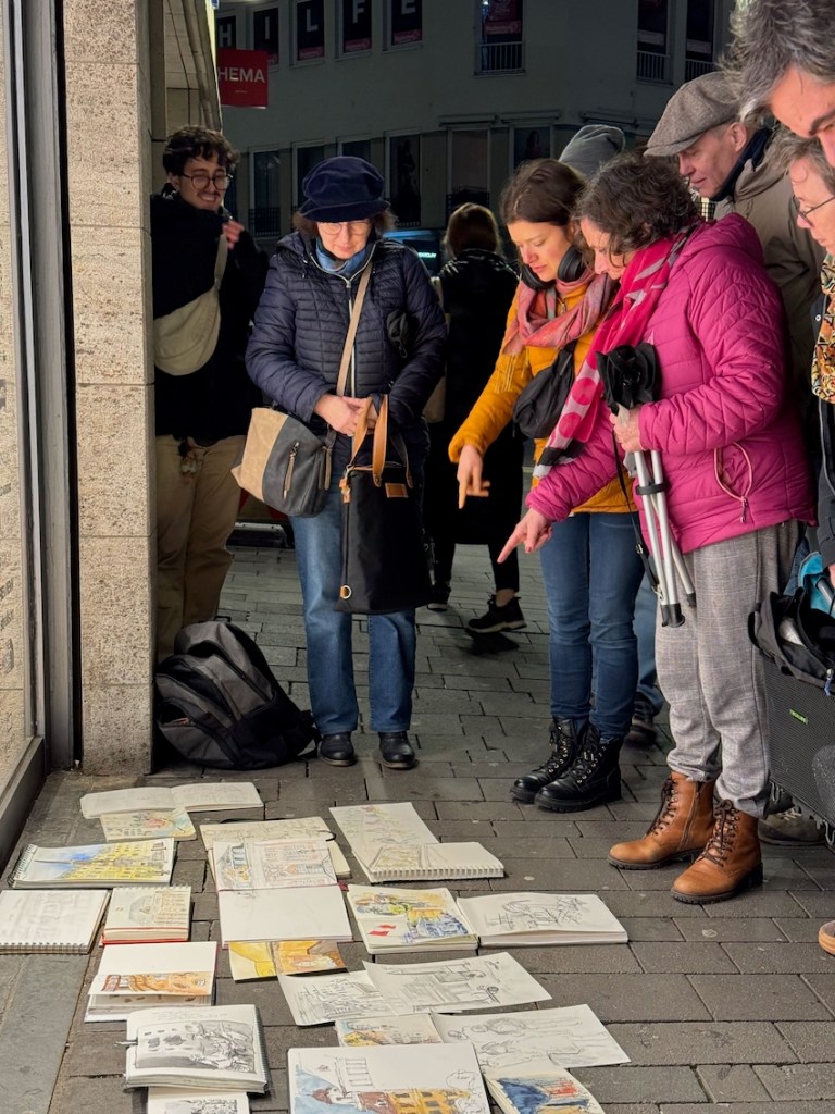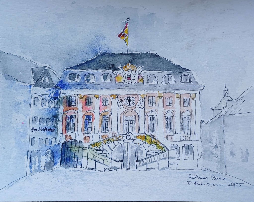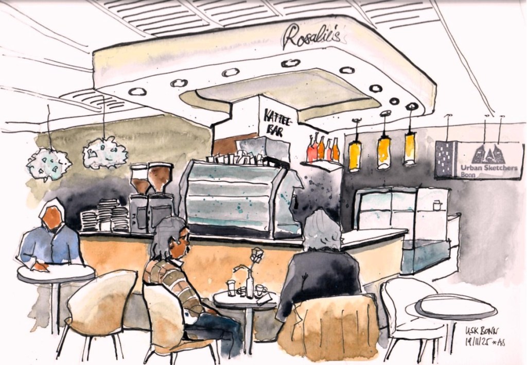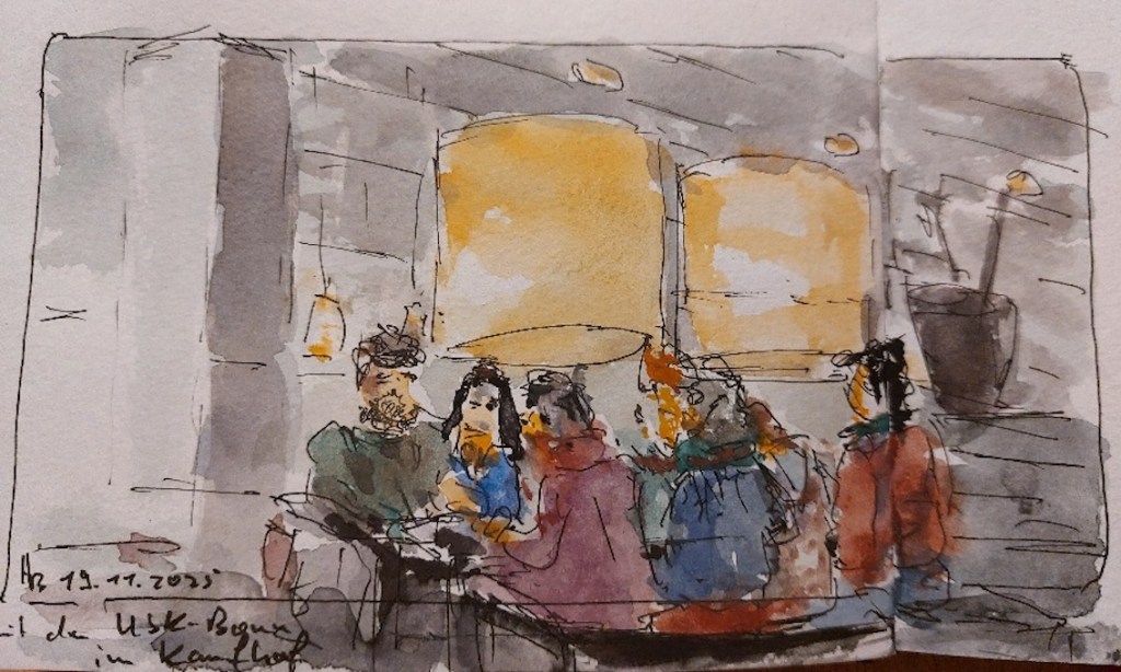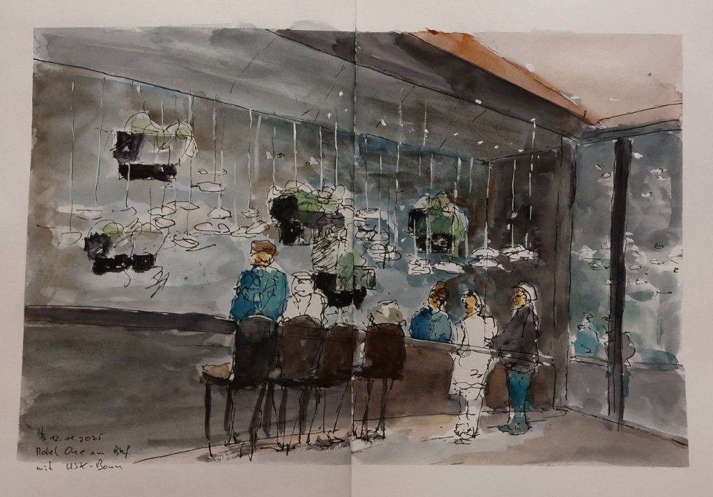 Wir haben uns, wie gewohnt, ab Mitte-Januar jeden Mittwoch getroffen; das Jahr begann traditionsmäßig im Museum König. (Am 14.01.2026 beginnt dort auch das Zeichen-Jahr für uns, aber dazu wird es noch eine gesonderte E-Mail geben.) Wir organisierten in 2025, gemeinsam mit den KölnerInnen und KoblenzerInnen, das dritte regionale Jahrestreffen der Urban Sketcher (Nächstes Jahr wieder!). Viele von uns sind gemeinsam zum Jahrestreffen der Deutschen Urban Sketcher nach Stuttgart gefahren (nächstes Jahr geht es nach Bremen). Und wir haben nun einen eigenen Stempel, den wir bei unseren Treffen dabei haben.