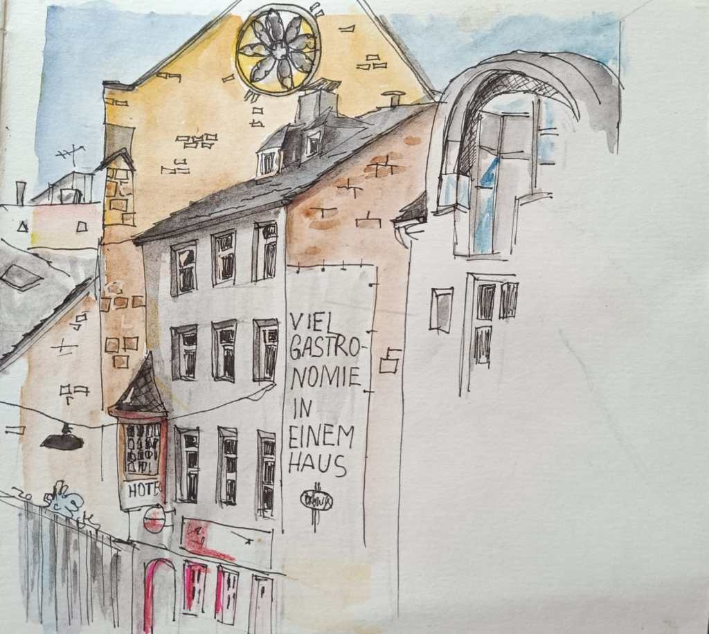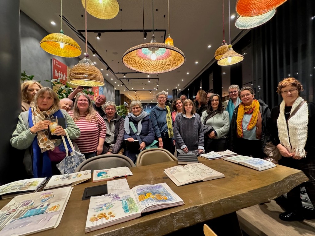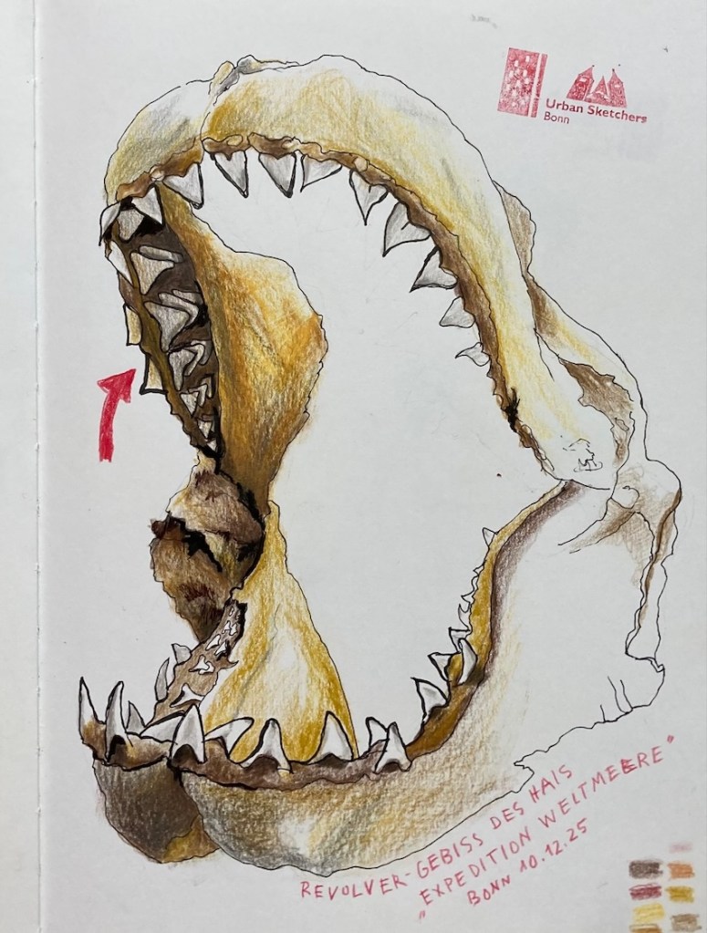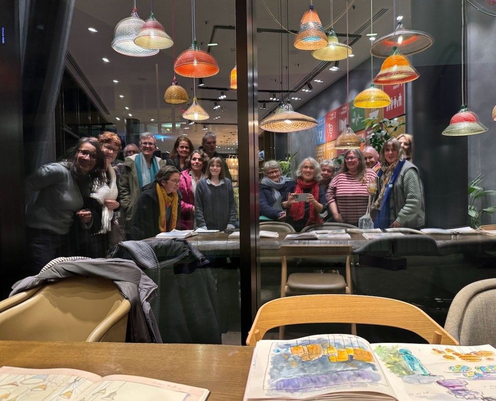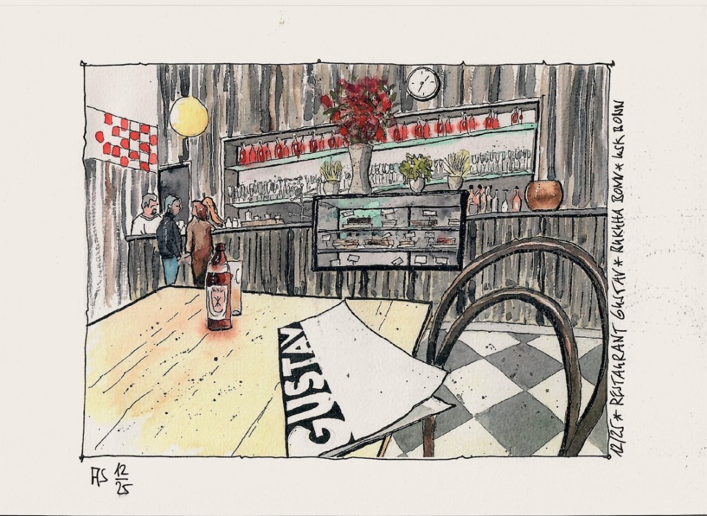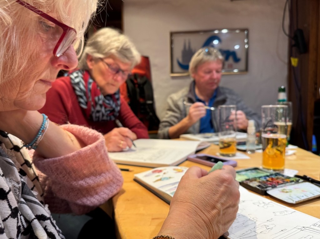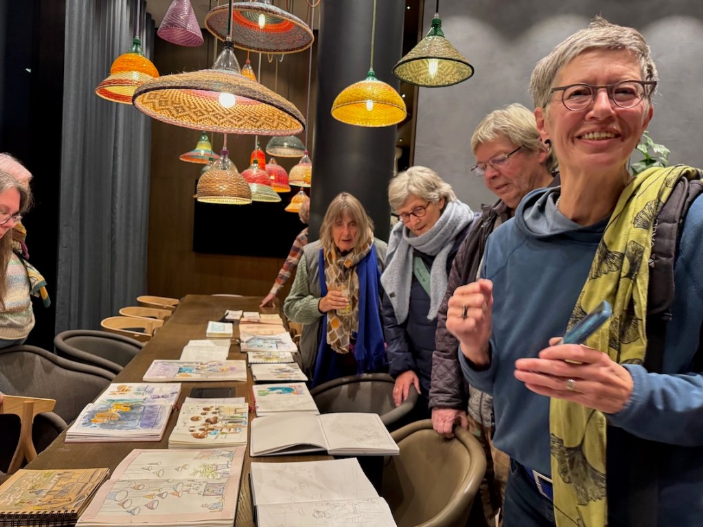 Wir haben uns, wie gewohnt, ab Mitte-Januar jeden Mittwoch getroffen; das Jahr begann traditionsmäßig im Museum König. (Am 14.01.2026 beginnt dort auch das Zeichen-Jahr für uns, aber dazu wird es noch eine gesonderte E-Mail geben.) Wir organisierten in 2025, gemeinsam mit den KölnerInnen und KoblenzerInnen, das dritte regionale Jahrestreffen der Urban Sketcher (Nächstes Jahr wieder!). Viele von uns sind gemeinsam zum Jahrestreffen der Deutschen Urban Sketcher nach Stuttgart gefahren (nächstes Jahr geht es nach Bremen). Und wir haben nun einen eigenen Stempel, den wir bei unseren Treffen dabei haben.