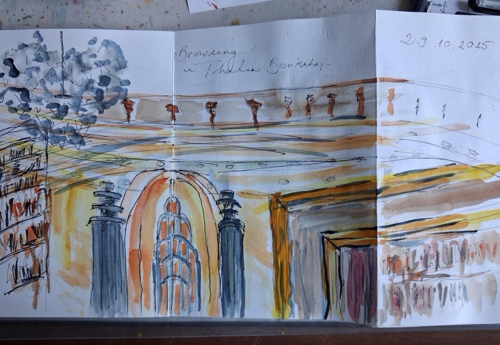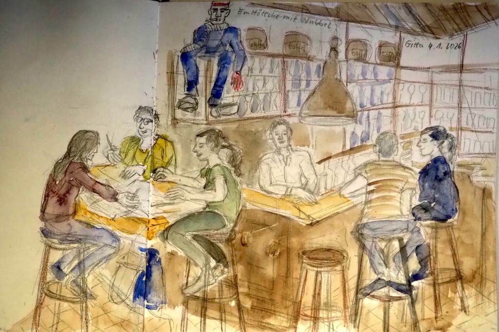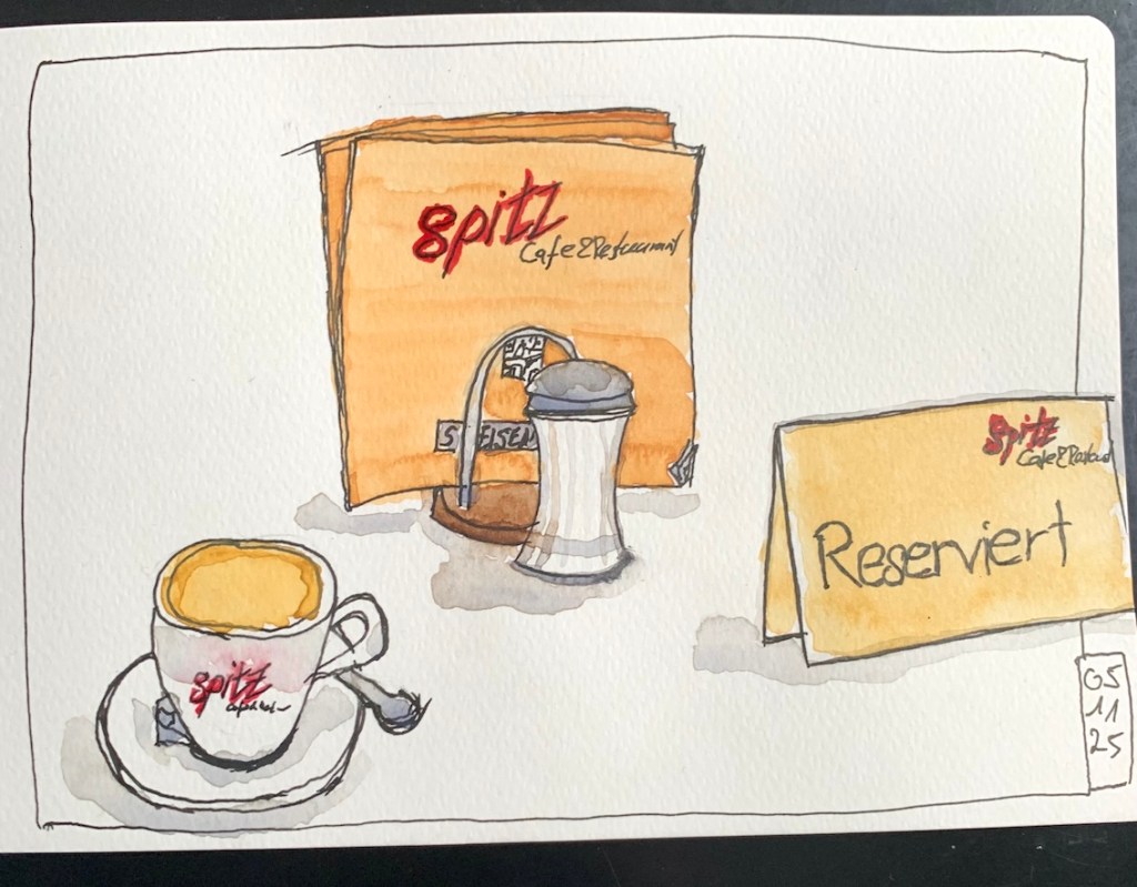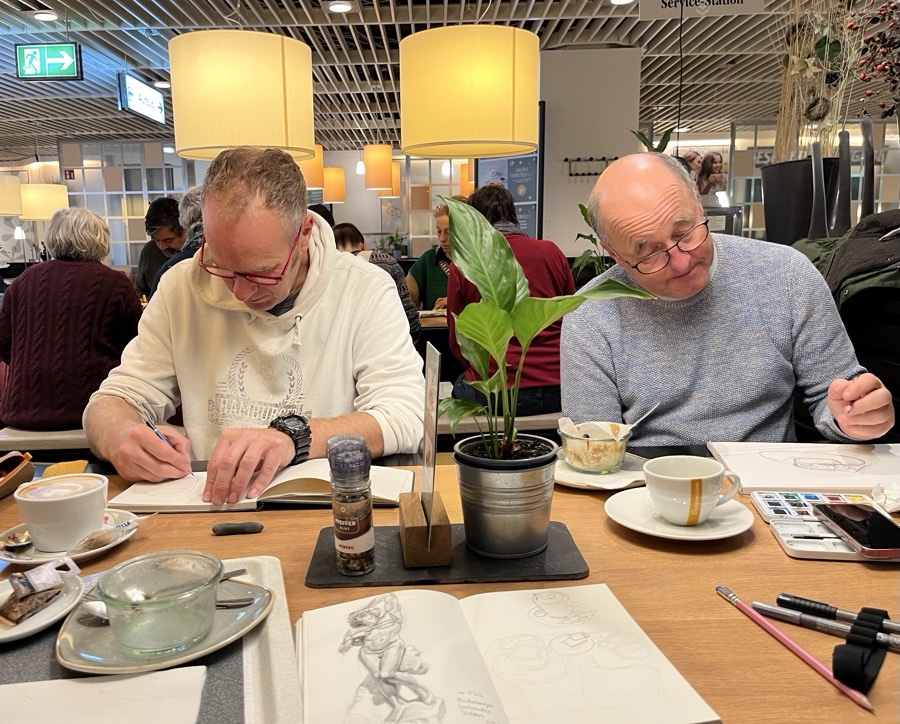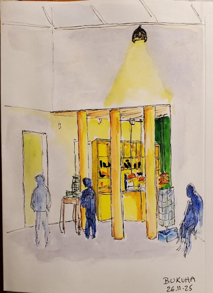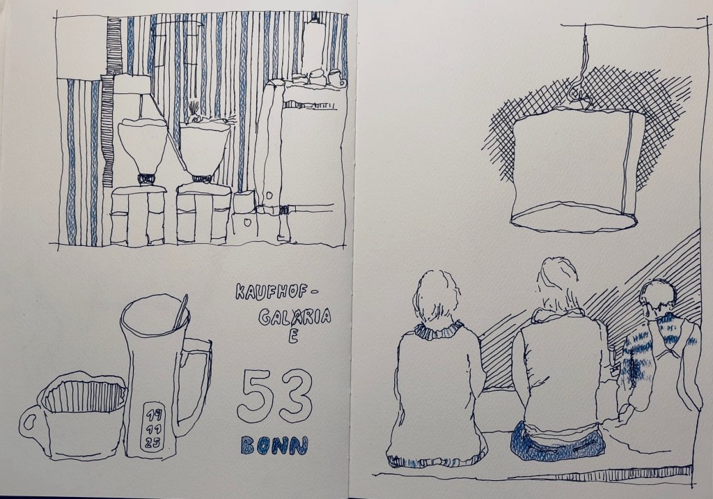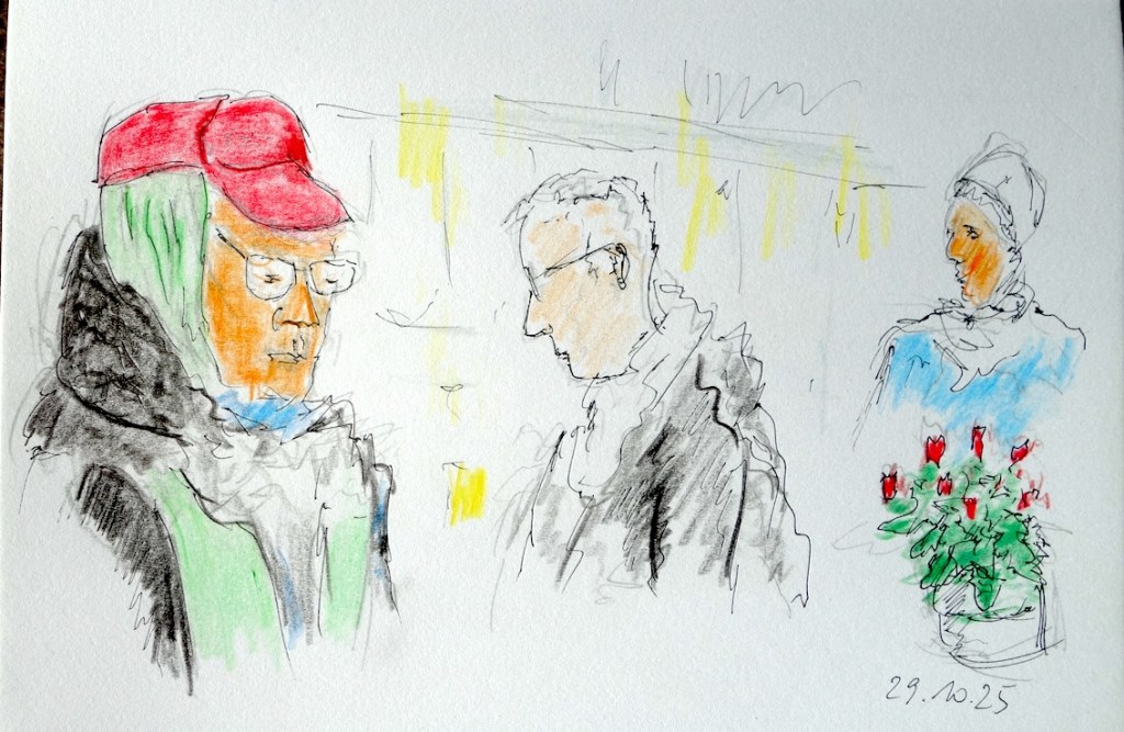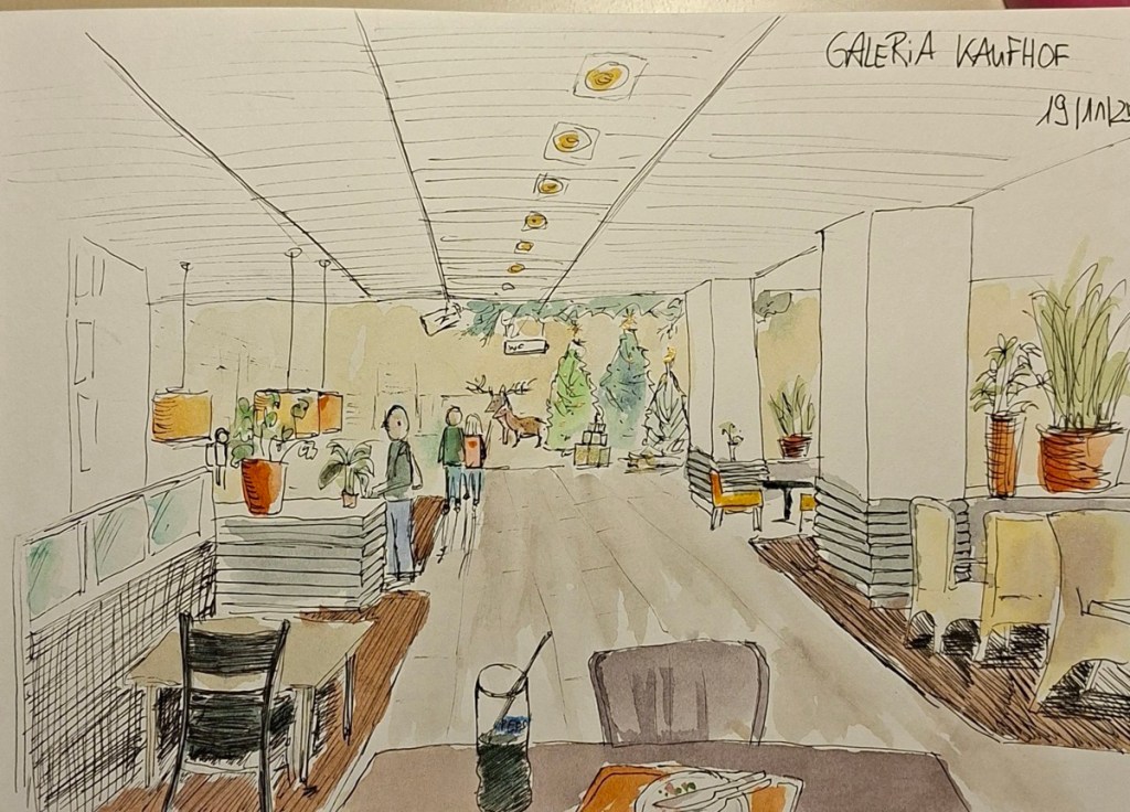 Wir treffen uns am nächsten Mittwoch, dem 19.11.2025, ab 18 Uhr oder früher (die Vernissage machen wir auch etwas früher, siehe unten) im Kaufhof-Galeria-Restaurant. Das Restaurant befindet sich in der 4. Etage, man kommt gut mit der Rolltreppe hin. Es gibt dort viele Sitzmöglichkeiten und sogar einen Blick in den Verkaufsraum. Wem das zu bieder ist, kann sich irgendwo im Kaufhof eine ruhigere Ecke suchen und das Skizzenbuch zücken.
