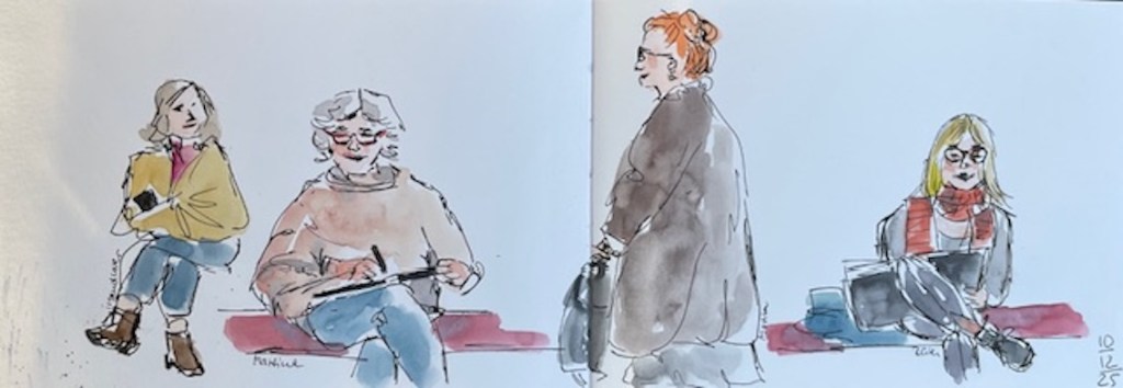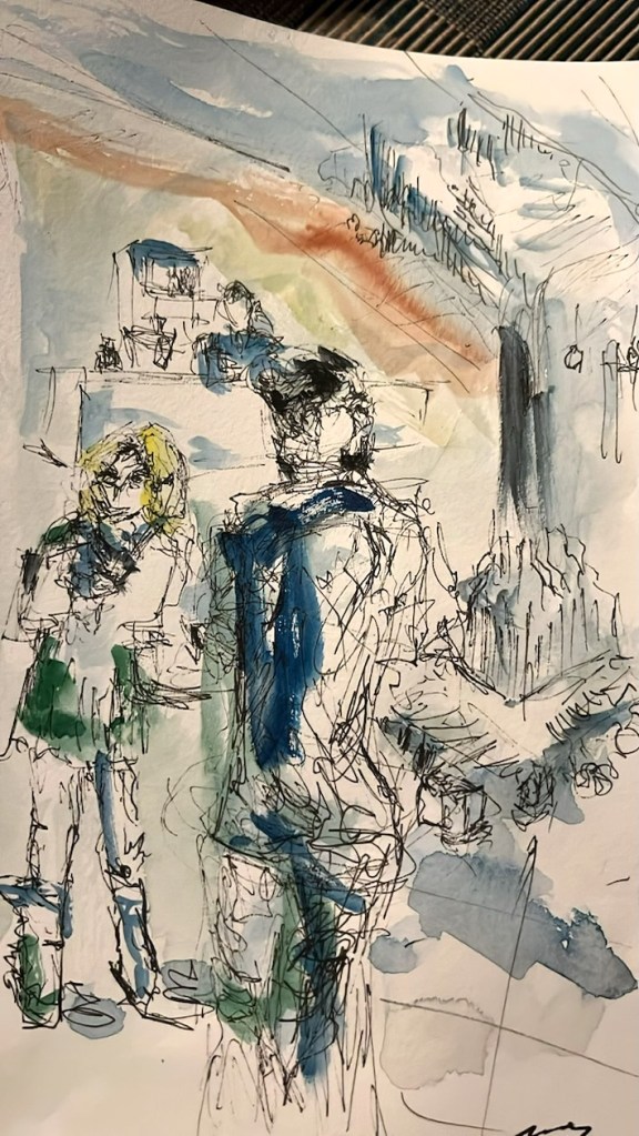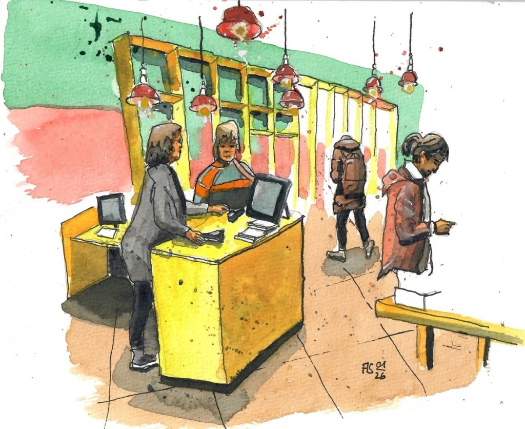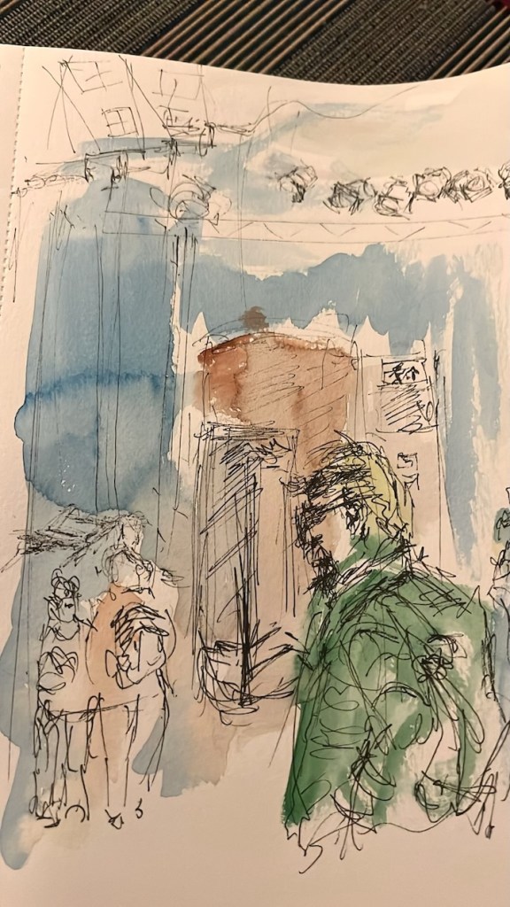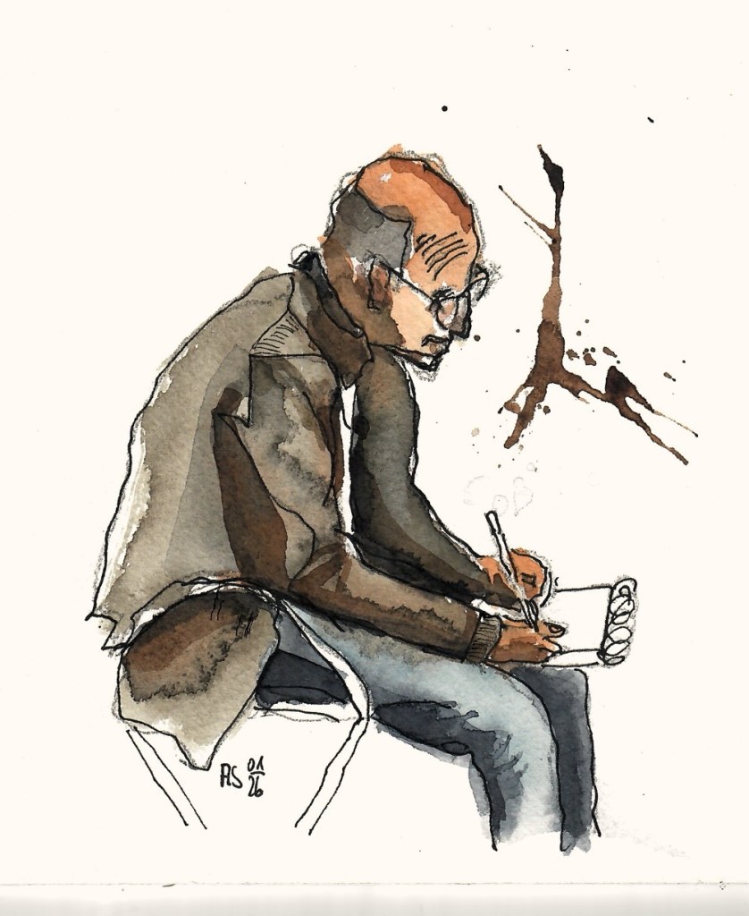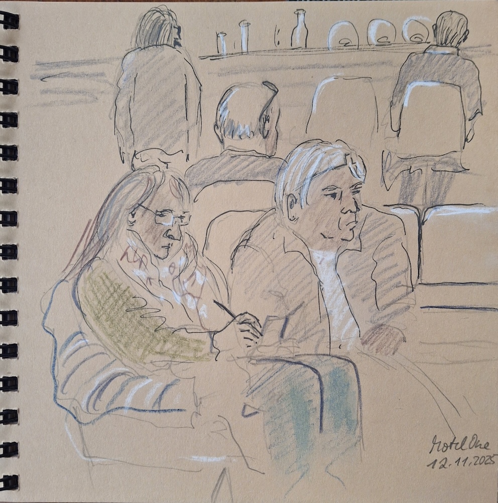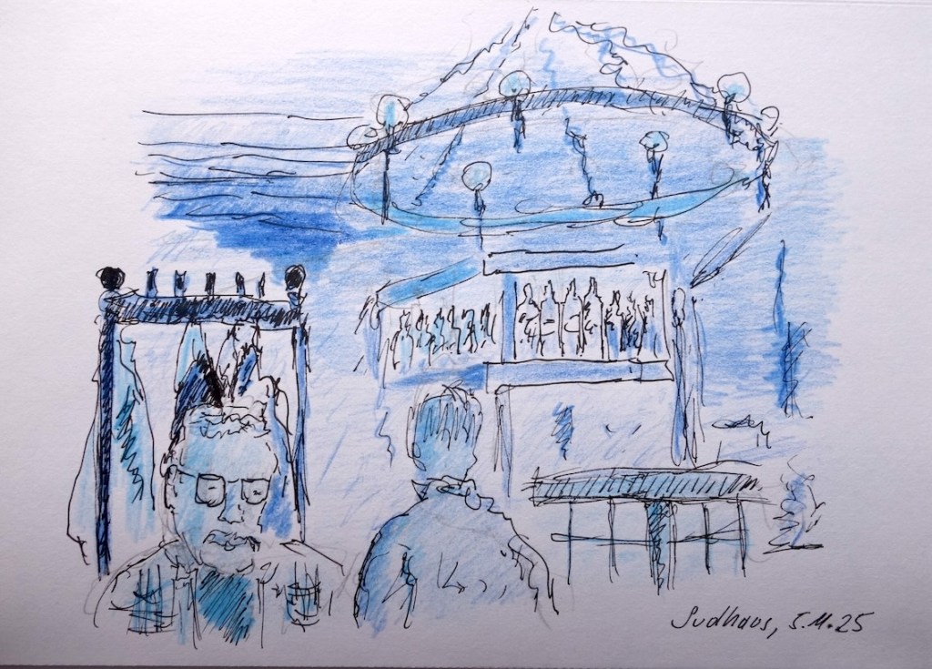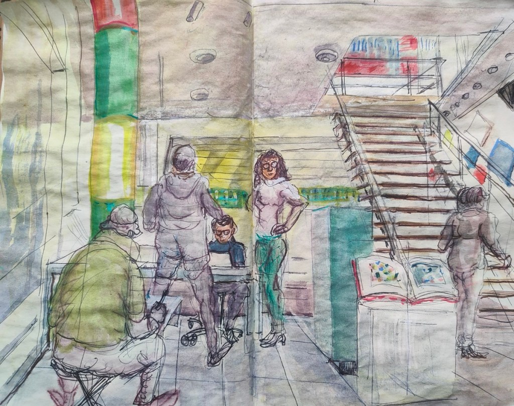 Wir treffen uns am nächsten Mittwoch, dem 19.11.2025, ab 18 Uhr oder früher (die Vernissage machen wir auch etwas früher, siehe unten) im Kaufhof-Galeria-Restaurant. Das Restaurant befindet sich in der 4. Etage, man kommt gut mit der Rolltreppe hin. Es gibt dort viele Sitzmöglichkeiten und sogar einen Blick in den Verkaufsraum. Wem das zu bieder ist, kann sich irgendwo im Kaufhof eine ruhigere Ecke suchen und das Skizzenbuch zücken.
