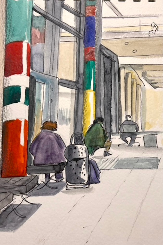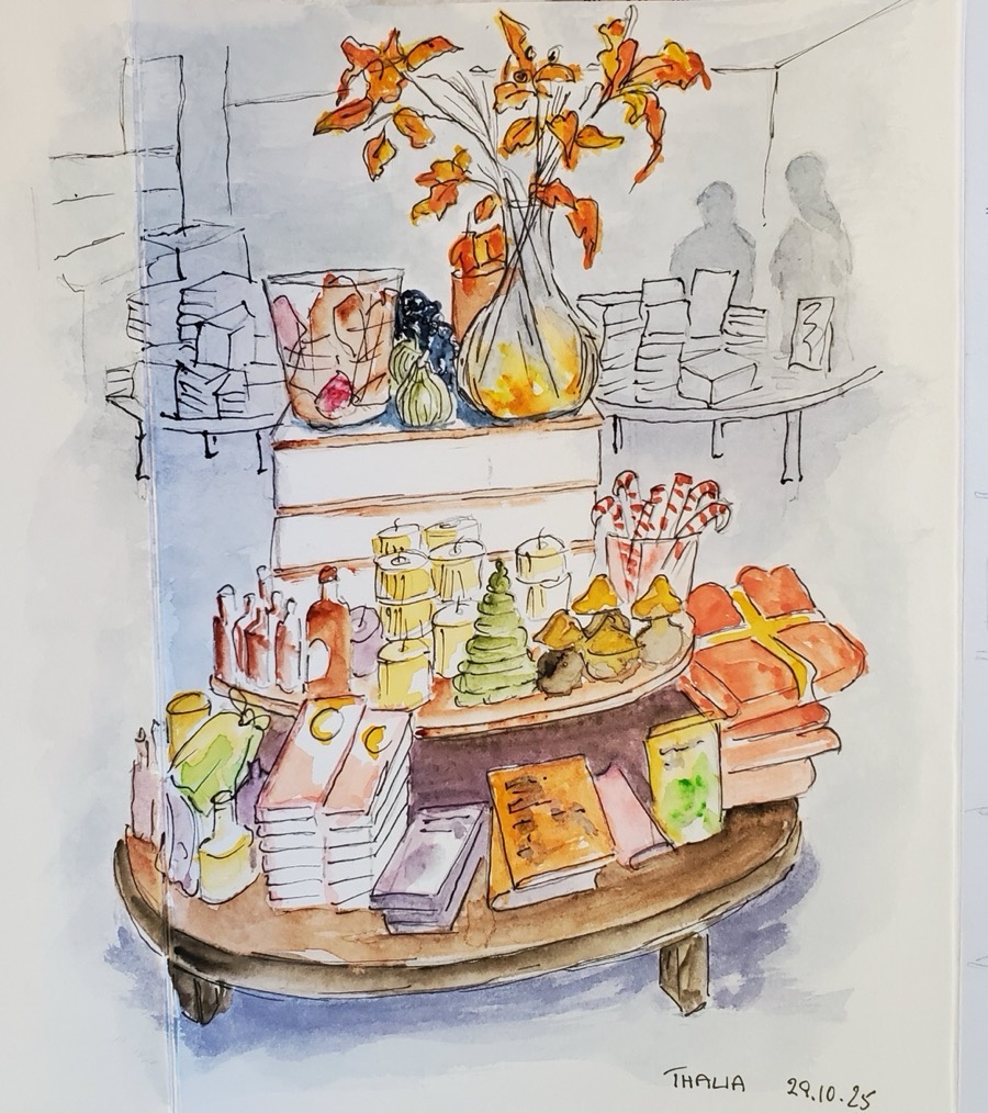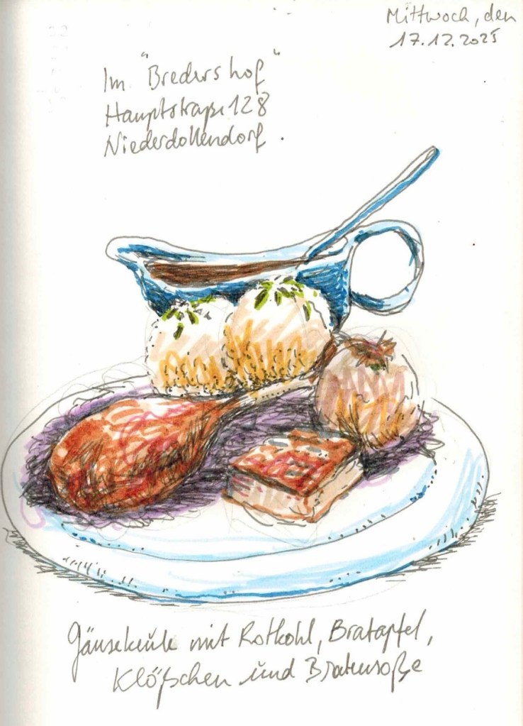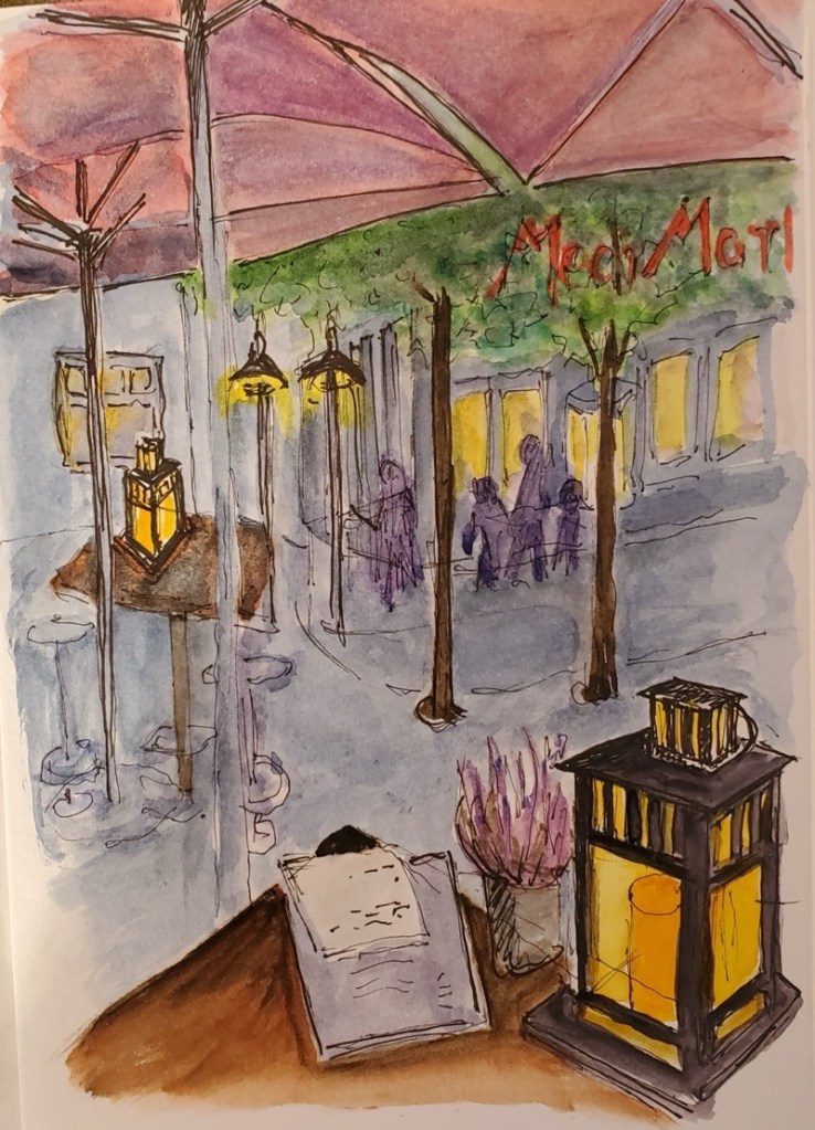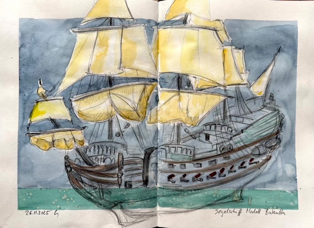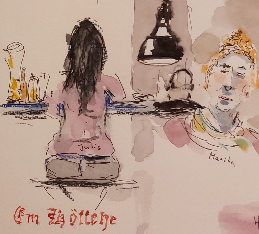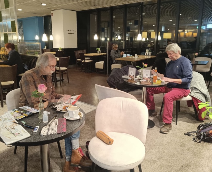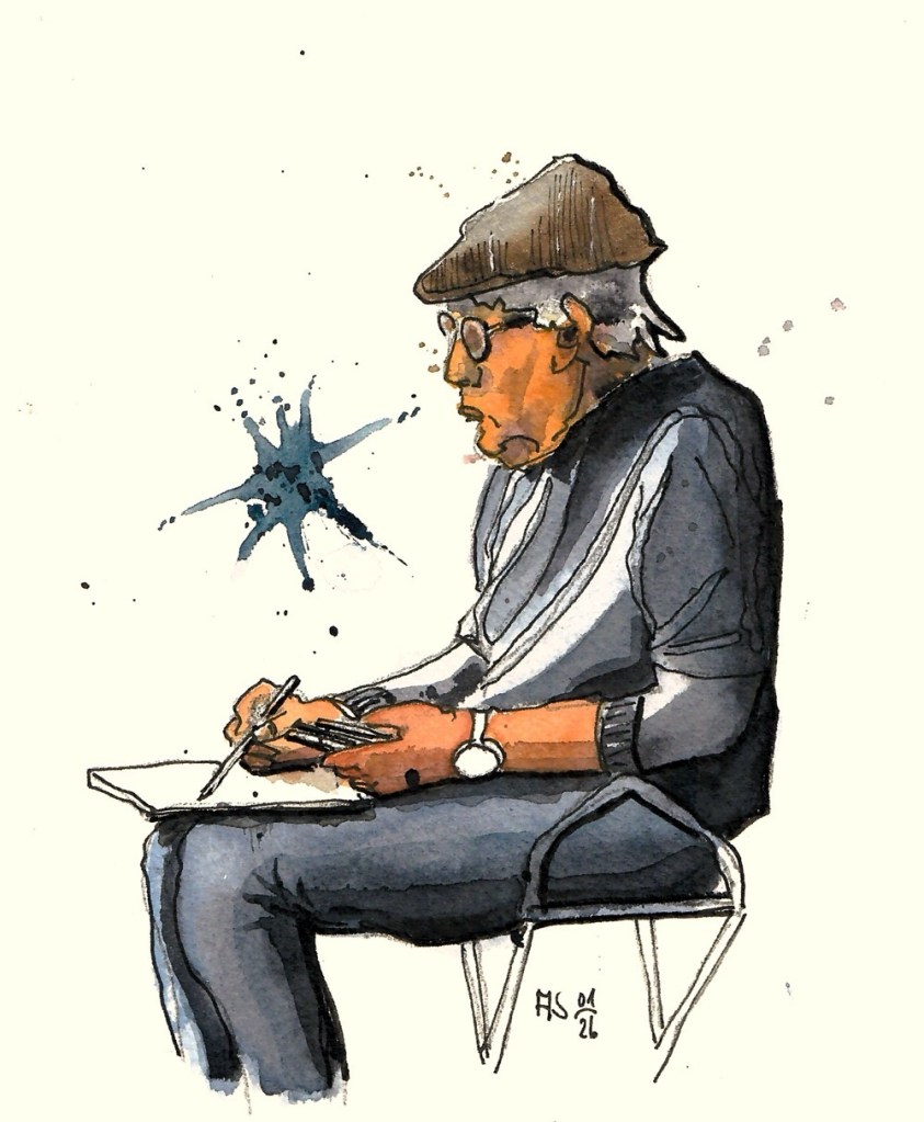 Wir treffen uns am nächsten Mittwoch, dem 19.11.2025, ab 18 Uhr oder früher (die Vernissage machen wir auch etwas früher, siehe unten) im Kaufhof-Galeria-Restaurant. Das Restaurant befindet sich in der 4. Etage, man kommt gut mit der Rolltreppe hin. Es gibt dort viele Sitzmöglichkeiten und sogar einen Blick in den Verkaufsraum. Wem das zu bieder ist, kann sich irgendwo im Kaufhof eine ruhigere Ecke suchen und das Skizzenbuch zücken.