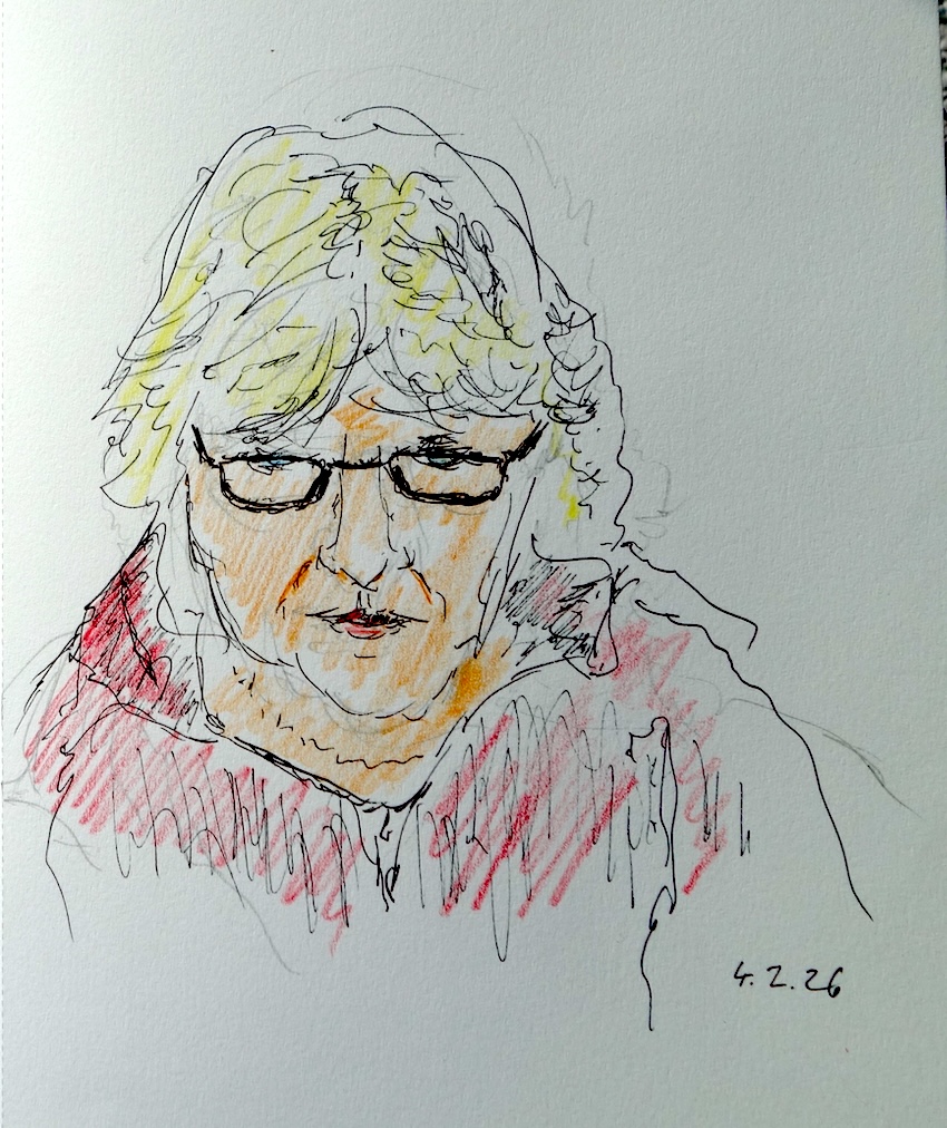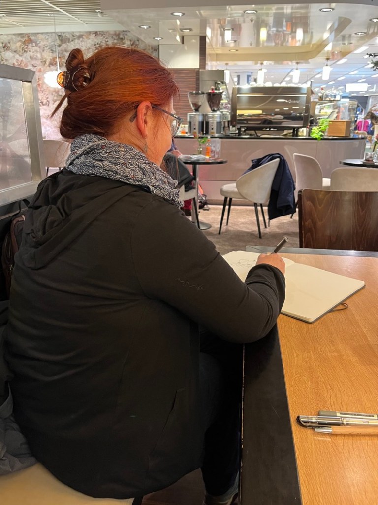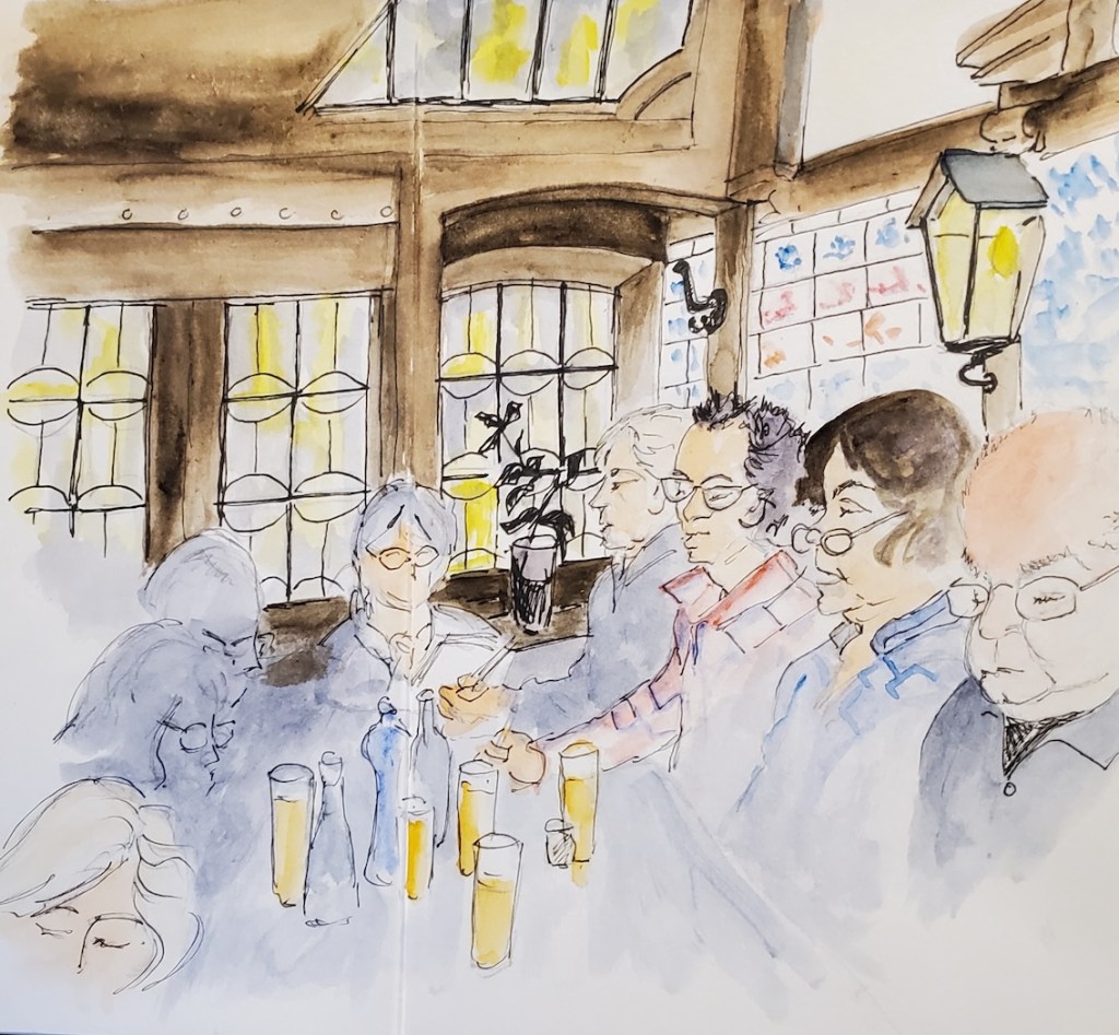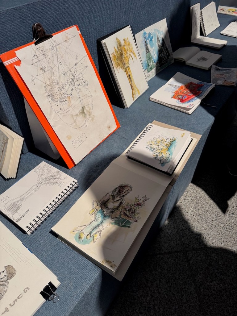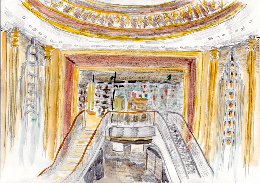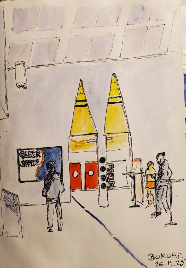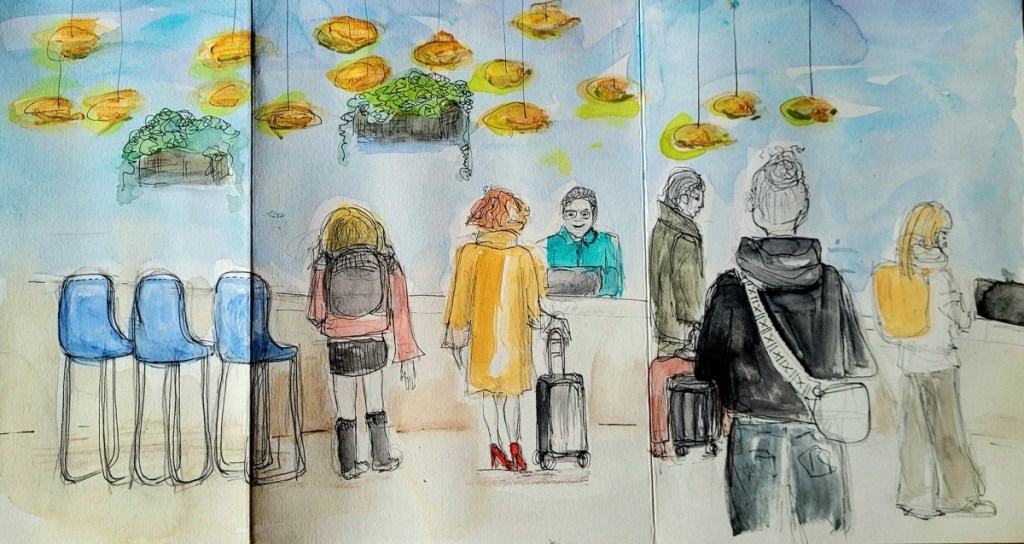Wir treffen uns am nächsten Mittwoch, dem 19.11.2025, ab 18 Uhr oder früher (die Vernissage machen wir auch etwas früher, siehe unten) im Kaufhof-Galeria-Restaurant. Das Restaurant befindet sich in der 4. Etage, man kommt gut mit der Rolltreppe hin. Es gibt dort viele Sitzmöglichkeiten und sogar einen Blick in den Verkaufsraum. Wem das zu bieder ist, kann sich irgendwo im Kaufhof eine ruhigere Ecke suchen und das Skizzenbuch zücken.