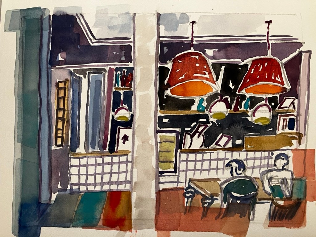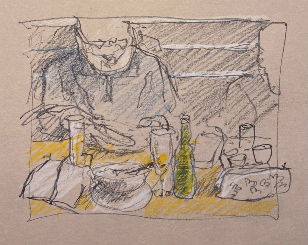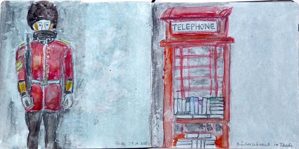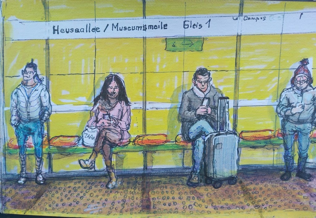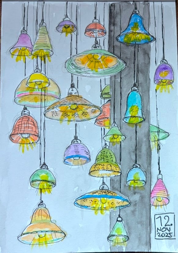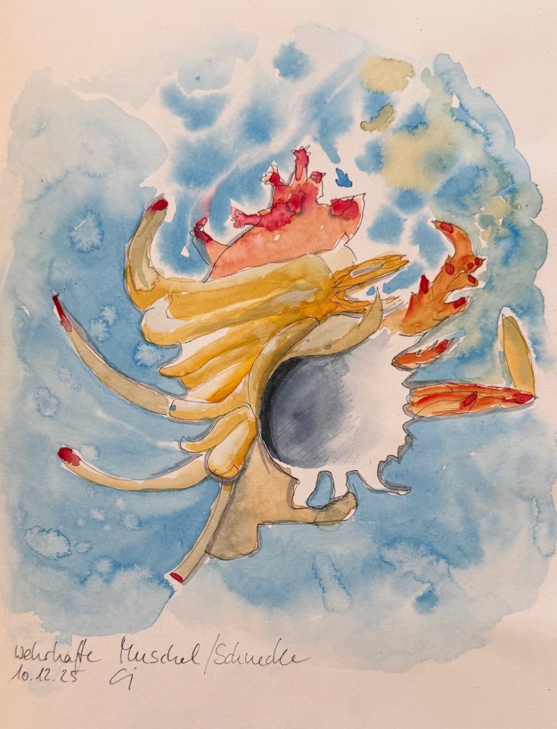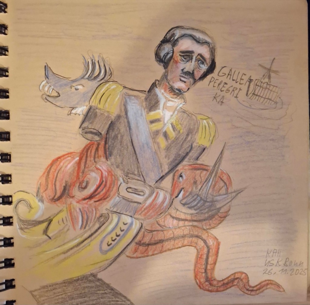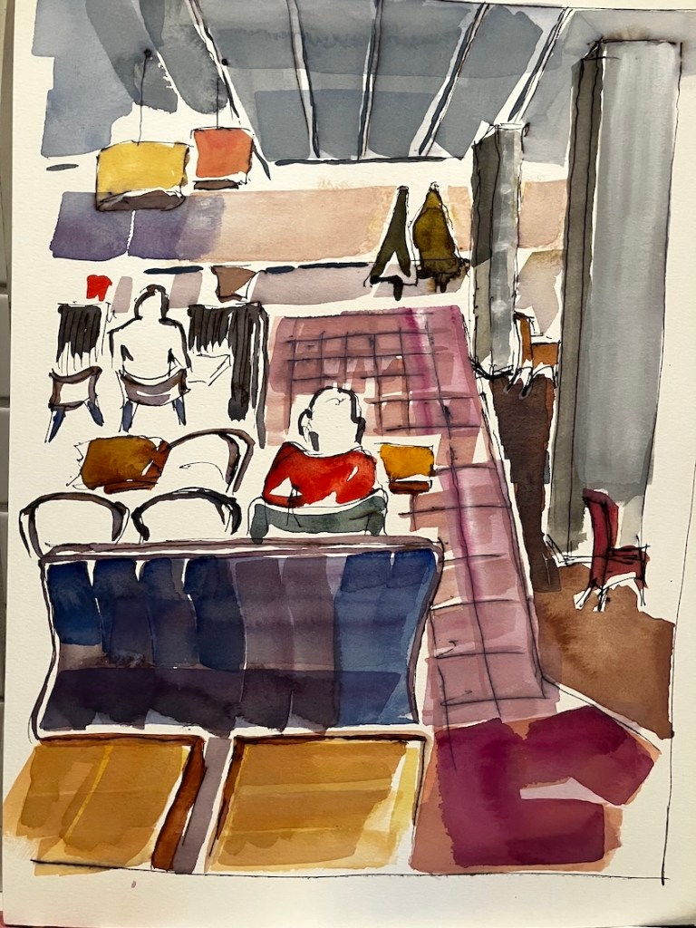 Wir treffen uns am nächsten Mittwoch, dem 19.11.2025, ab 18 Uhr oder früher (die Vernissage machen wir auch etwas früher, siehe unten) im Kaufhof-Galeria-Restaurant. Das Restaurant befindet sich in der 4. Etage, man kommt gut mit der Rolltreppe hin. Es gibt dort viele Sitzmöglichkeiten und sogar einen Blick in den Verkaufsraum. Wem das zu bieder ist, kann sich irgendwo im Kaufhof eine ruhigere Ecke suchen und das Skizzenbuch zücken.