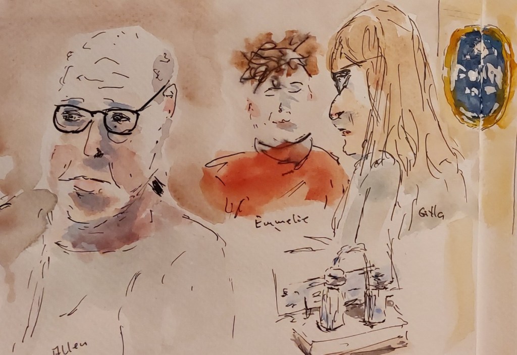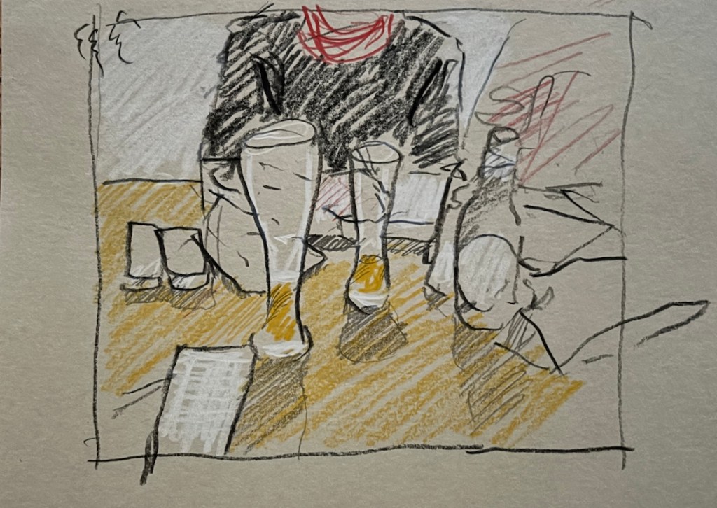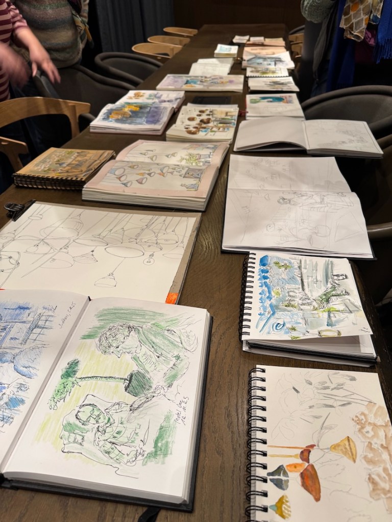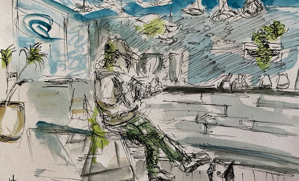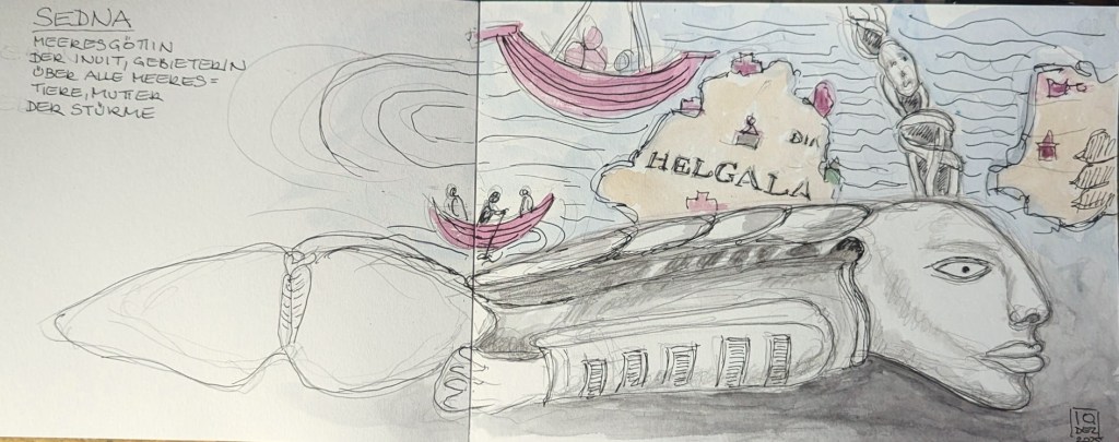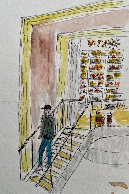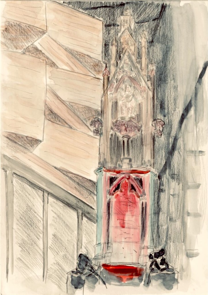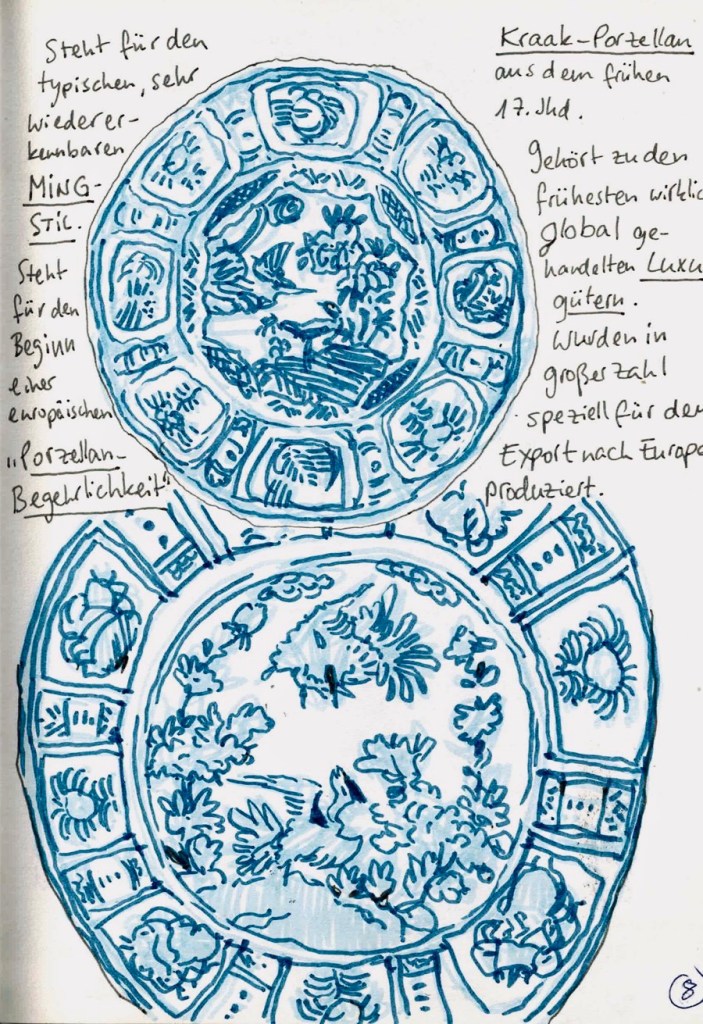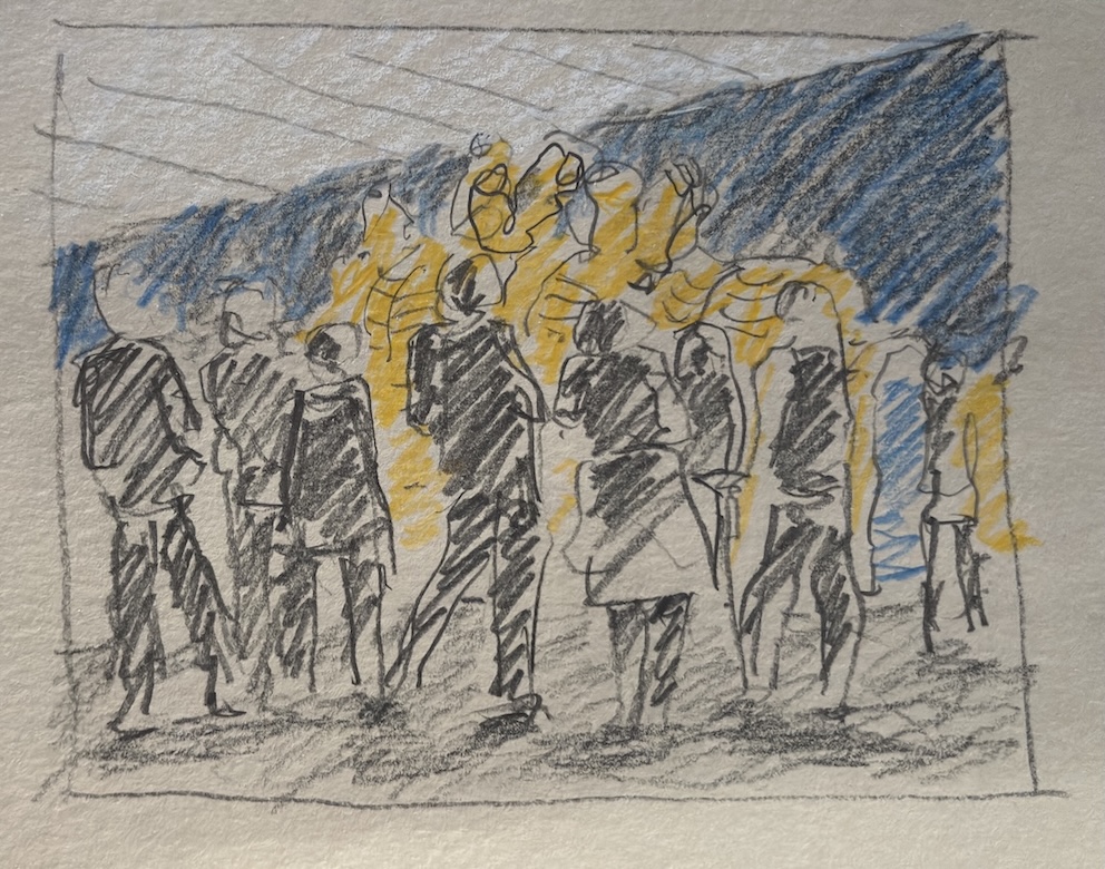Wir treffen uns am nächsten Mittwoch, dem 19.11.2025, ab 18 Uhr oder früher (die Vernissage machen wir auch etwas früher, siehe unten) im Kaufhof-Galeria-Restaurant. Das Restaurant befindet sich in der 4. Etage, man kommt gut mit der Rolltreppe hin. Es gibt dort viele Sitzmöglichkeiten und sogar einen Blick in den Verkaufsraum. Wem das zu bieder ist, kann sich irgendwo im Kaufhof eine ruhigere Ecke suchen und das Skizzenbuch zücken.