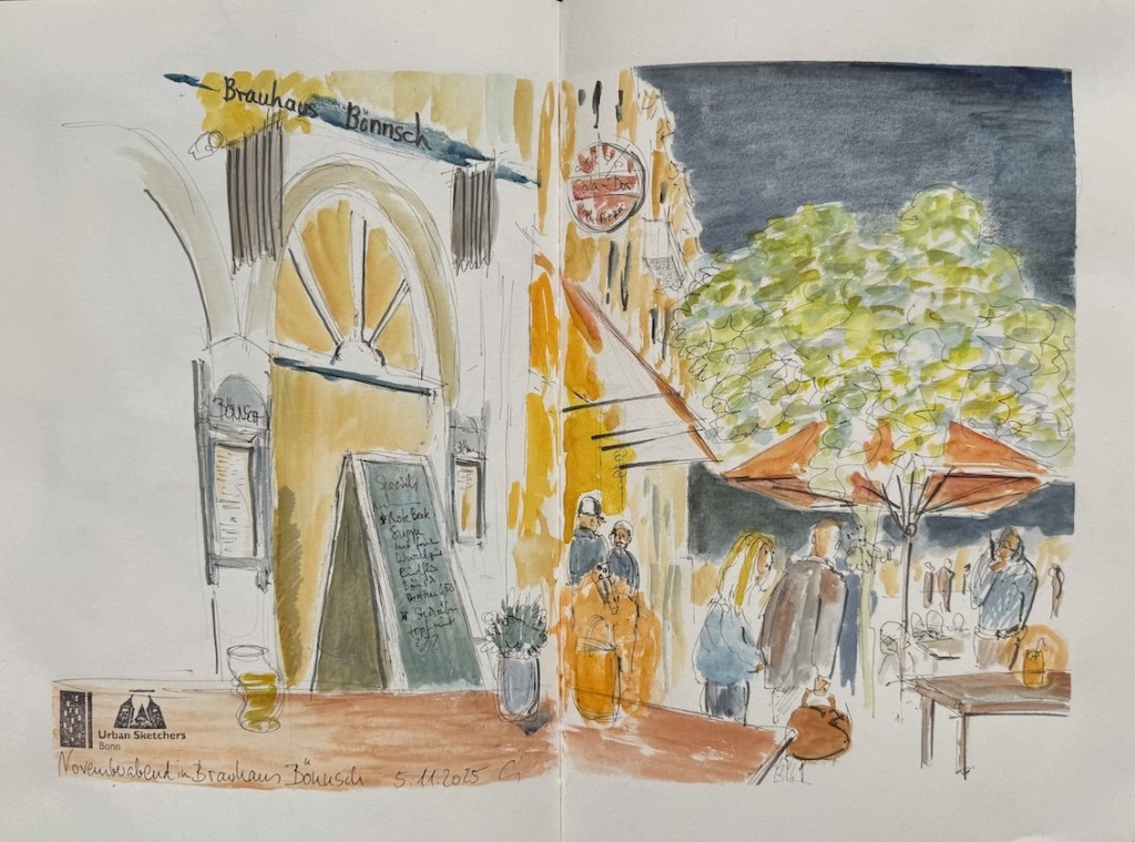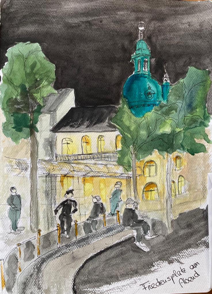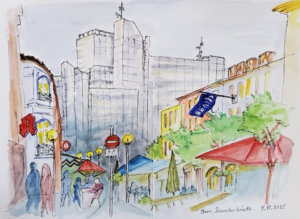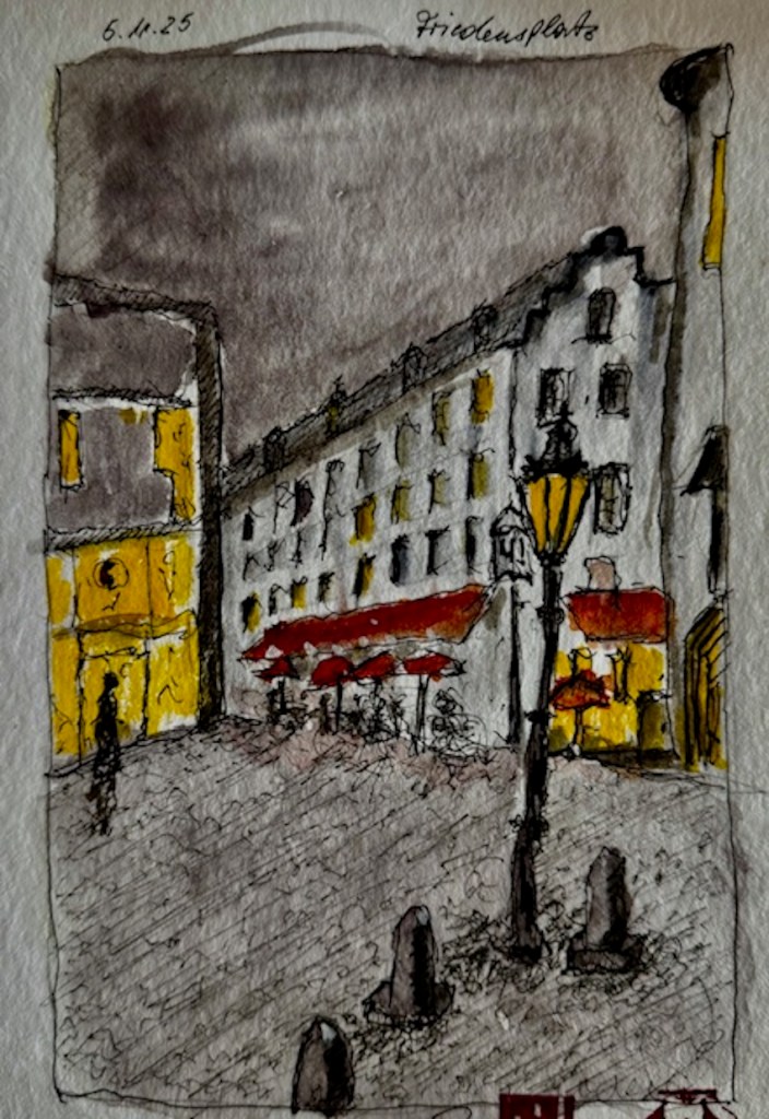 Nächsten Mittwoch, den 05.11.2025, treffen wir uns ab 18 Uhr auf dem Friedensplatz Bonn Innenstadt. Dort ist es trubelig und bunt; wir können Busse an- und abfahren sehen, Passanten, Tauben, sonstigen Lebewesen beobachten oder ganz einfach die Umgebung in der Dämmerung zeichnen. Einige Lokale bieten Außensitzplätze an (das Backwerk, Pendel, Sudhaus, Frittenwerk und McDonalds; das Lokal Elefant mit Außenbereich ist auch nur eine Straße weiter). Und dabei können wir den hoffentlich milden Novemberabend genießen, trocken soll es auf jeden Fall bleiben.
