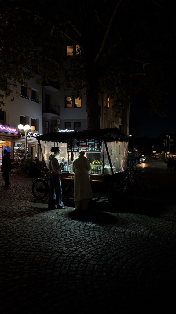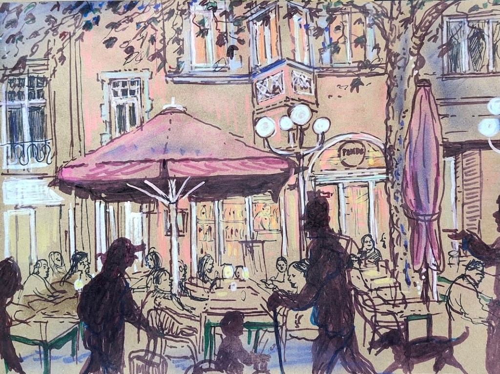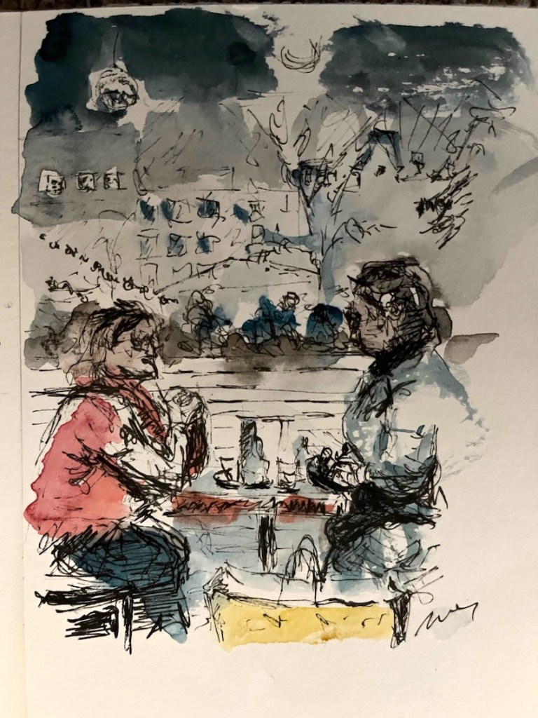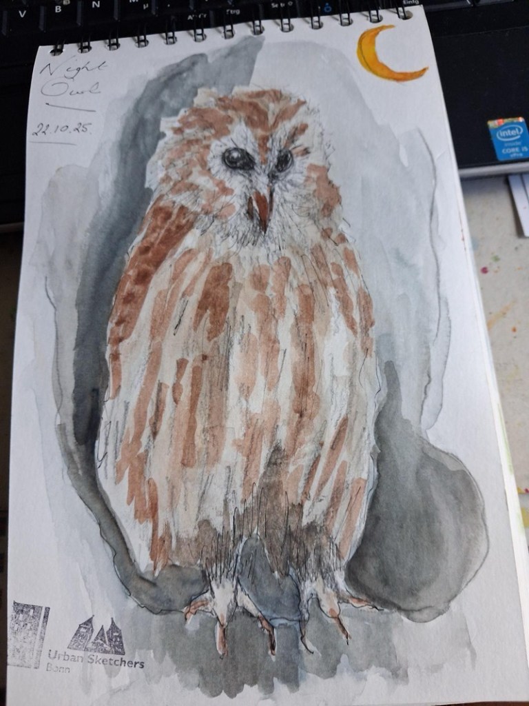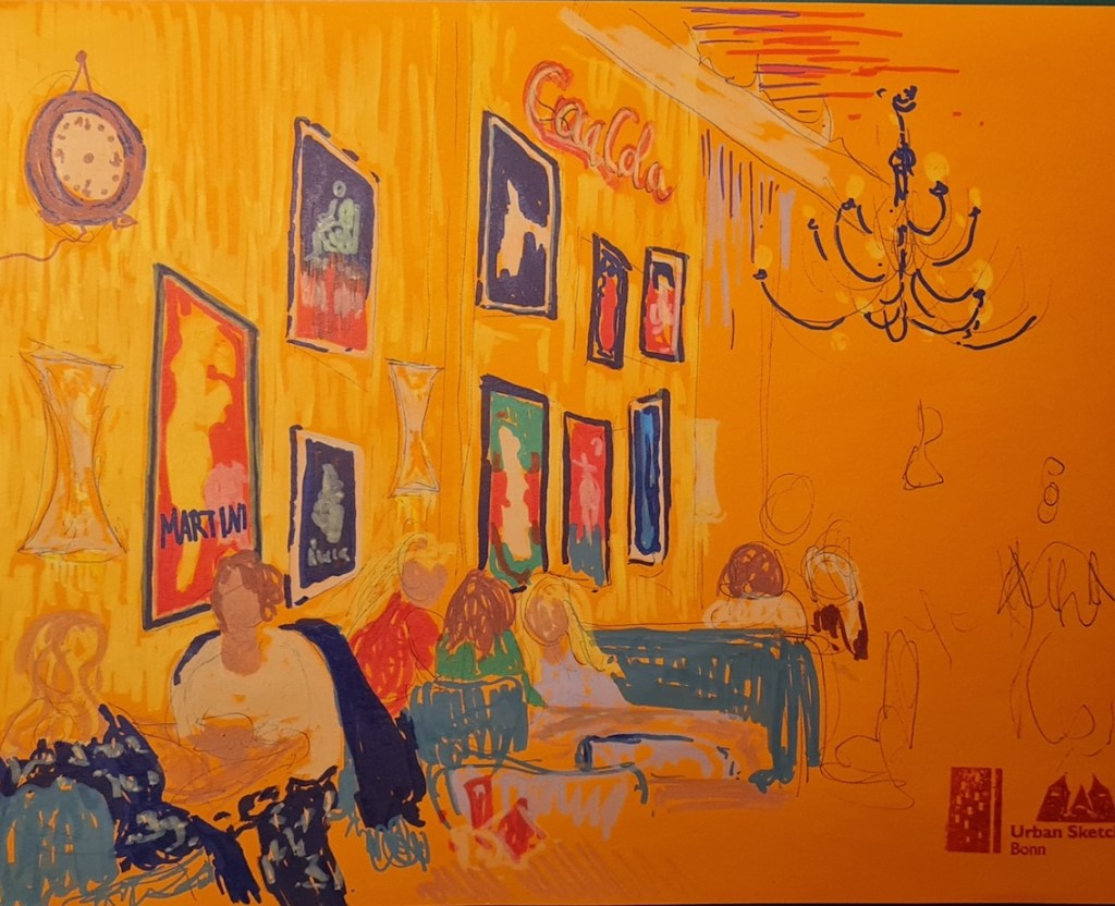 Nächsten Mittwoch, den 05.11.2025, treffen wir uns ab 18 Uhr auf dem Friedensplatz Bonn Innenstadt. Dort ist es trubelig und bunt; wir können Busse an- und abfahren sehen, Passanten, Tauben, sonstigen Lebewesen beobachten oder ganz einfach die Umgebung in der Dämmerung zeichnen. Einige Lokale bieten Außensitzplätze an (das Backwerk, Pendel, Sudhaus, Frittenwerk und McDonalds; das Lokal Elefant mit Außenbereich ist auch nur eine Straße weiter). Und dabei können wir den hoffentlich milden Novemberabend genießen, trocken soll es auf jeden Fall bleiben.