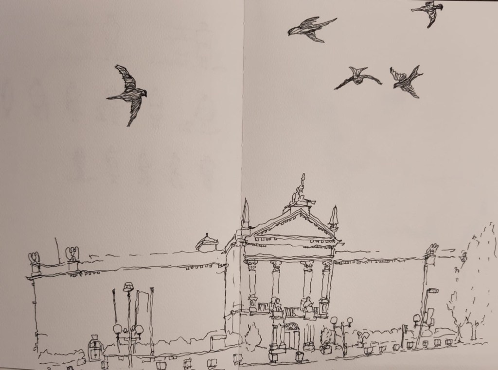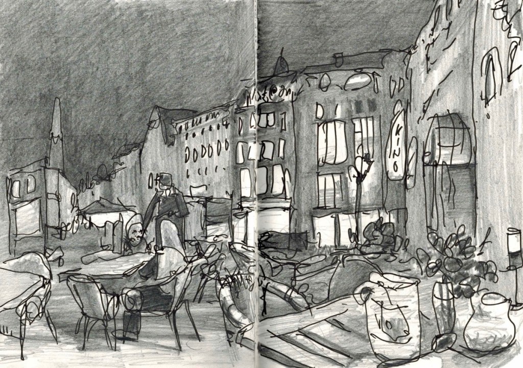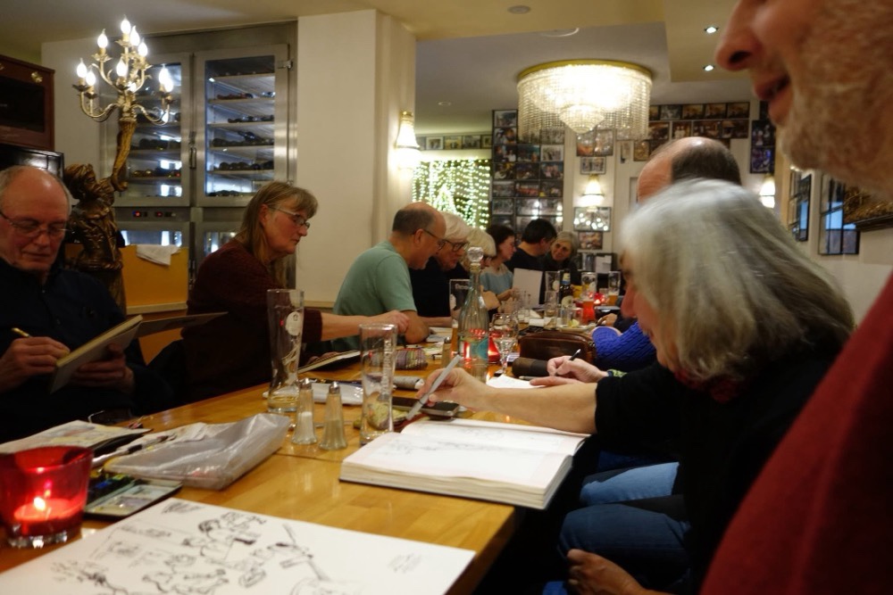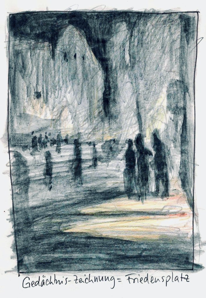 Ja, er war mild, dieser Novemberabend! Tatsächlich sind einige Zeichner draussen gesessen, andere zumindest einen Teil der Zeit, um dann den letzten Schliff an den Skizzen noch im Pendel oder im Sudhaus zu machen. Hier unsere Zeichnungen vom Friedensplatz: