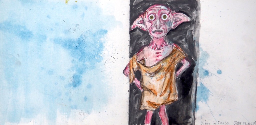 Gitta – Dobby im Thalia Angelika – Dobby im Thalia Gitta – bewachter Bücherschrank im Thalia Angelika – the crimes of Grindelwald im Thalia Tina – Kaffeestimmung bei Thalia Benedikt – Abends im Café, bei Thalia