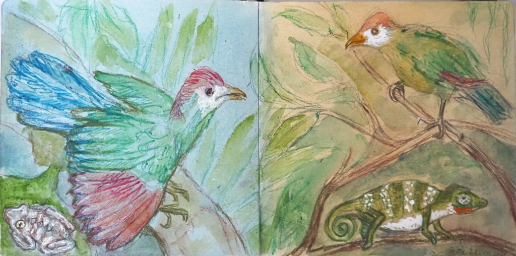 Gitta – im Dschungel: ein Waldsteigerfrosch, 2 Rothauben-Turakos und ein Owens Dreihornchamäleon