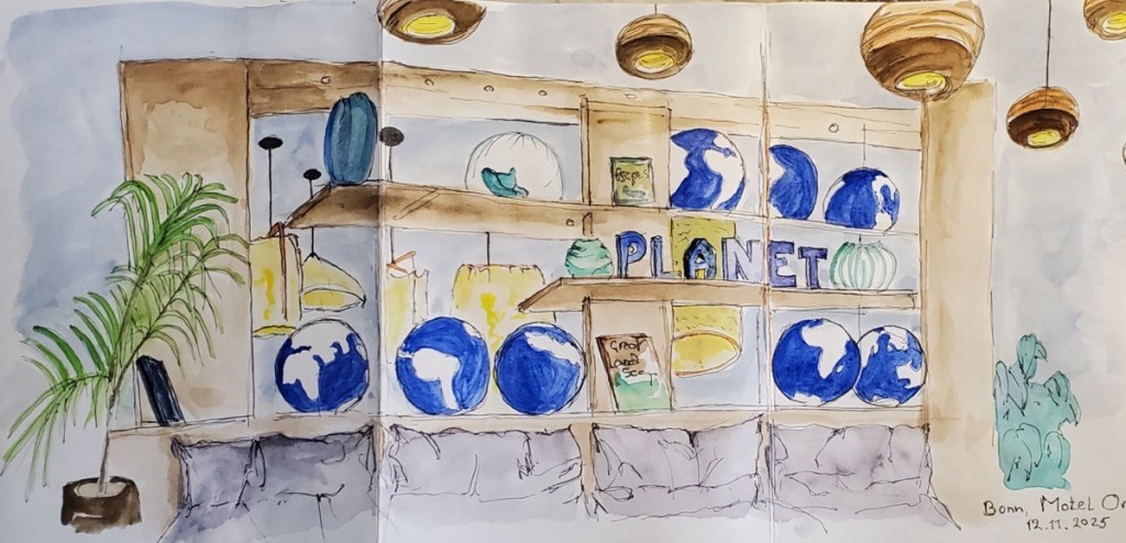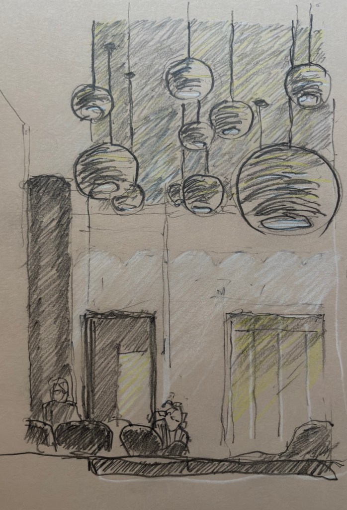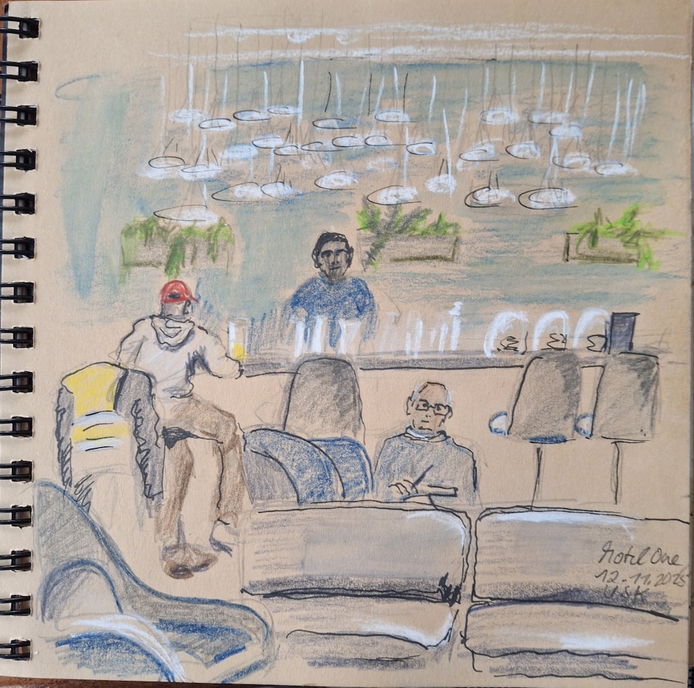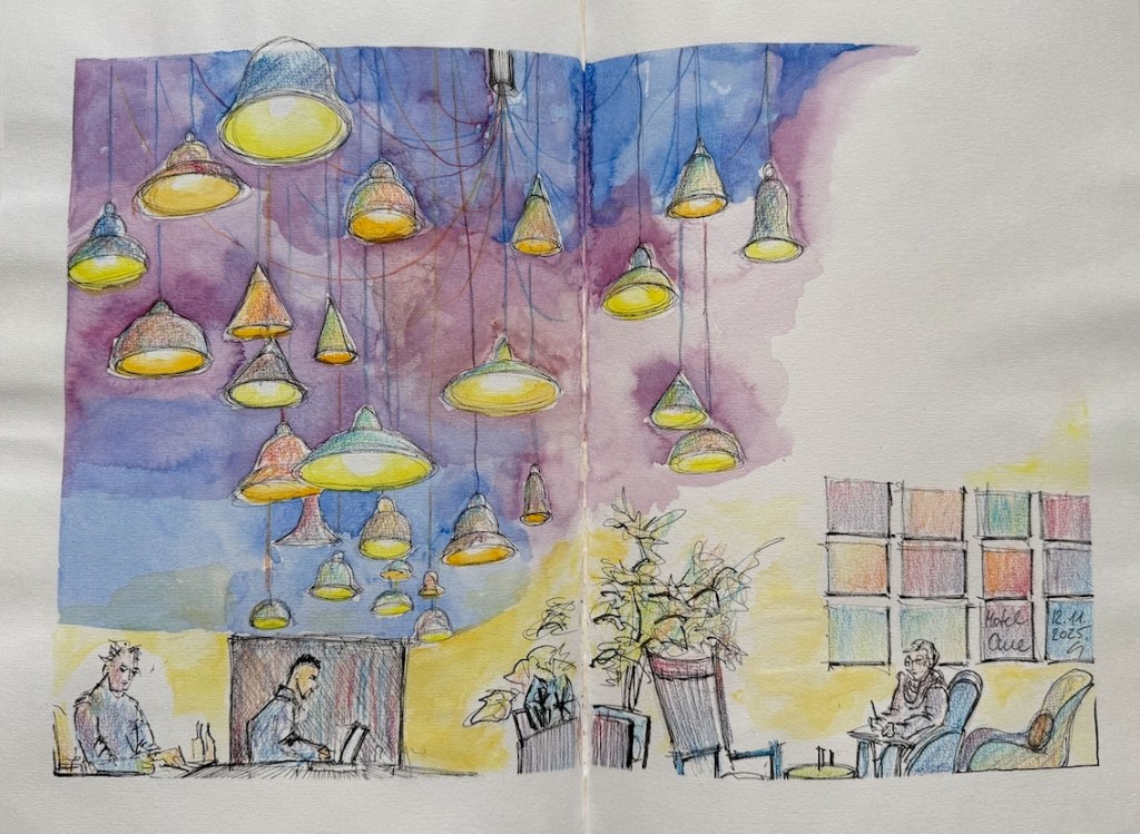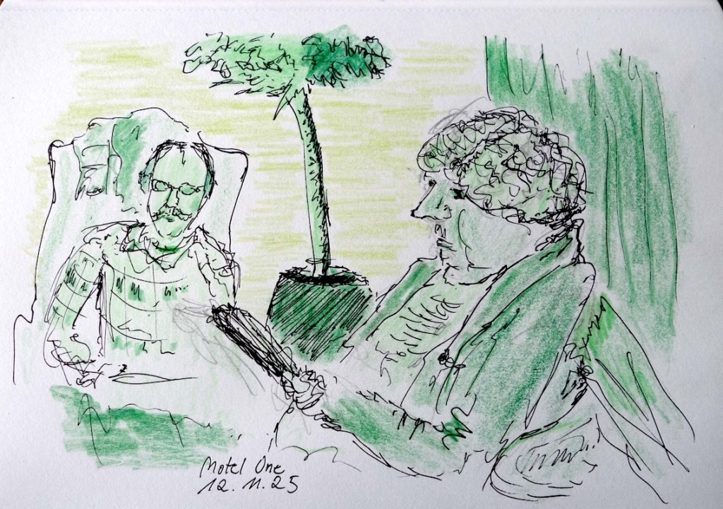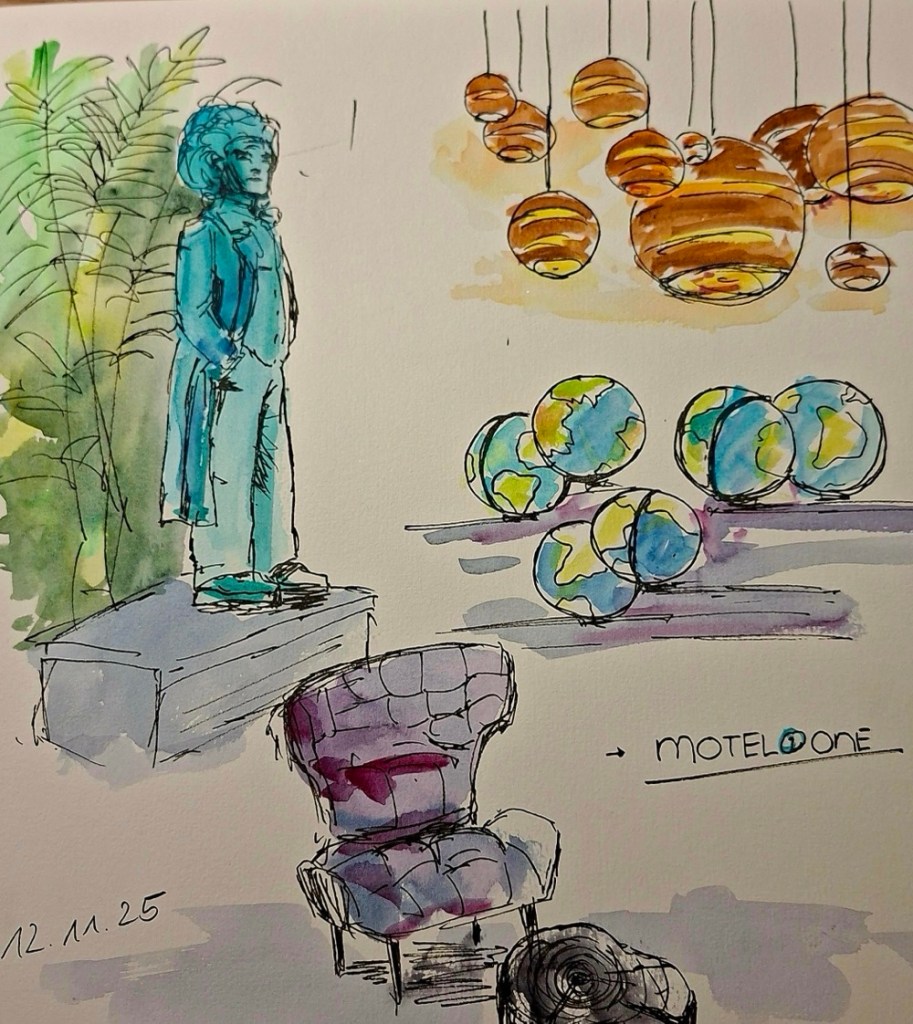 Wir treffen uns am nächsten Mittwoch, dem 12.11.2025, bereits um 17:30 Uhr im Motel One neben dem Hauptbahnhof; der Eingang ist von der Seite der Maximilianstraße, von dem Platz aus. Das Foyer oder die Lounge ist sehr ansprechend und vielseitig gestaltet; es gibt Ecken und Sitzmöglichkeiten mit Holz oder Plüsch, mit oder ohne Tisch und fast so viele Lampentypen wie in einem Laden! Getränke und kleine Snacks kann man an der Bar erwerben; es kommt aber auch Bedienung zum Platz. Die Urban Sketchers sind willkommen und angemeldet und so können wir in dieser angenehmen Atmosphäre zeichnen, was uns vor den Stift kommt.