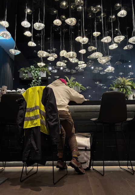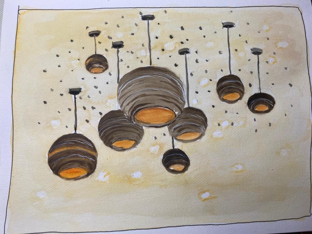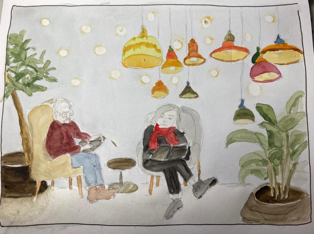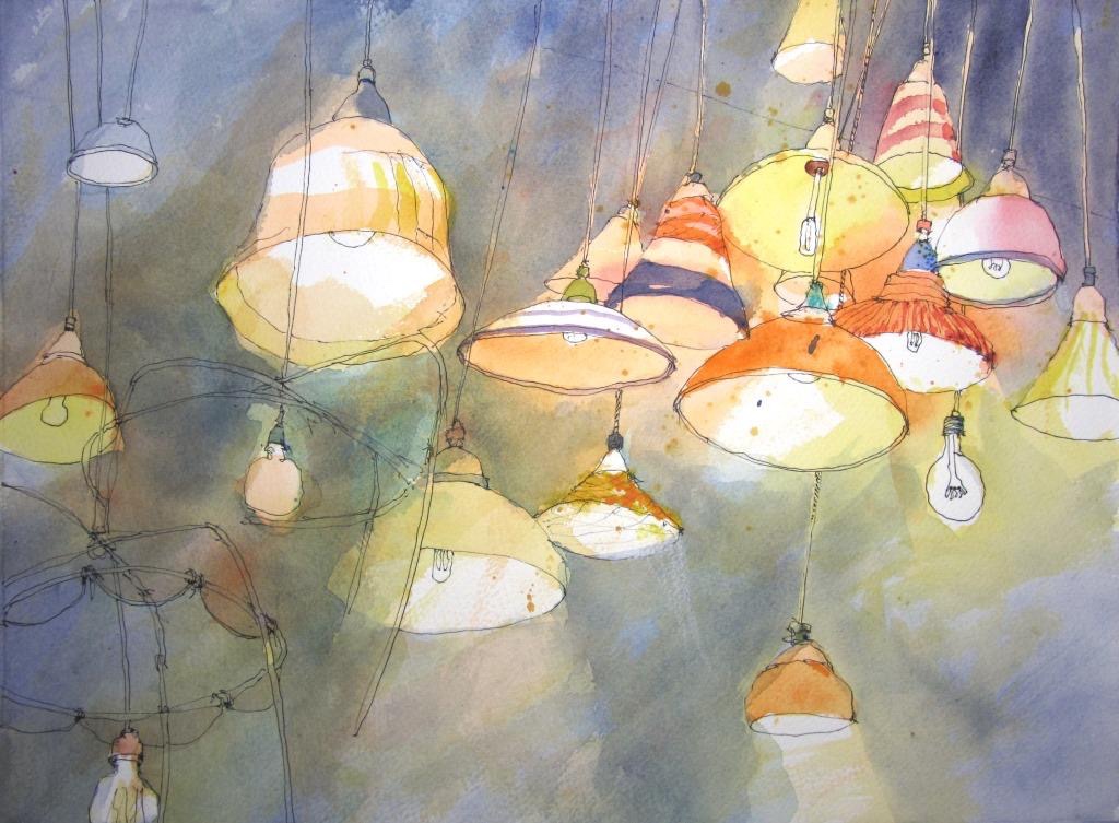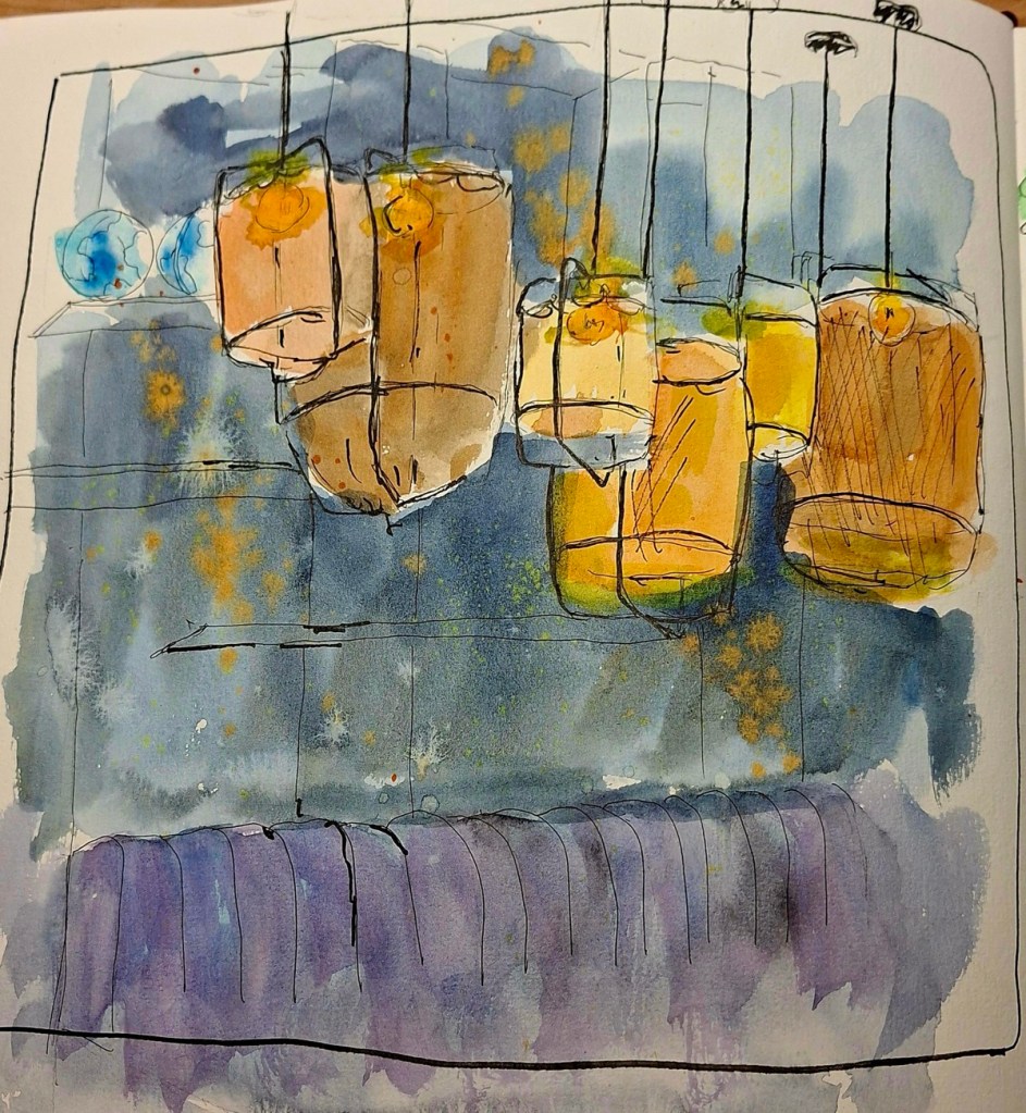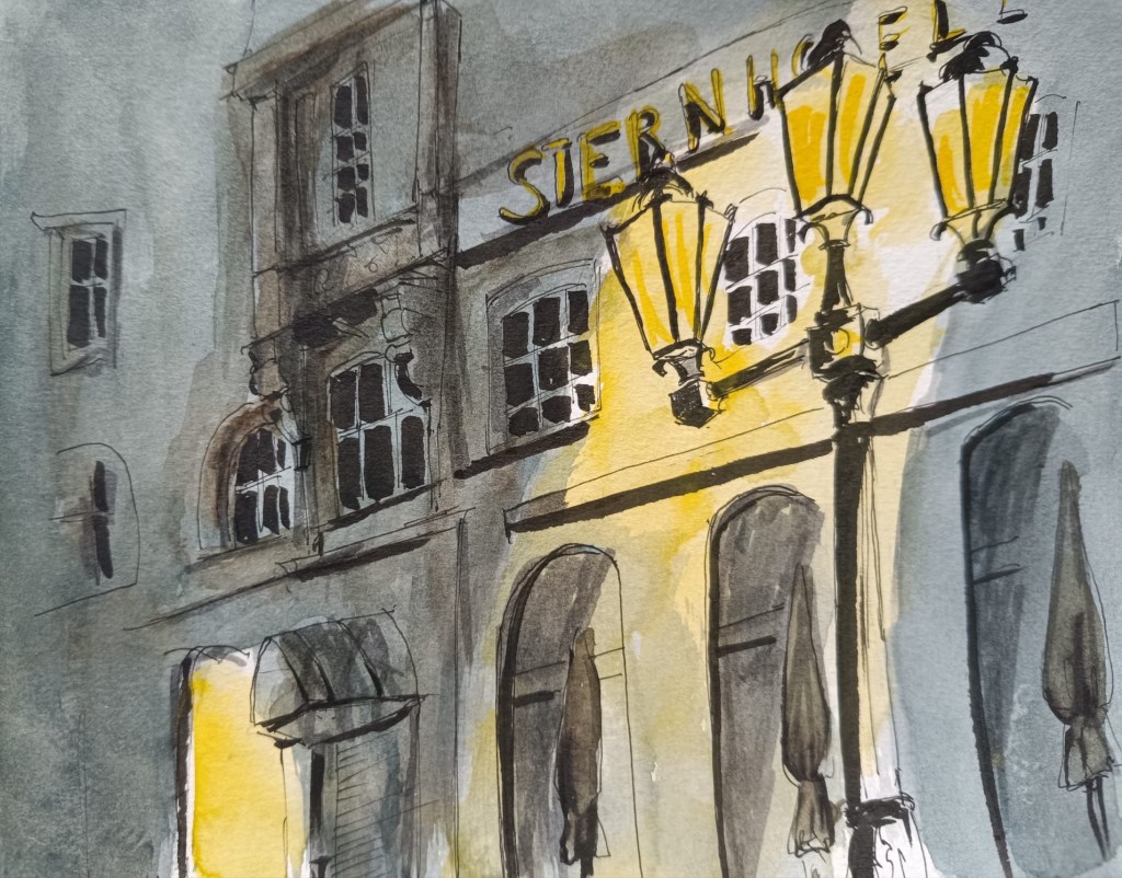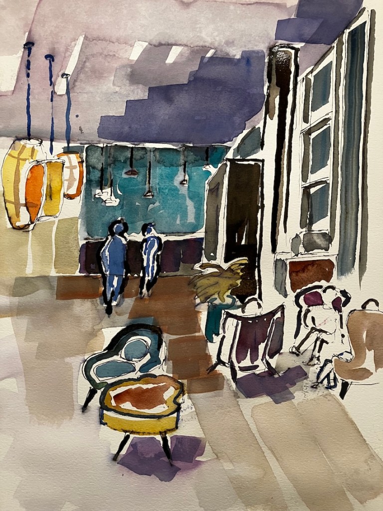 Wir treffen uns am nächsten Mittwoch, dem 12.11.2025, bereits um 17:30 Uhr im Motel One neben dem Hauptbahnhof; der Eingang ist von der Seite der Maximilianstraße, von dem Platz aus. Das Foyer oder die Lounge ist sehr ansprechend und vielseitig gestaltet; es gibt Ecken und Sitzmöglichkeiten mit Holz oder Plüsch, mit oder ohne Tisch und fast so viele Lampentypen wie in einem Laden! Getränke und kleine Snacks kann man an der Bar erwerben; es kommt aber auch Bedienung zum Platz. Die Urban Sketchers sind willkommen und angemeldet und so können wir in dieser angenehmen Atmosphäre zeichnen, was uns vor den Stift kommt.
