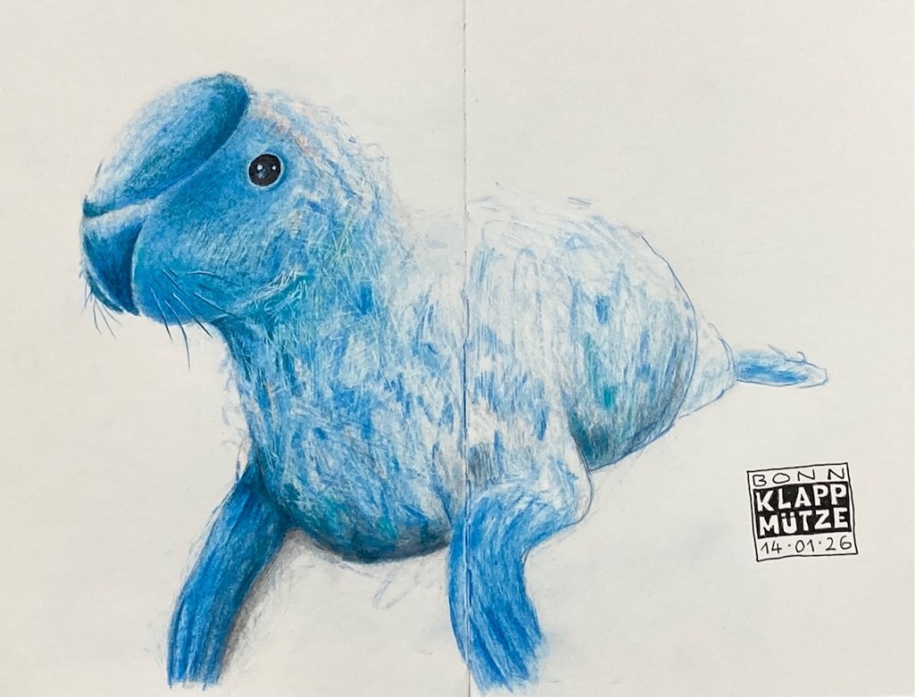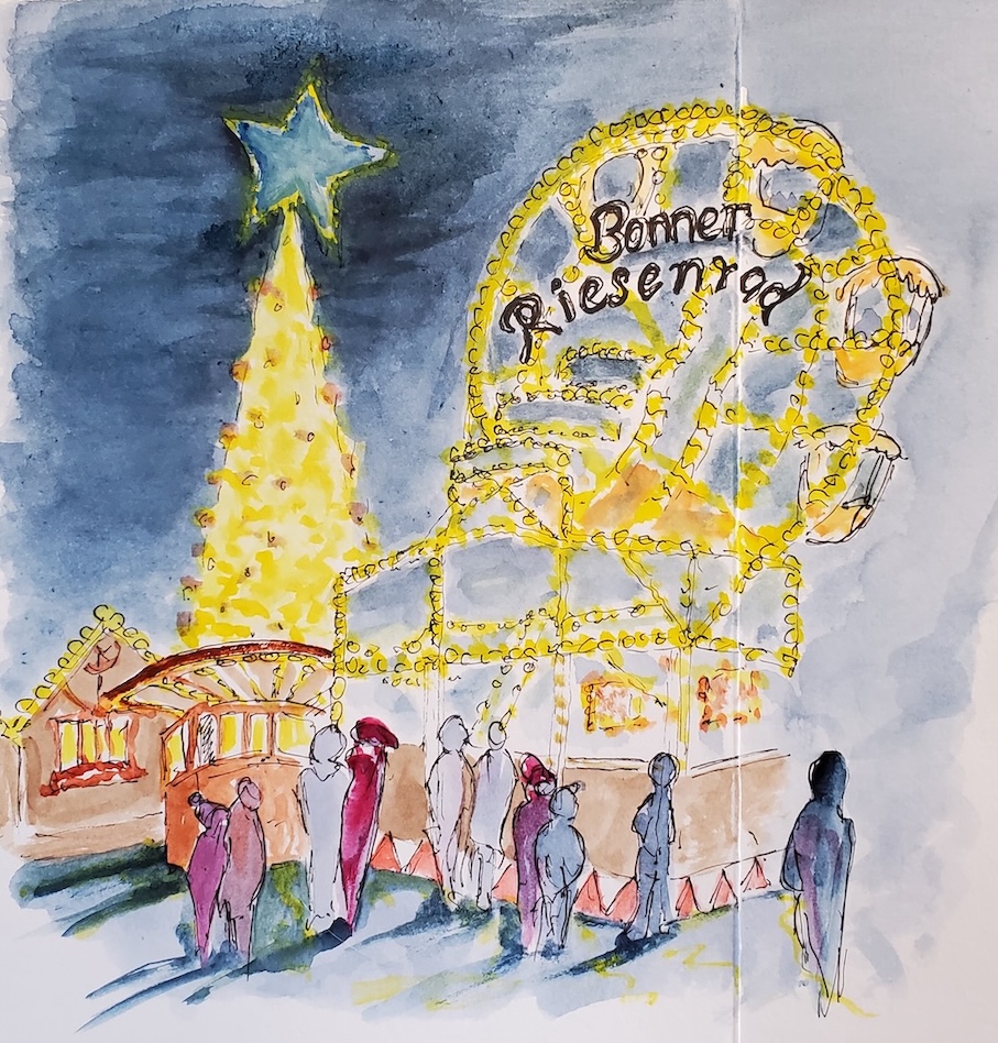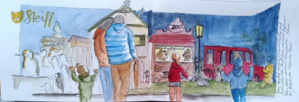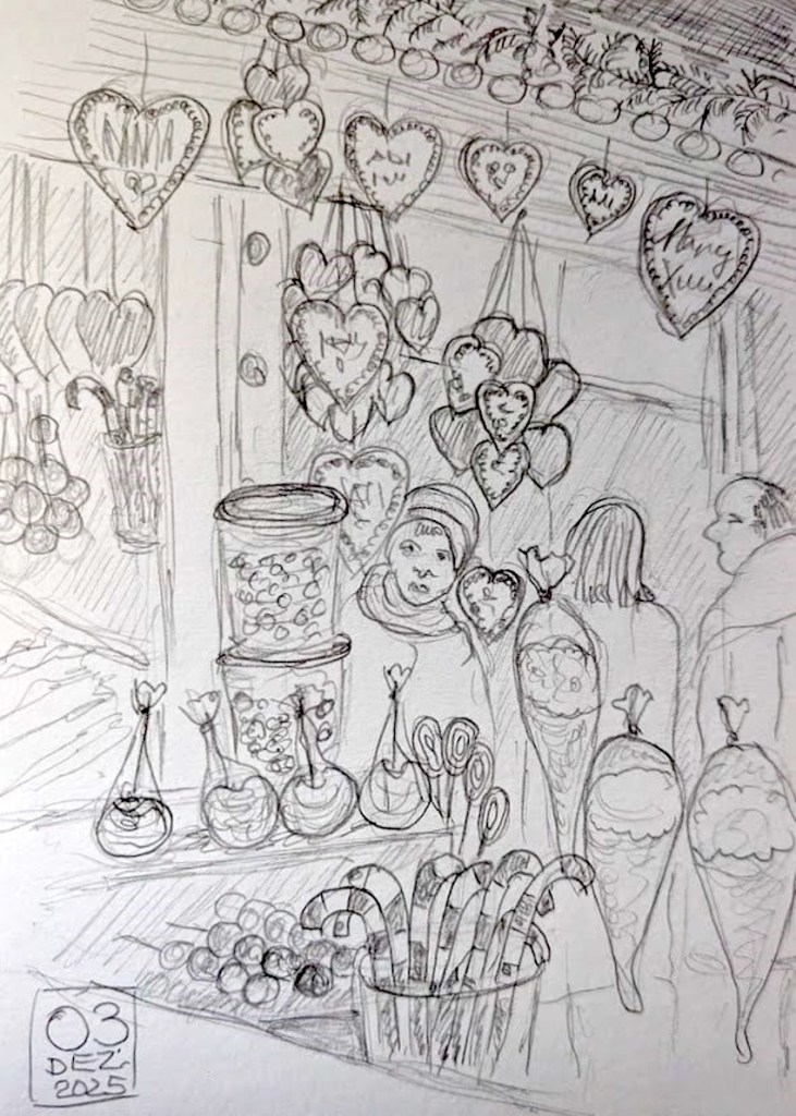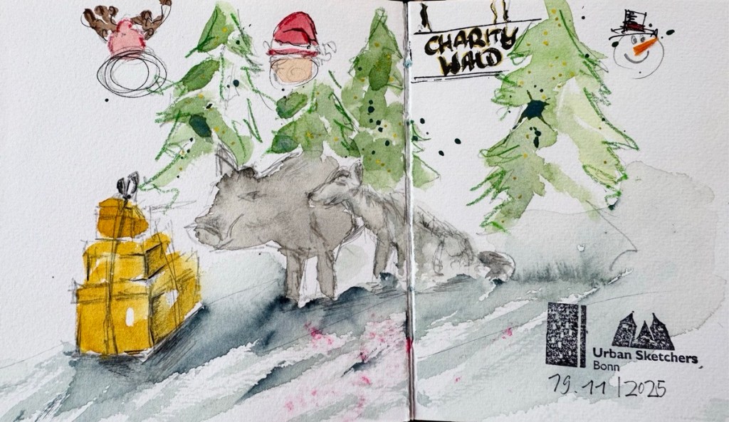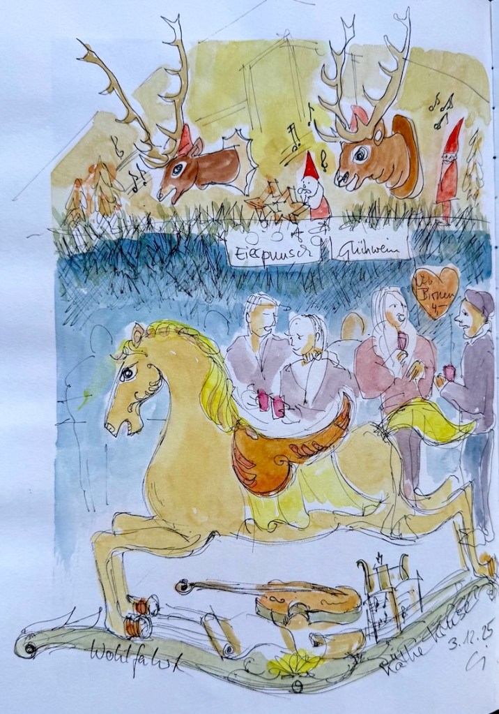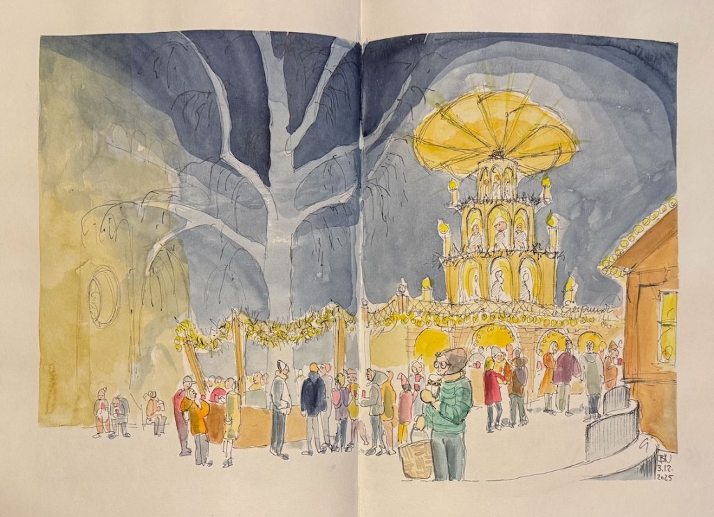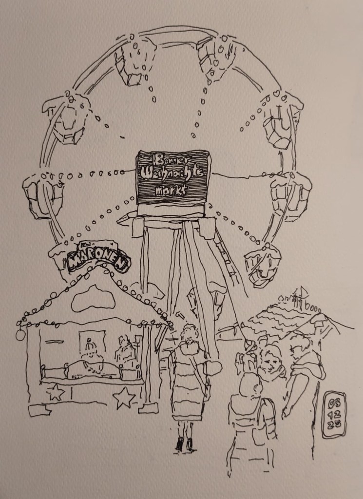 Am nächsten Mittwoch, dem 3.12.2025, treffen wir uns ab 17:30 Uhr auf dem Weihnachtsmarkt in der Bonner Innenstadt zum Zeichnen, Schwerpunkt auf dem Münsterplatz. Treffen werden wir uns sicher eher zufällig, denn erst mal zieht jeder los und schaut, was als Motiv gefällt und wo man sich aufhalten kann. Lichterzauber, Budenschmuck, Menschenmenge… Auch ein Besuch des Bonner Münsters ist möglich oder ein Aufenthalt in einem Café mit Blick auf das vorweihnachtliche Treiben. Zur Vernissage treffen wir uns dann wieder vor dem Schaufenster mit den Steifftieren bei Galeria Kaufhof um 19:00 Uhr.