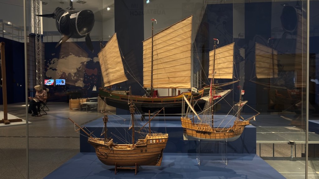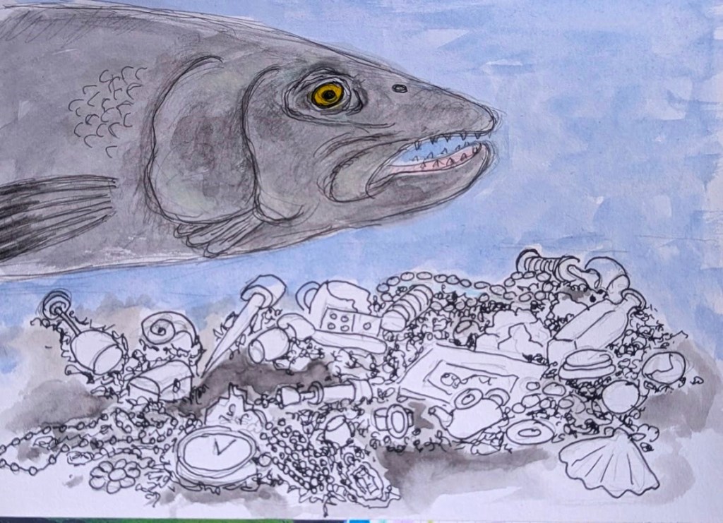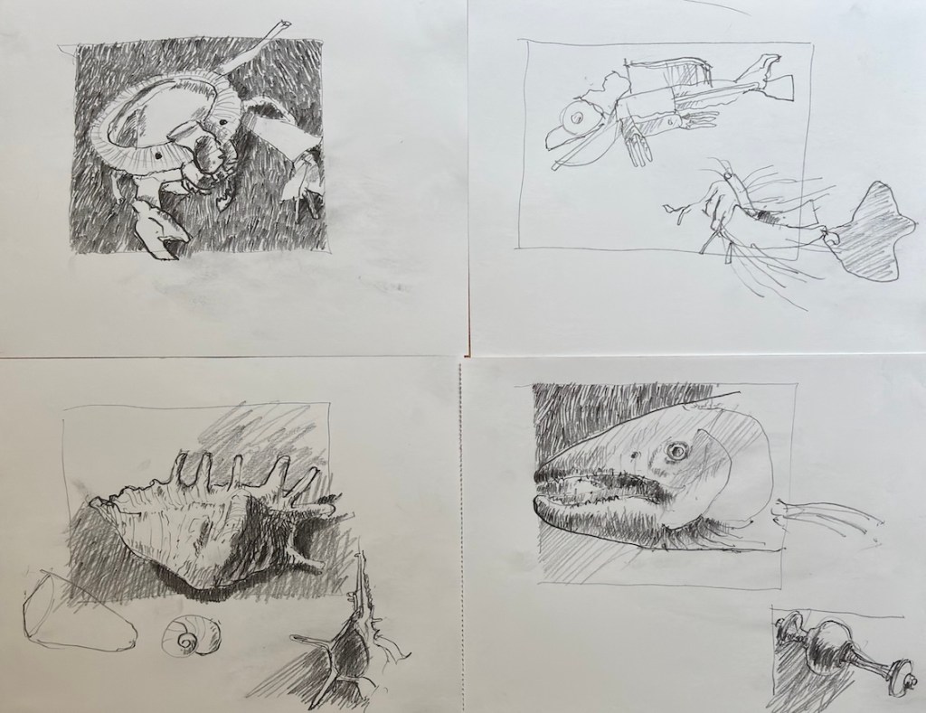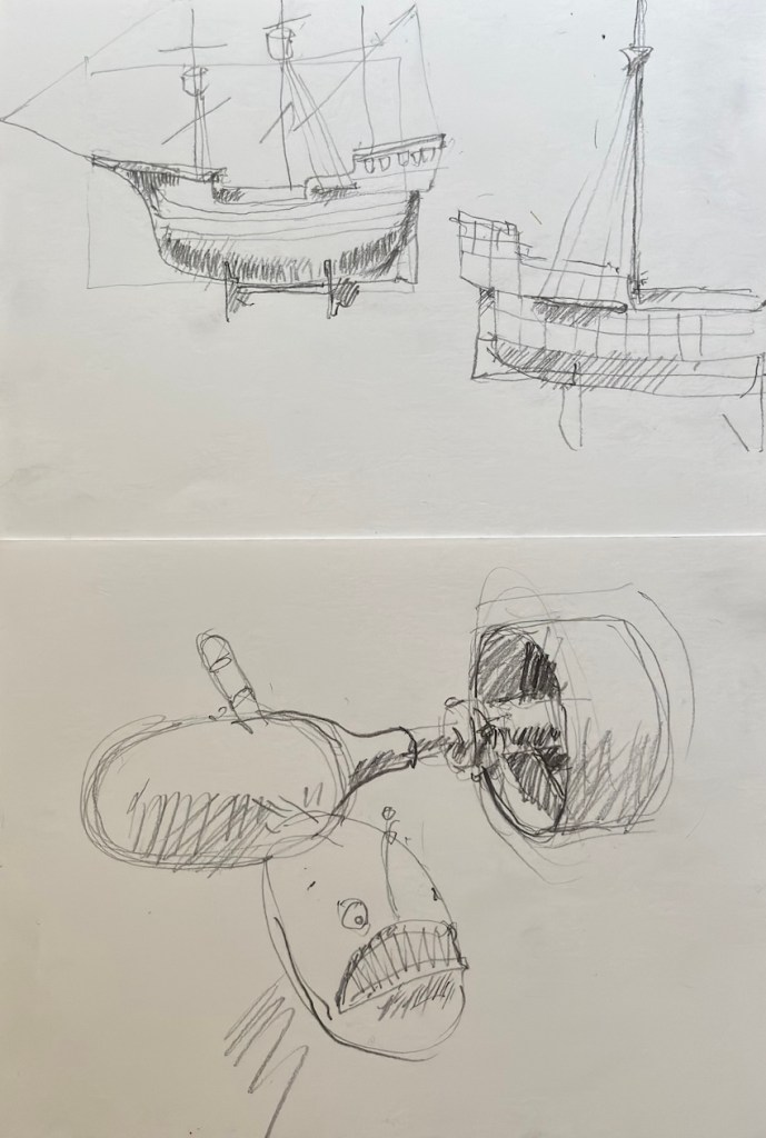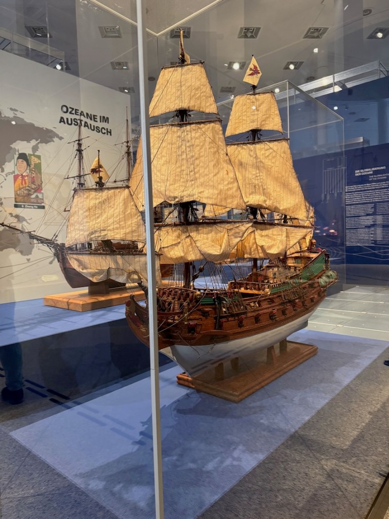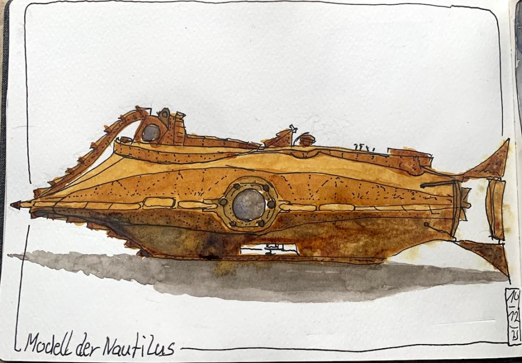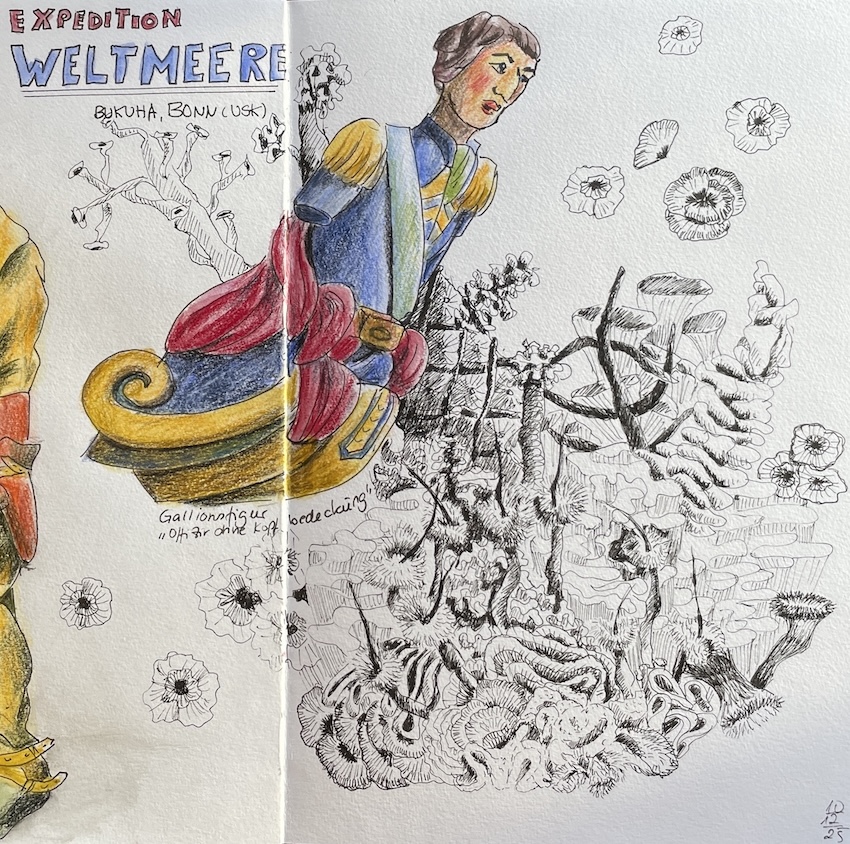 Stuart – Santa Maria, 1492, Kolumbus Stuart – Karacke Victoria, 1519, 1. Erdumrundung, Teil der Magellan-Flotte Stuart – Bark Endeavour, 1768, Captain James Cook, Australien, Neuseeland Gabi S. – Schiffsmodell mit gehissten Segeln Dana – Modell eines Segelschiffs mit Kanonen Barbara W. – Taucheranzug und Fisch Heinz – Taucheranzug von 1797 Heinz – Der Lachs der Weisheit kehrt zurück – von Mark Dion von 2016 Birgitt – Sedna, die Meeresgöttin der Inuit, Gebieterin über alle Meerestiere, Mutter der Stürme Marco – Modell der Nautilus Barbara T – Modell der Nautilus Birgitt – Unrat der Menschen verschmutzt die Weltmeere und bringt den Fischen Probleme Ruth – Revolver Gebiss des Hais Gitta – Wunderkammer Ozean, Schnecken und Kugelfisch Cornelia J. – wehrhafte Schnecke Barbara T. – allerlei Seegetier Cornelia J. – ein mit KI ergänztes Riff von Joan Fontenberta Kirsten – Gallionsfigur im Häkelkorallenriff