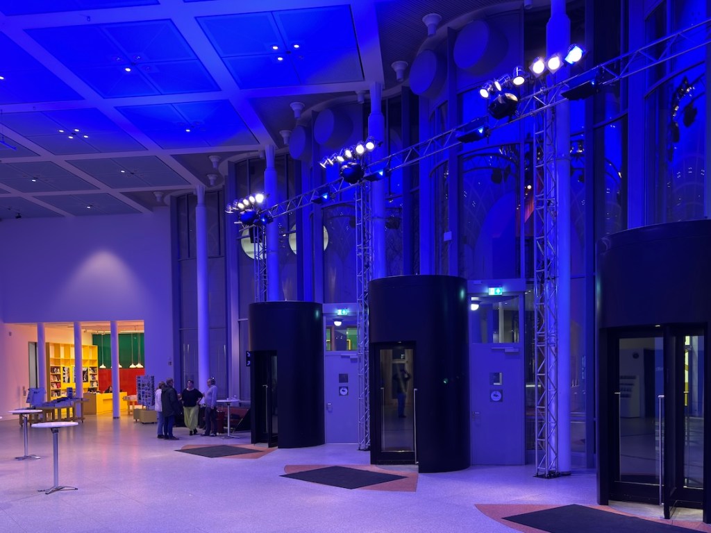 Dana – im Foyer der BuKuHa Ines – Menschen im Foyer Dana – Blick zur Buchhandlung im Lichterschein Andreas – in einer Ecke im Foyer Ines – im Foyer ist einiges los