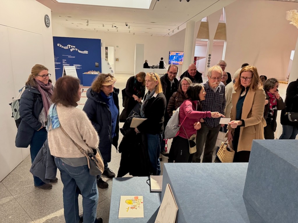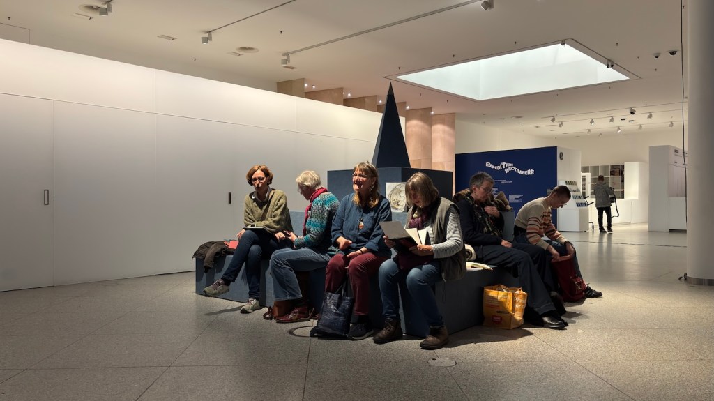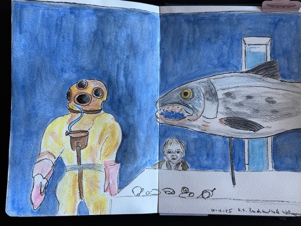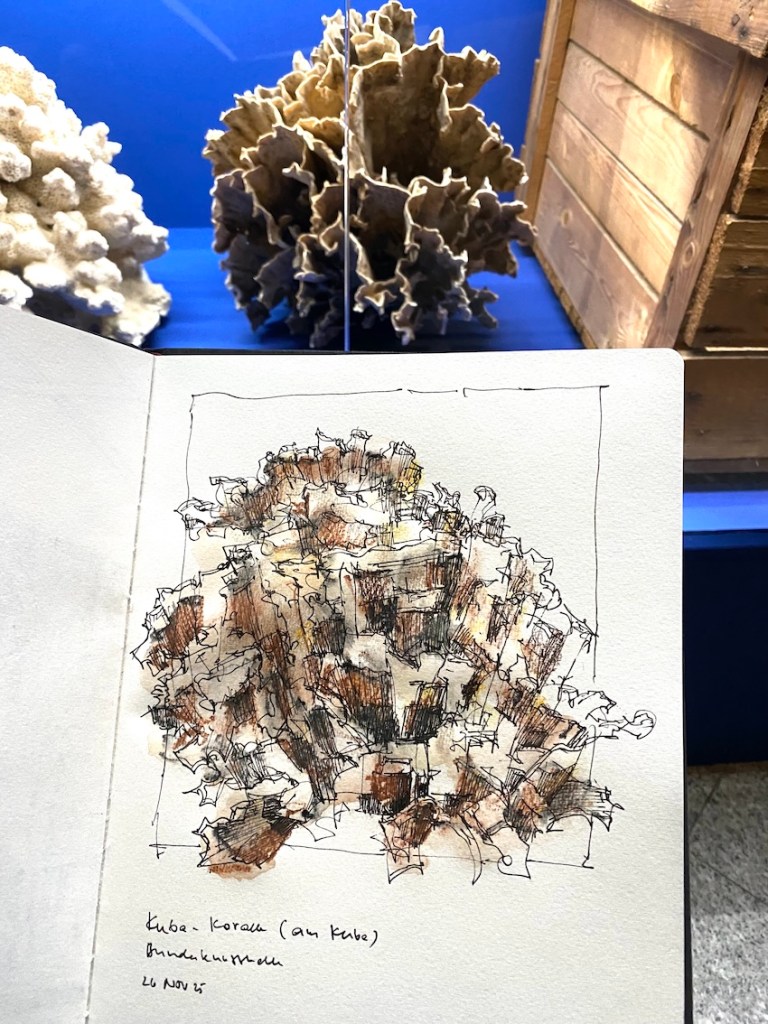 Am kommenden Mittwoch, dem 26.11.2025, treffen wir uns in der Bundeskunsthalle ab 18 Uhr. Die laufenden Ausstellungen „We/Trans/Form, zur Zukunft des Bauens“, „W.I.M., die Kunst des Sehens“, „Expedition Weltmeere“ und „Bundespreis für Kunststudierende“ bieten genügend tolle Motive zum Zeichnen und zudem ist es dort trocken und warm. Auch im Foyer oder im Café lässt es sich gut zeichnen. Schaut, was Euch interessant erscheint und zeigt uns Euren Blick auf die Ausstellungswelt! Zur Vernissage um 19:30 Uhr treffen wir uns im Foyer.