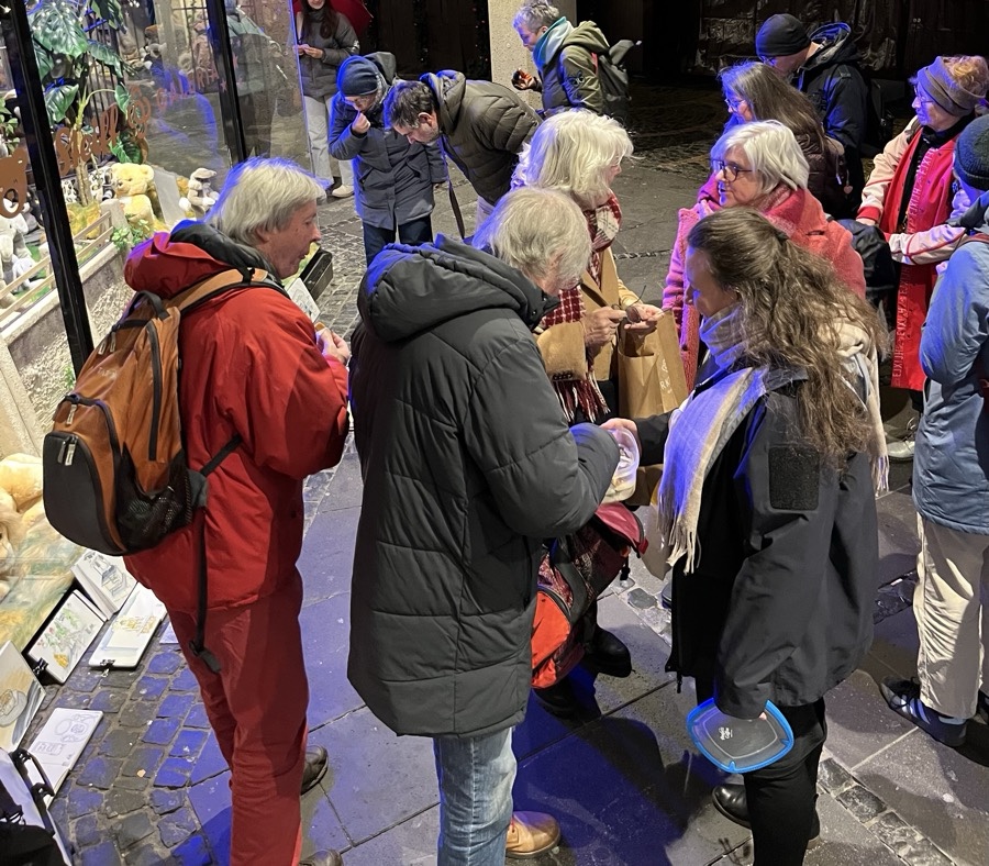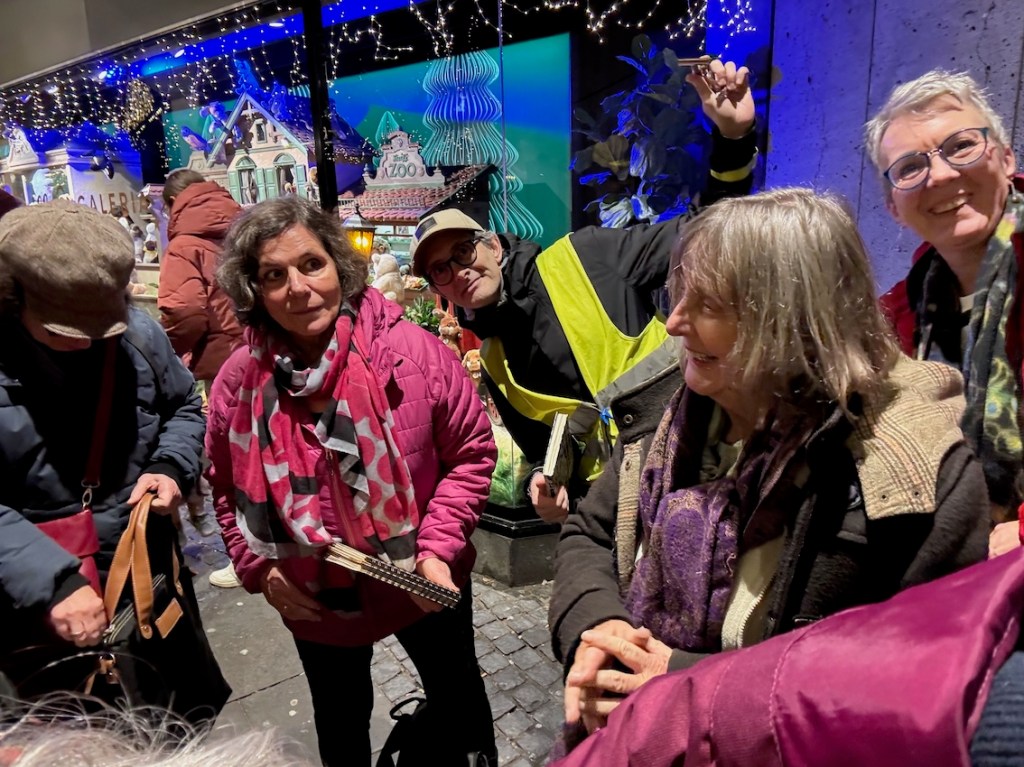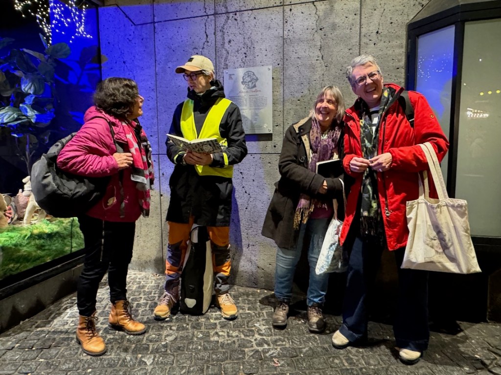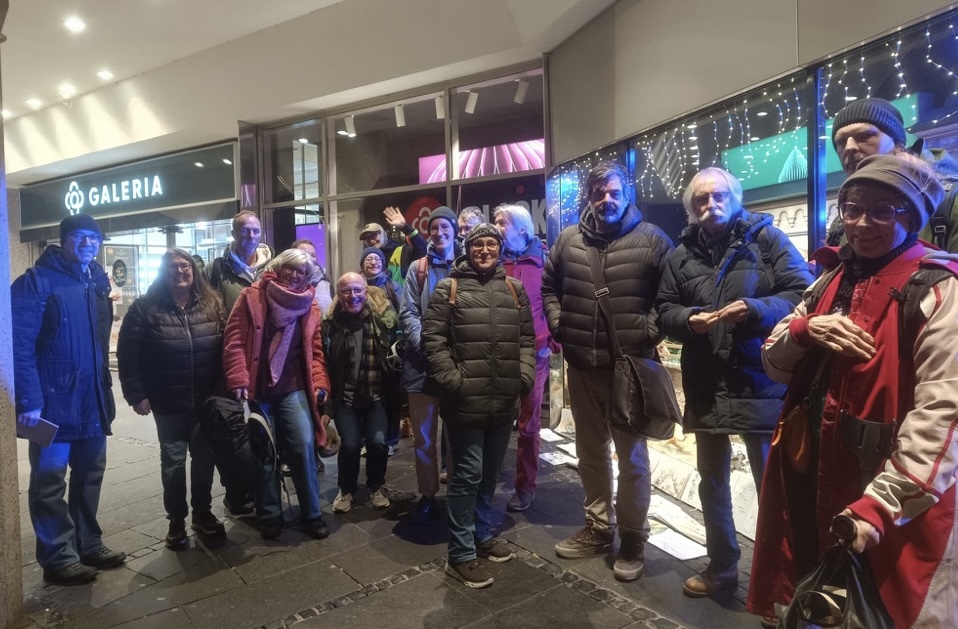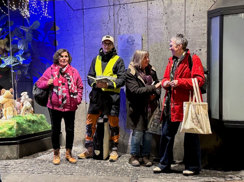 Da das Kaufhof-Restaurant wochentags bereits um 19 Uhr schließt, machen wir unsere Vernissage schon um 19:15 Uhr vor dem Kaufhof, an den Schaufenstern in Richtung Münster. Dort sind wir in der Nähe der Weihnachtsbuden, können gemeinsam der Kälte trotzen und die aufkommende Weihnachtsstimmung genießen.