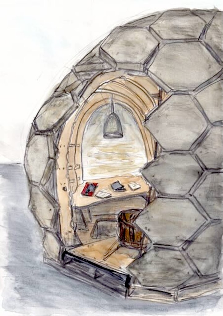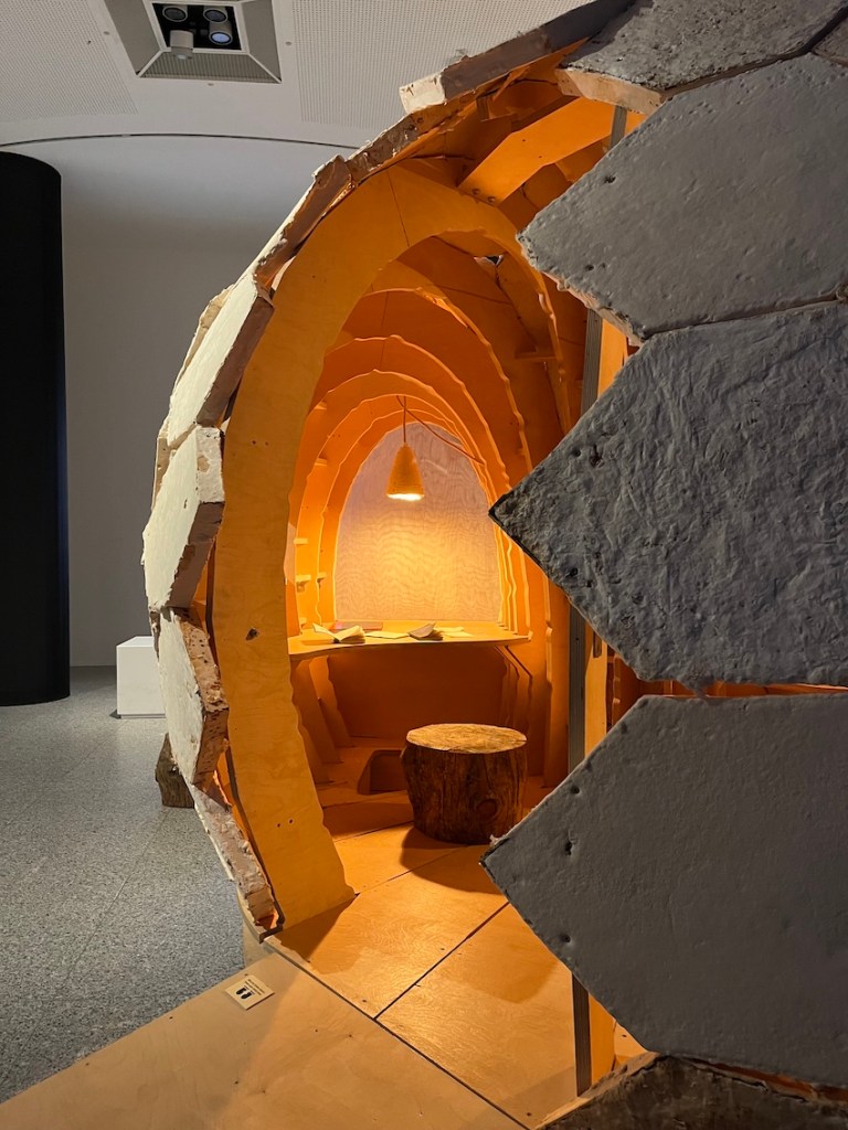 Allen – ein Pavillon aus Holz „Gerippe“ und mit Platten aus Pilzen, aus Pilzfasern gebacken…