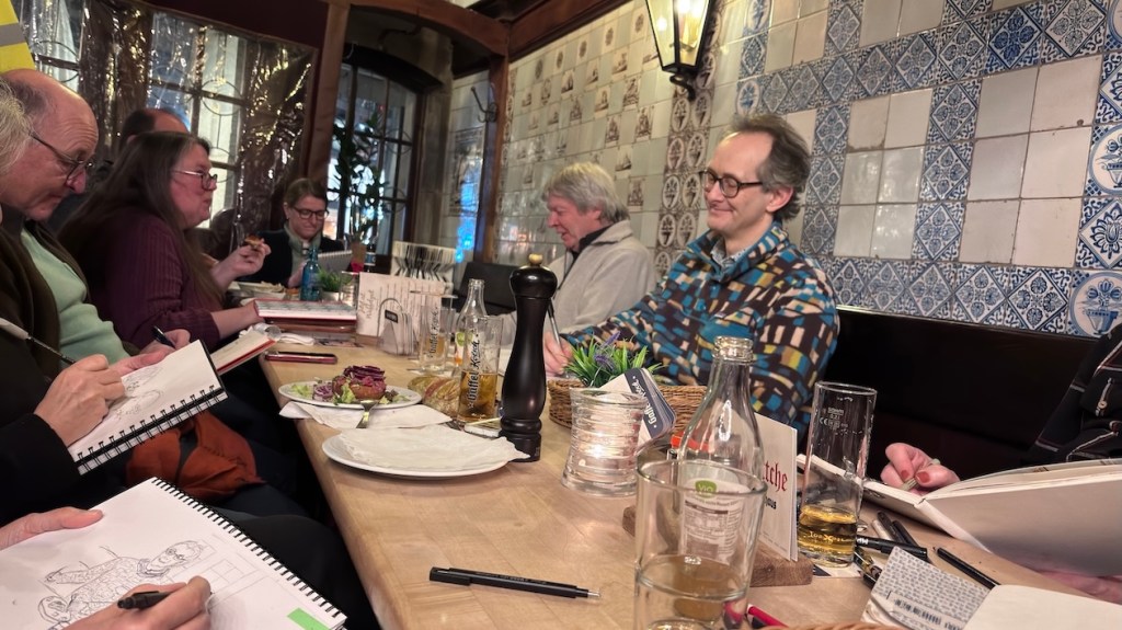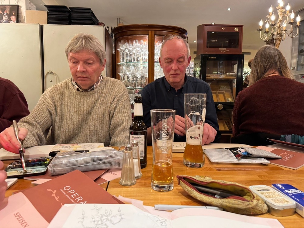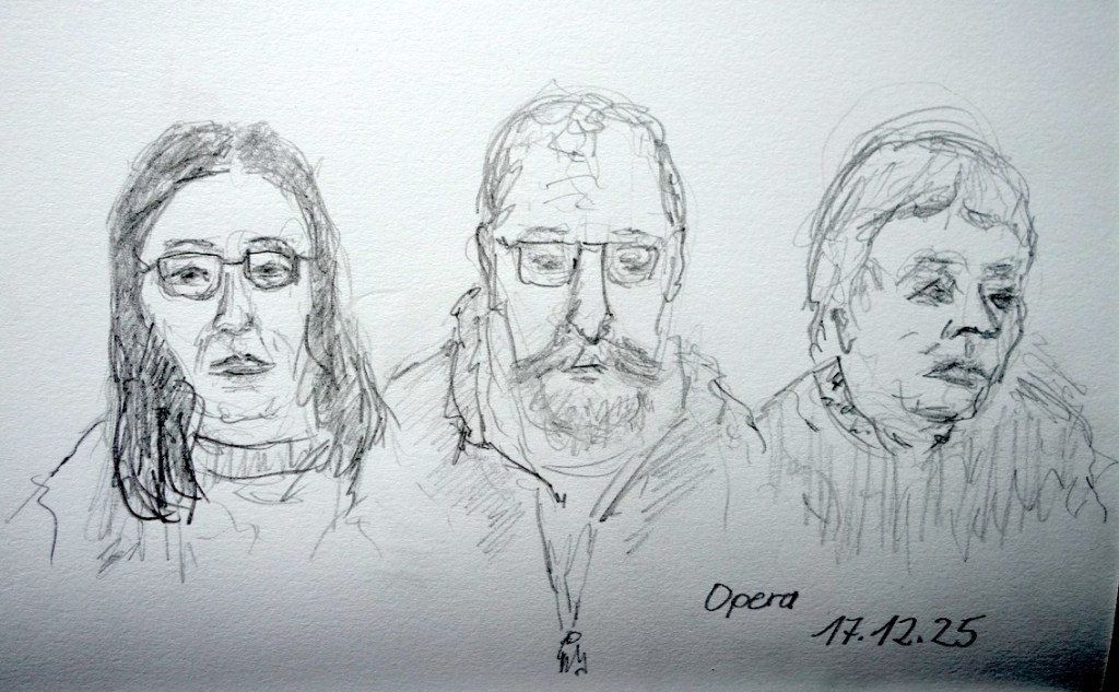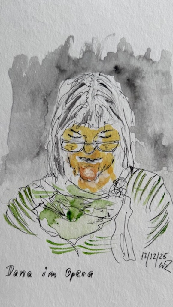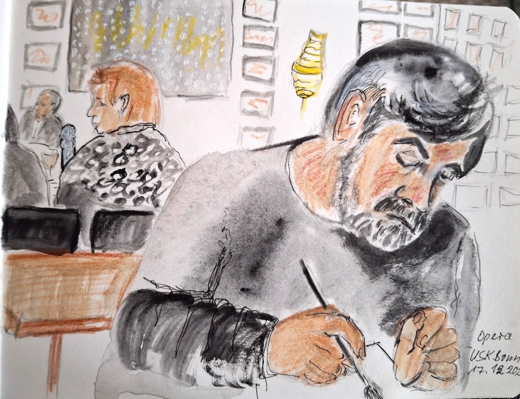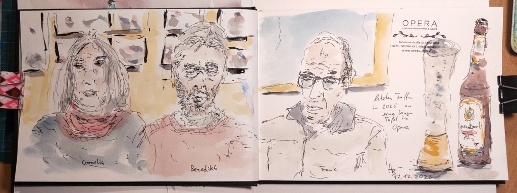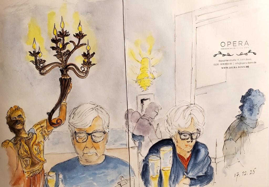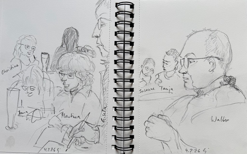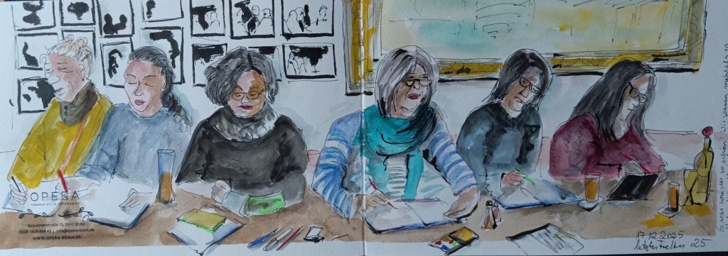 Damit ist das Restaurant an der Oper gemeint, das mit den leckeren türkischen Spezialitäten und den großen Kronleuchtern, Kapuzinerstraße 13, nicht die Oper selbst. Wir haben dort am nächsten Mittwoch, dem 17.12.25, für uns ab 18:00 Uhr einen Tisch für 20 Personen reserviert. Es darf gezeichnet, gemalt, getrunken, gegessen, geredet und gelacht werden! Und natürlich noch viel mehr außer: „Bitte nicht so viel rumlaufen!“ ….keine Ahnung, warum wir mal so einen Eindruck hinerlassen haben?! Muss wohl eine andere Zeichengruppe gewesen sein! Aber das kriegen wir auch hin, denke ich. Gegen 19:30 Uhr machen wir eine Vernissage am Tisch, Bilder rumgeben oder so, und das Gruppenfoto machen wir dann draußen vor der Tür um 20 Uhr. Oder auch anders, das sehen wir vor Ort, wir sind ja flexibel!