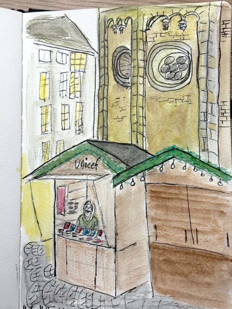 Da die Buden für den Weihnachtsmarkt (Eröffnung am 21.11.) schon stehen, ist es vielleicht interessant, auch draußen zu zeichnen – allerdings sind nur 6 Grad angekündigt. Vielleicht kann man die Buden ja auch von oben aus dem Kaufhof sehen? Das Bistro Midi (auf dem Platz) gibt es ja ebenfalls – also viele Möglichkeiten, sich beim Zeichnen wohlzufühlen.