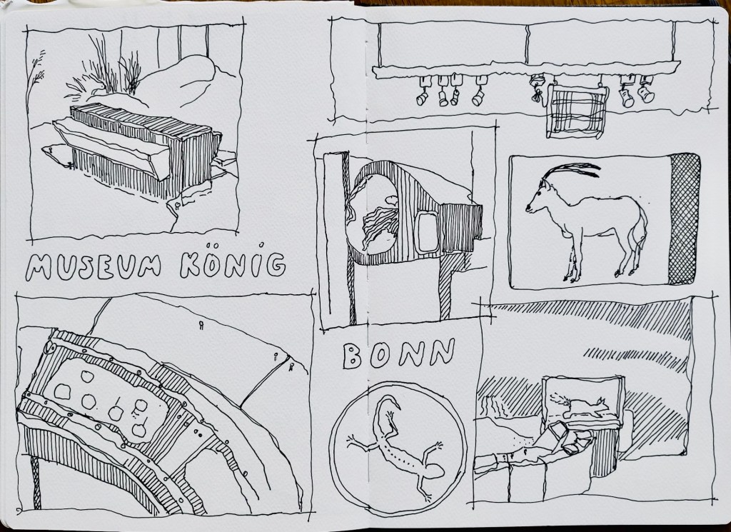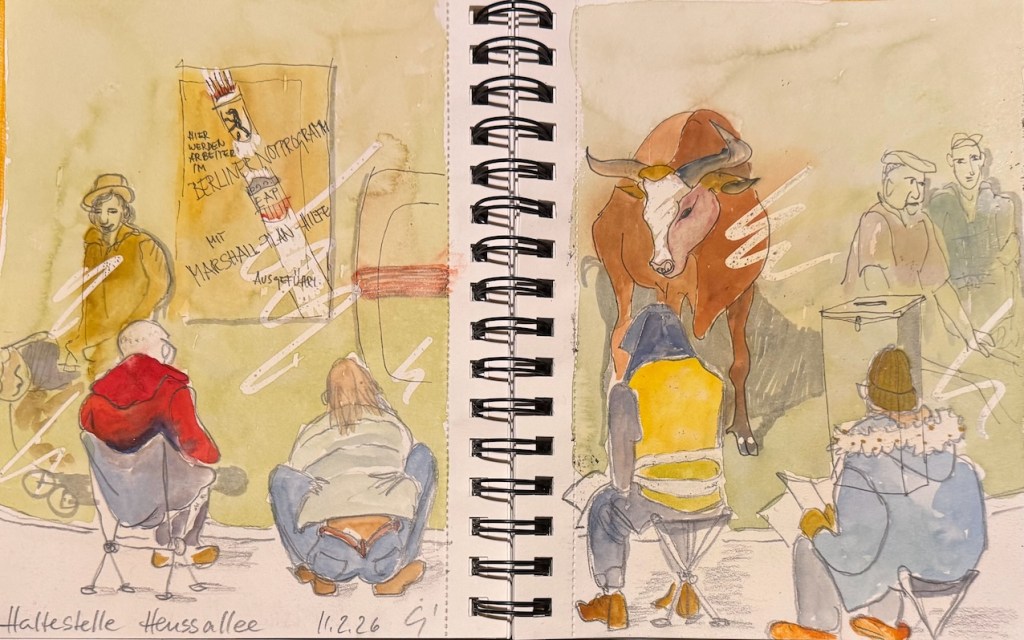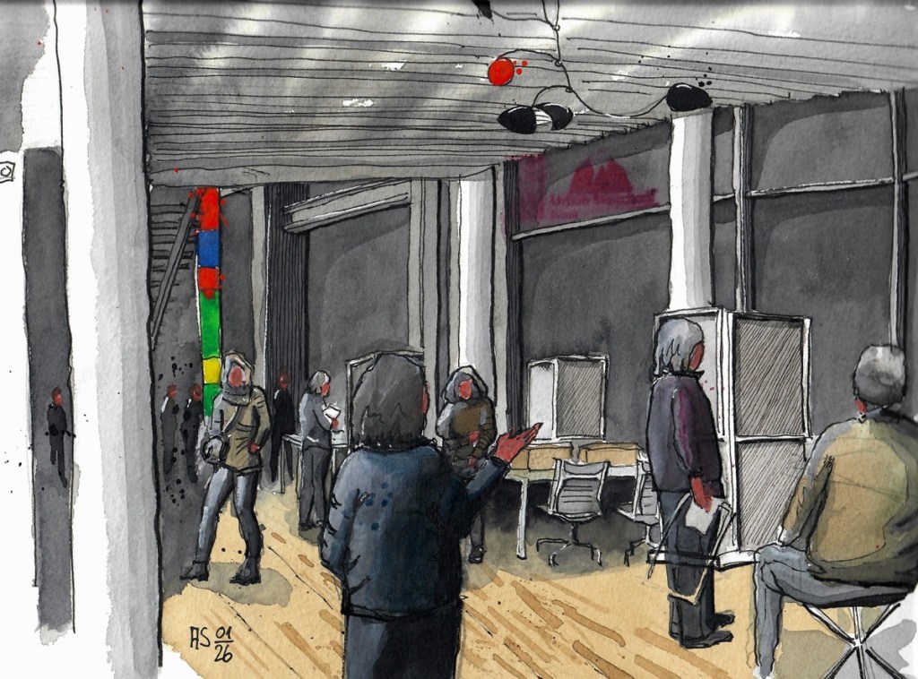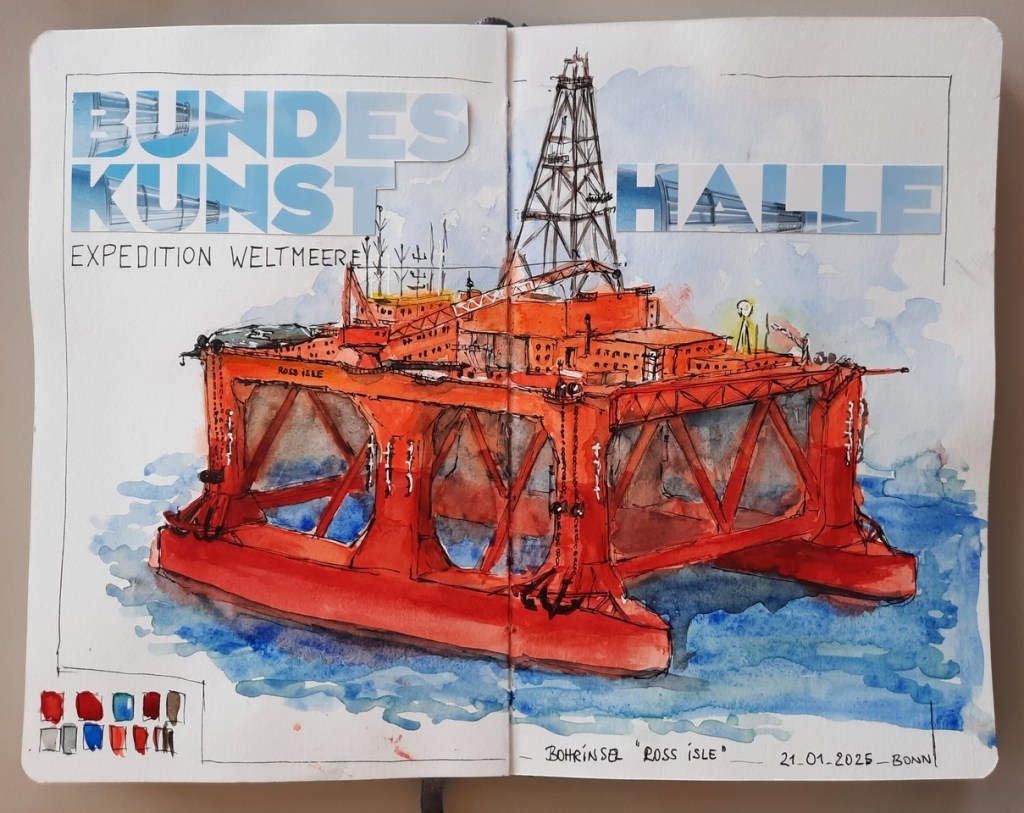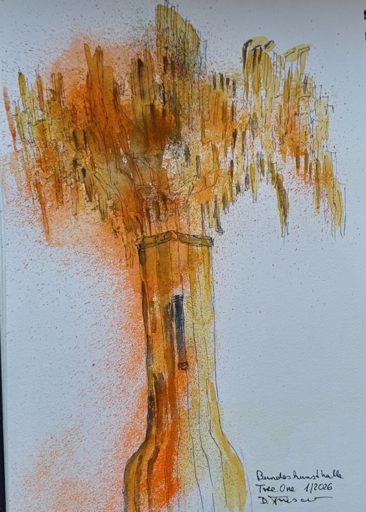 Die Bundeskunsthalle bleibt auch 2026 für uns eine reiche Quelle an Motiven. Zur Zeit sind die Ausstellungen „We transform – zur Zukunft des Bauens“ (noch bis 25.01.2026) und „Expedition Weltmeere“ zu sehen. Wer lieber im Foyer oder Bookshop bleibt, soll das tun und das Restaurant „Gustav“ ist natürlich auch ein Zeichenort. Blicke nach draußen oder von draußen, wenn es nicht zu kalt ist – was Ihr wollt! Das Kunstmuseum Bonn gegenüber hat bis 19:00 Uhr auch auf. Mit ArtCard kommt man in alle Ausstellungen ohne weitere Kosten ein ganzes Jahr lang.
