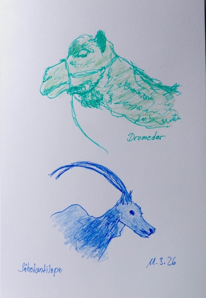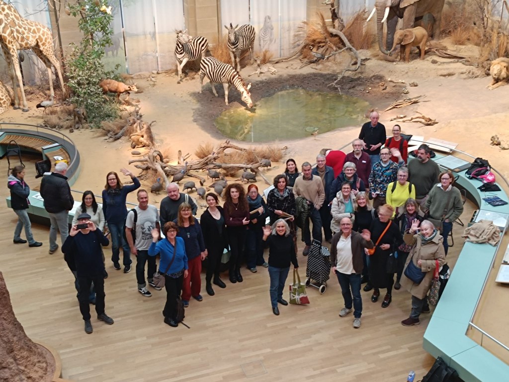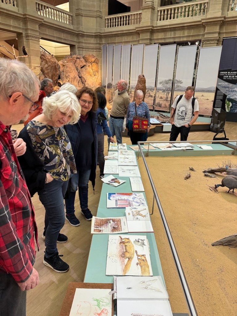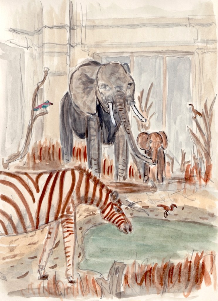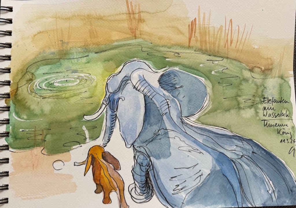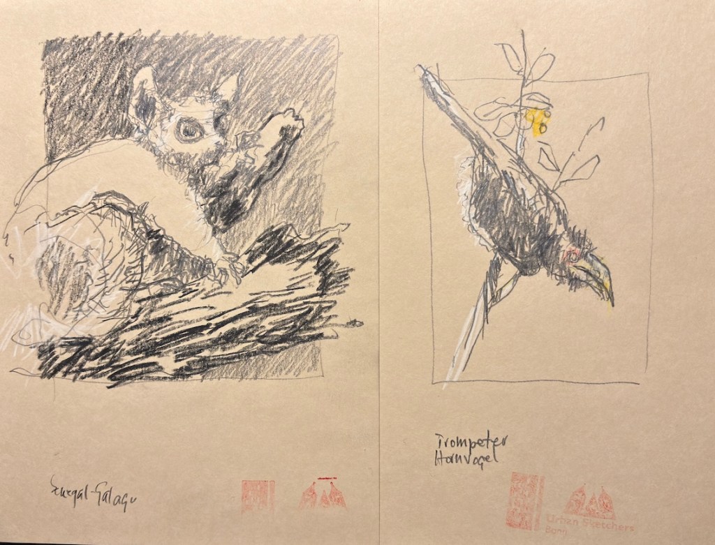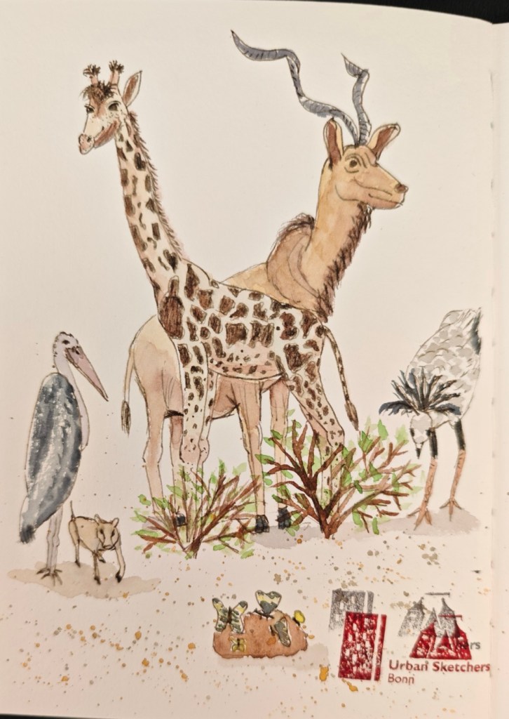 Zwischen all den Tieren, die so geduldig Modell stehen, sucht sich jede und jeder in Ruhe ein eigenes Motiv; alle Etagen bieten reizvolle Ecken zum Entdecken. Zur kleinen Vernissage kommen wir dann um 19:25 Uhr unten in der Savanne im Erdgeschoss zusammen – ein schöner Moment, um unsere Blätter zu zeigen und gemeinsam den Abend ausklingen zu lassen.