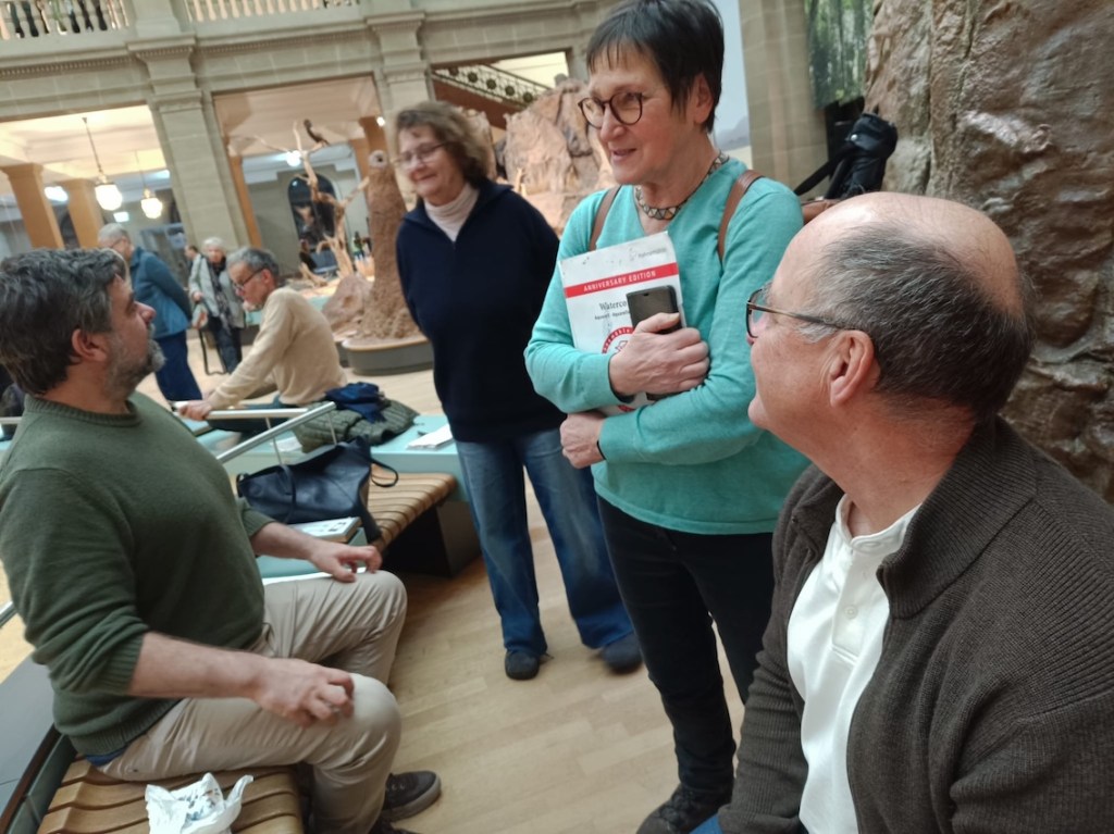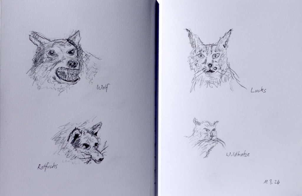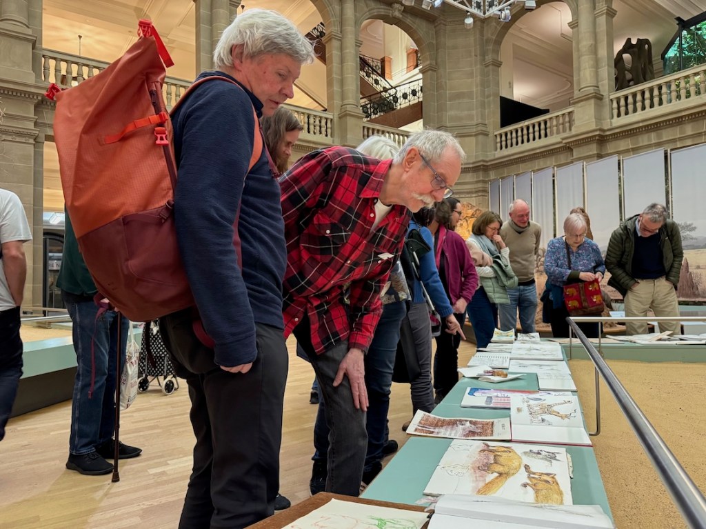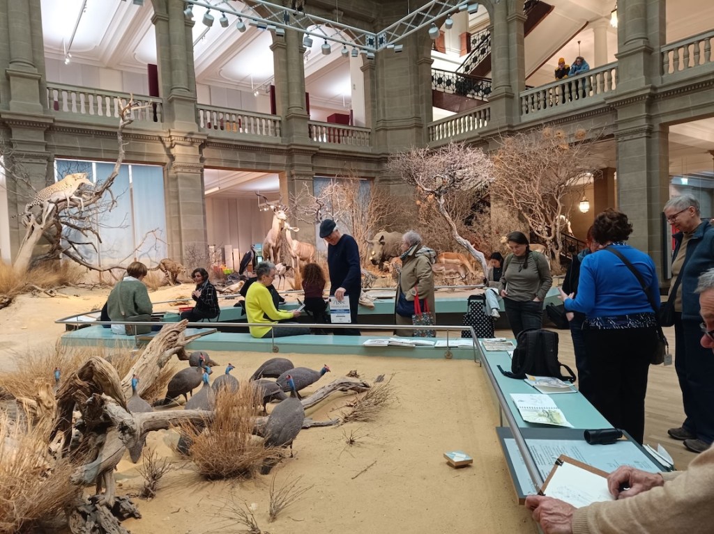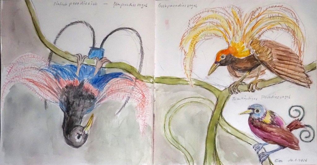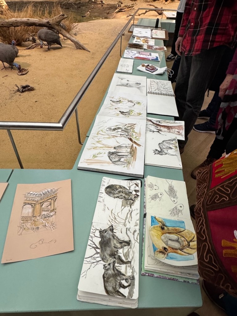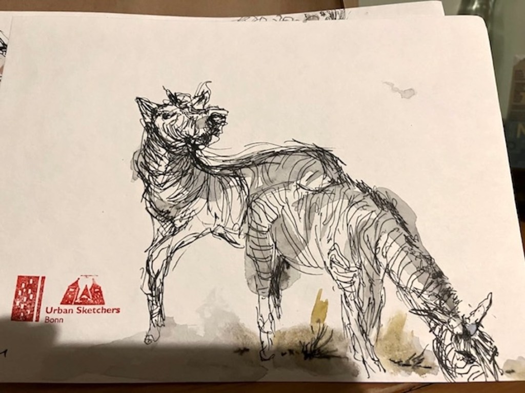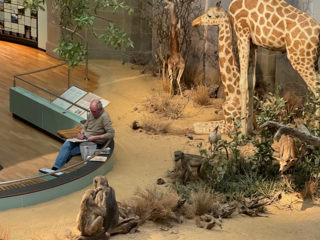 Zwischen all den Tieren, die so geduldig Modell stehen, sucht sich jede und jeder in Ruhe ein eigenes Motiv; alle Etagen bieten reizvolle Ecken zum Entdecken. Zur kleinen Vernissage kommen wir dann um 19:25 Uhr unten in der Savanne im Erdgeschoss zusammen – ein schöner Moment, um unsere Blätter zu zeigen und gemeinsam den Abend ausklingen zu lassen.