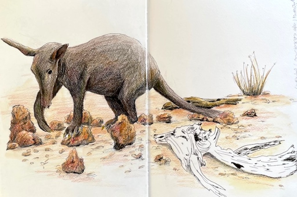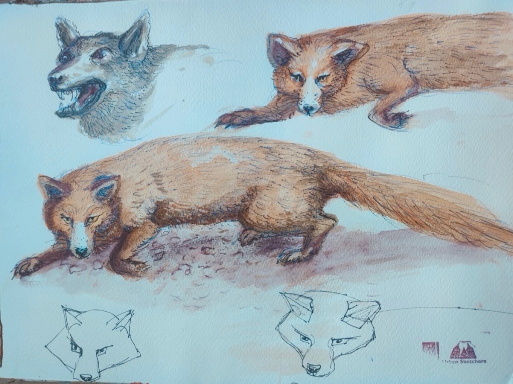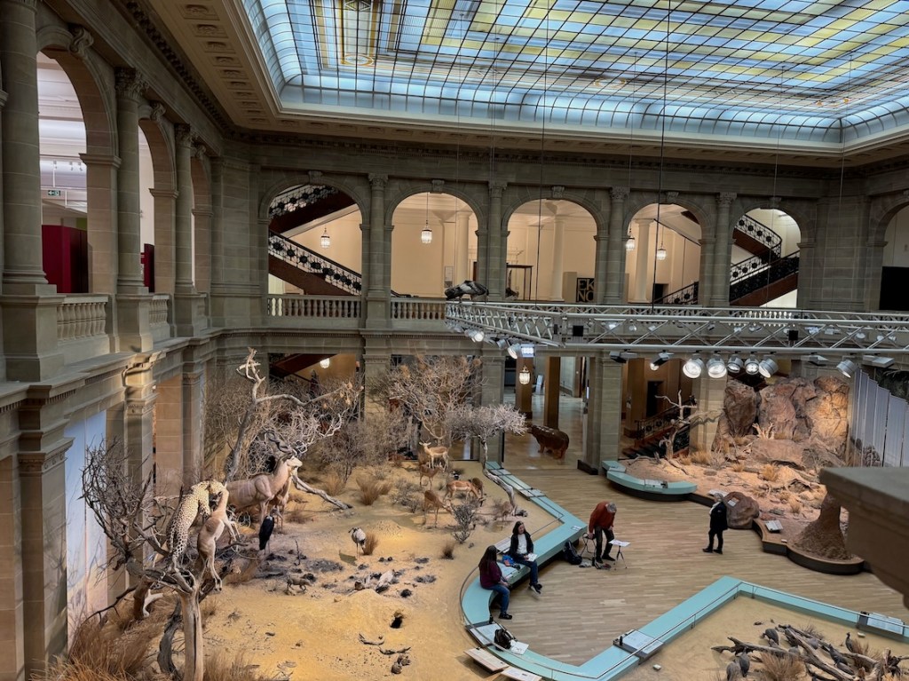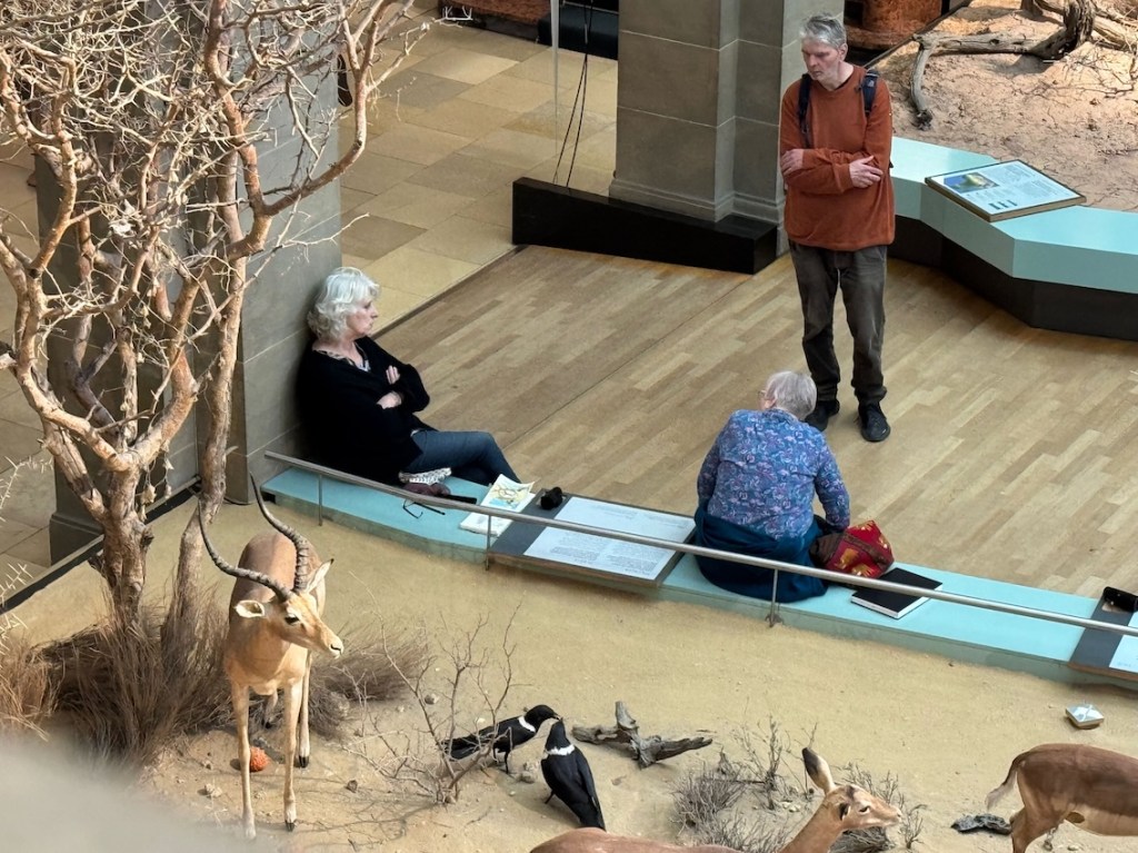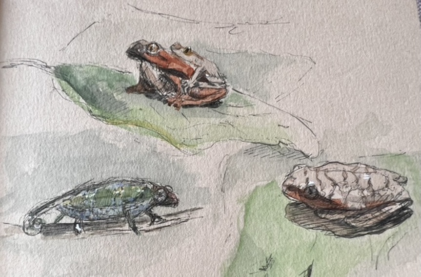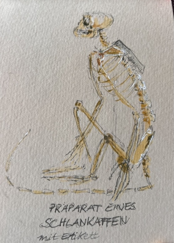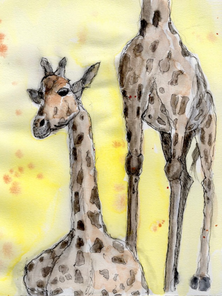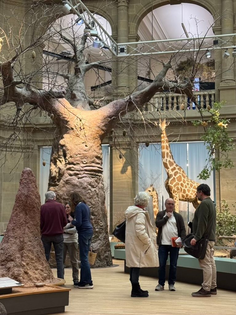 Zwischen all den Tieren, die so geduldig Modell stehen, sucht sich jede und jeder in Ruhe ein eigenes Motiv; alle Etagen bieten reizvolle Ecken zum Entdecken. Zur kleinen Vernissage kommen wir dann um 19:25 Uhr unten in der Savanne im Erdgeschoss zusammen – ein schöner Moment, um unsere Blätter zu zeigen und gemeinsam den Abend ausklingen zu lassen.