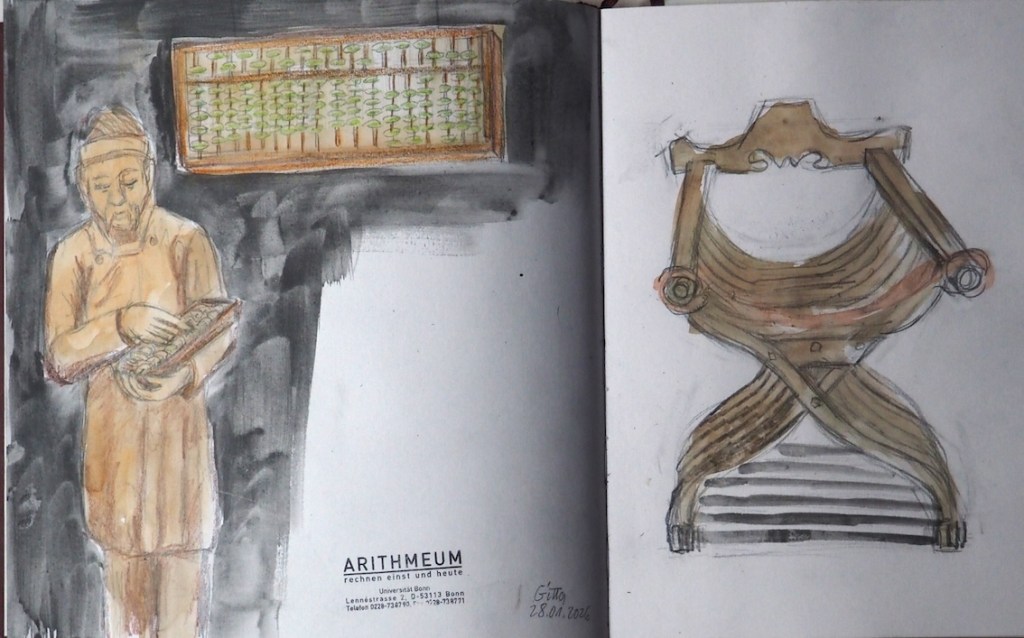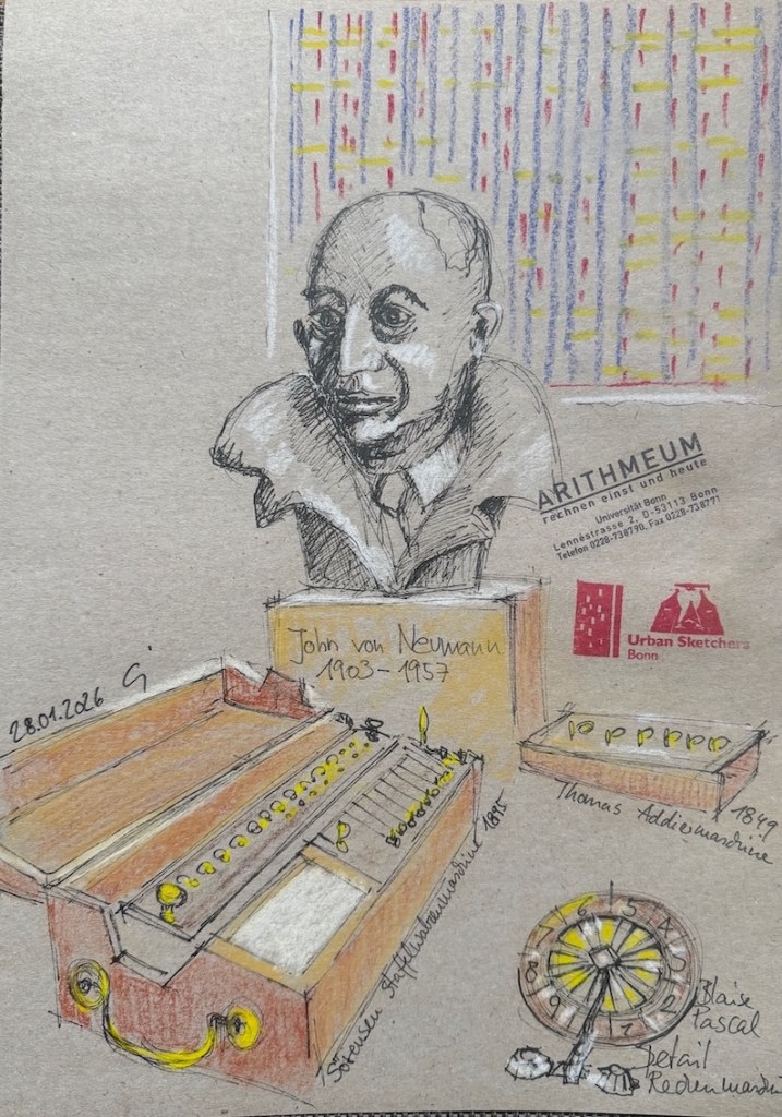 Frau Gorny vom Arithmeum erlaubt uns, dankenswerter Weise, nach Schließung des Museums, etwas länger zu bleiben. Wir treffen uns dort am Mittwoch, dem 28.01.2026, um 18 Uhr. Wer möchte, kann auch früher hin. Wer vorher kommt sagt bitte an der Kasse/Empfang Bescheid, dass ihr zu den Urban Sketchern gehört.