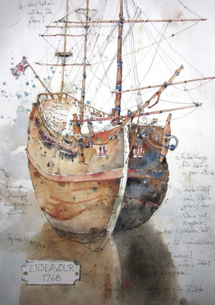 Holger – auf gealtertem Papier gemalt: Die alte Endeavour des James Cook
