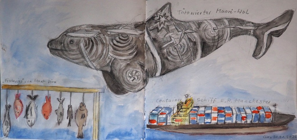Julia – Hochsehfische an der Leine Gitta – tätowierter Maori Wal, Fisheries und Container Schiff
