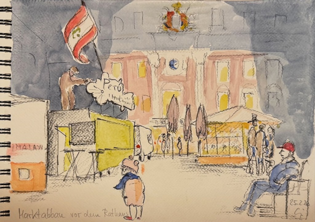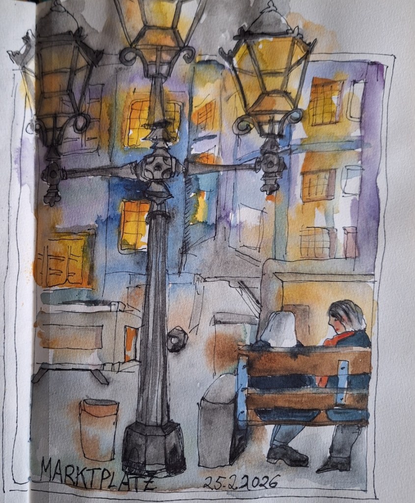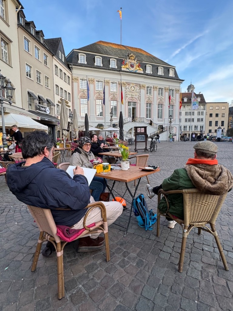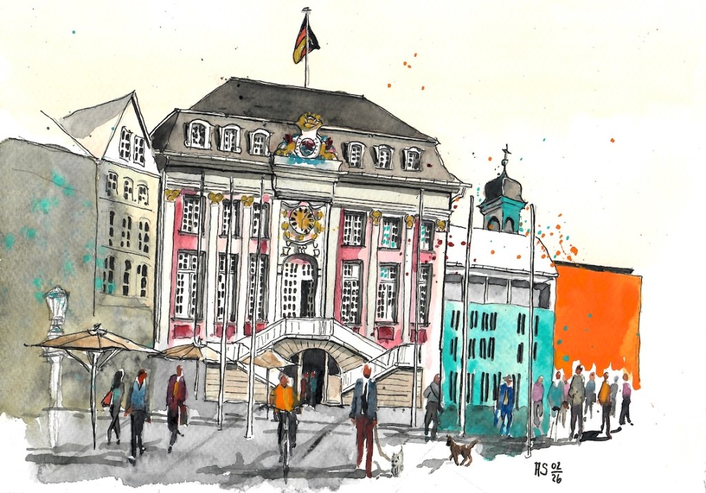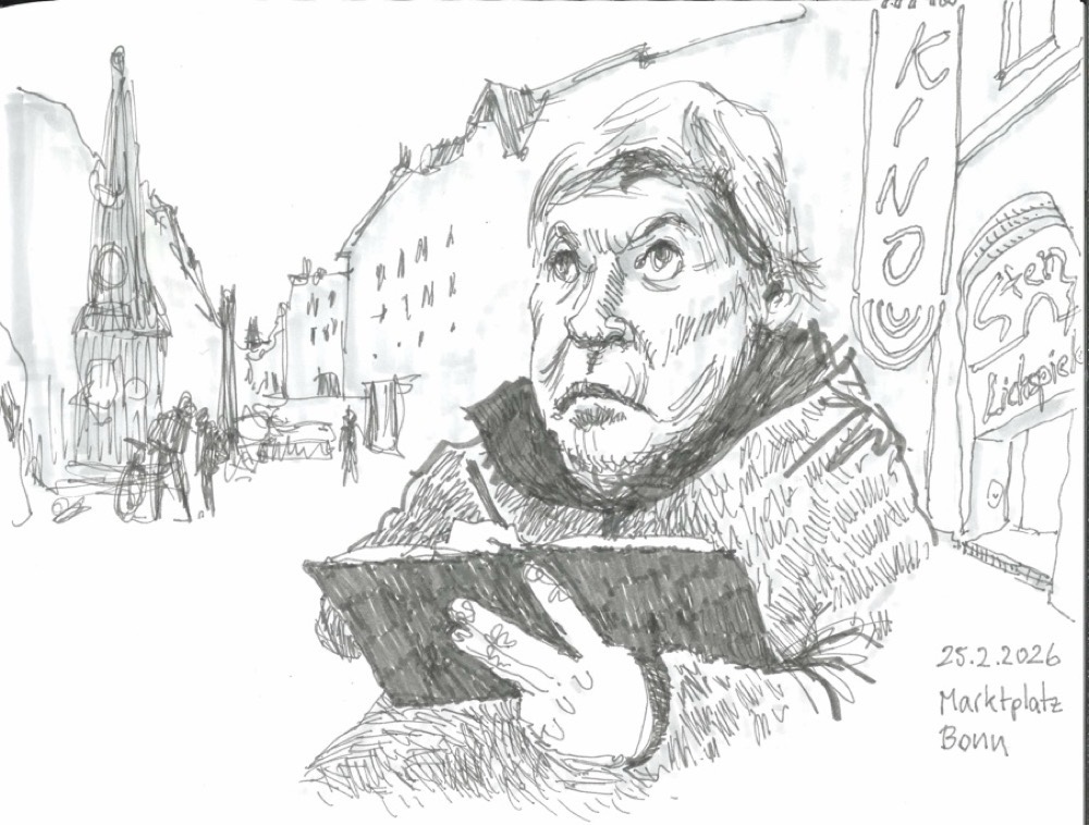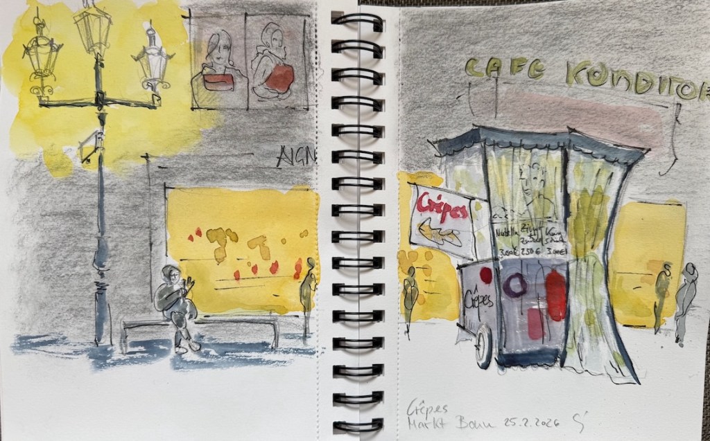 Für den nächsten Mittwoch, den 25.02.2026, ist herrlichstes Frühlingswetter angesagt mit Temperaturen bis zu 20° C. Wir treffen uns auf dem Marktplatz in der Bonner Innenstadt ab 18 Uhr oder früher und vielleicht ist ein erster echter Urban Sketch in diesem Jahr möglich. Der Platz, der Markt, das Rathaus, das Sternhotel, das Metropol – Motive gibt´s genug! Wenn es doch zu kalt wird oder der Regen schauert, haben wir dort genügend Einkehrmöglichkeiten: das Thalia mit dem Café im 1. Stock, das Café Miebachs, das Teehaus u.v.m.. Zur Vernissage treffen wir uns um 19:30 Uhr am Eingang des Thalia vor einem Schaufenster, das noch beleuchtet ist.