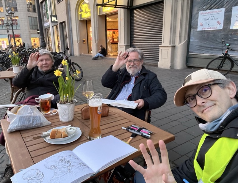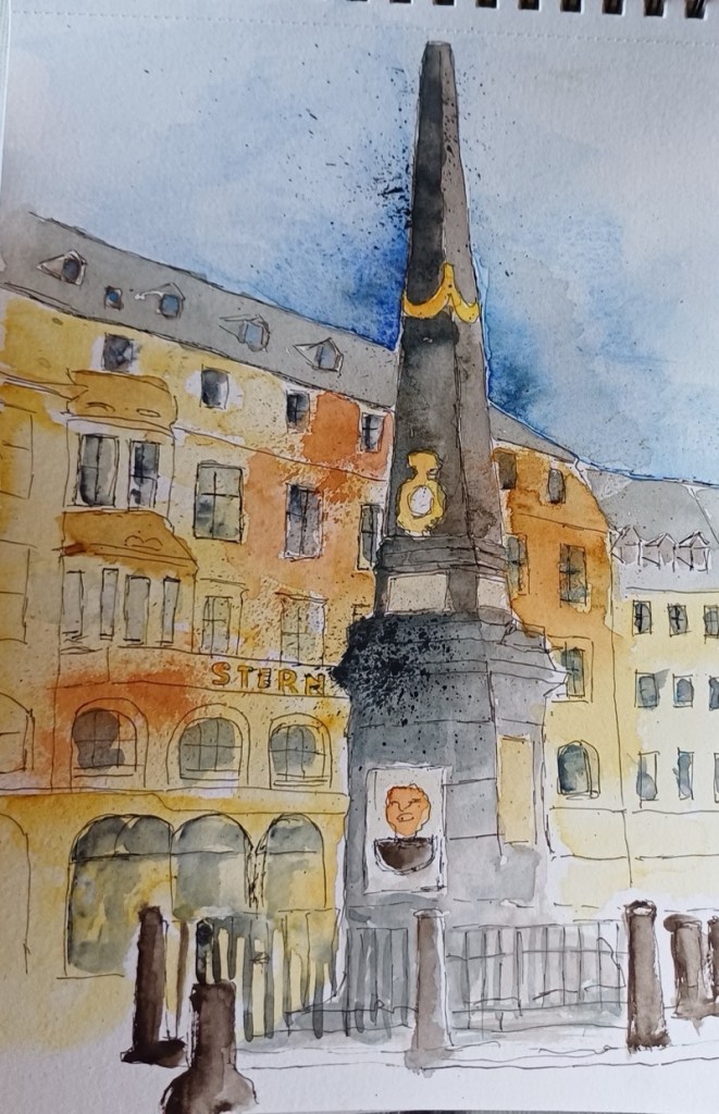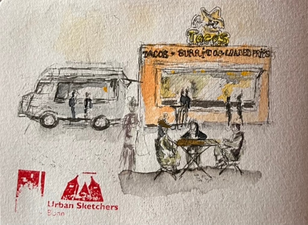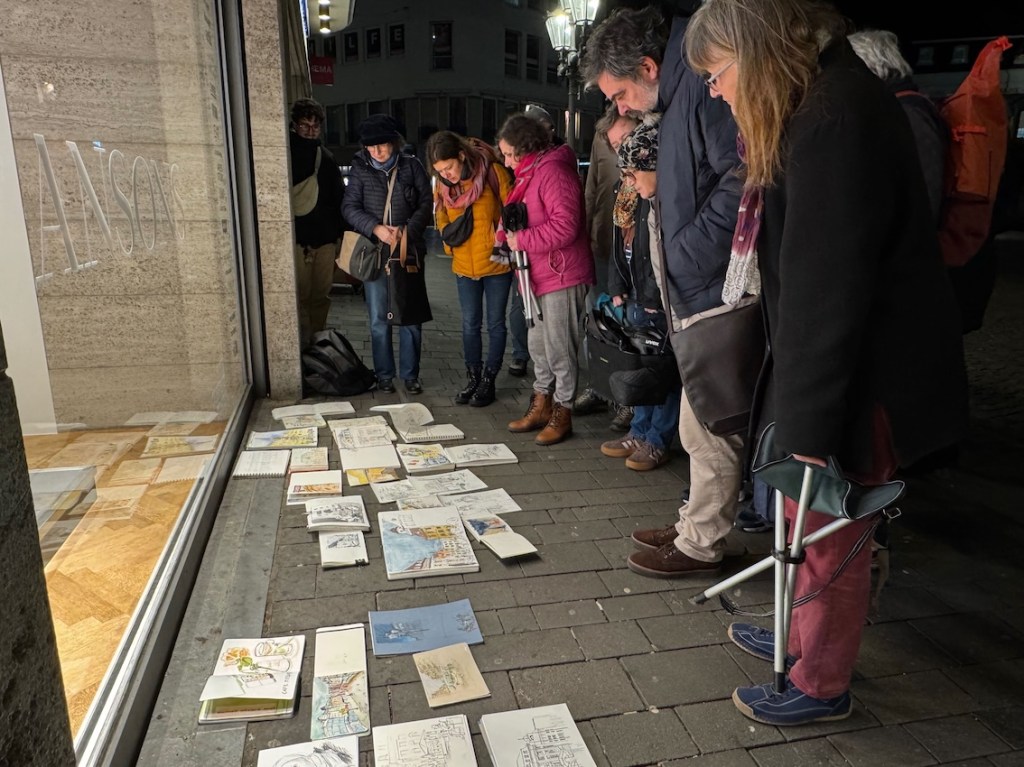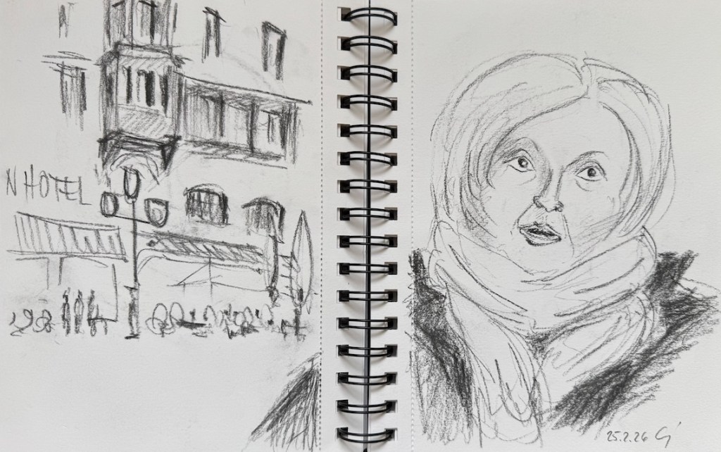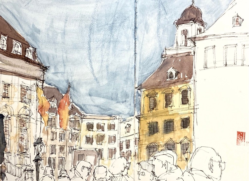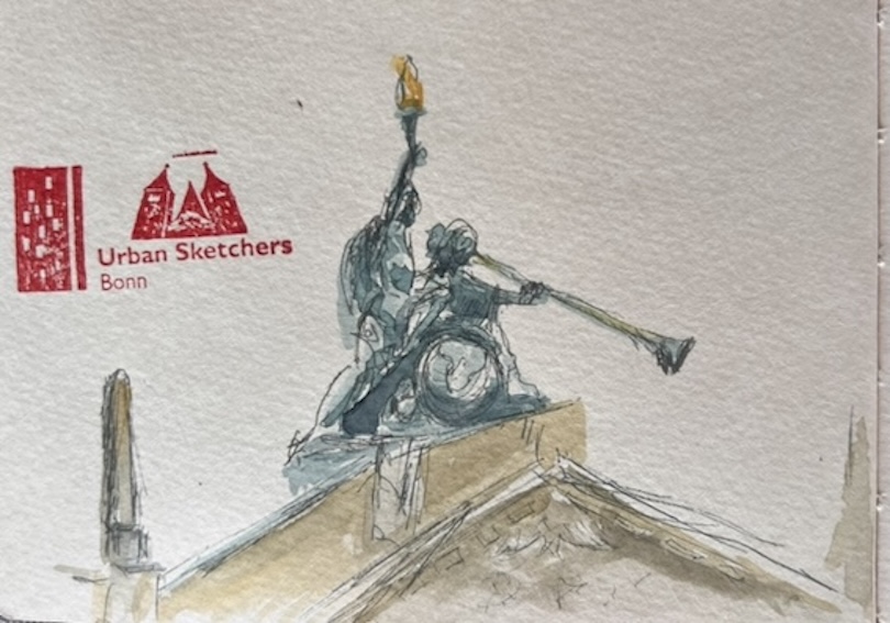 Für den nächsten Mittwoch, den 25.02.2026, ist herrlichstes Frühlingswetter angesagt mit Temperaturen bis zu 20° C. Wir treffen uns auf dem Marktplatz in der Bonner Innenstadt ab 18 Uhr oder früher und vielleicht ist ein erster echter Urban Sketch in diesem Jahr möglich. Der Platz, der Markt, das Rathaus, das Sternhotel, das Metropol – Motive gibt´s genug! Wenn es doch zu kalt wird oder der Regen schauert, haben wir dort genügend Einkehrmöglichkeiten: das Thalia mit dem Café im 1. Stock, das Café Miebachs, das Teehaus u.v.m.. Zur Vernissage treffen wir uns um 19:30 Uhr am Eingang des Thalia vor einem Schaufenster, das noch beleuchtet ist.