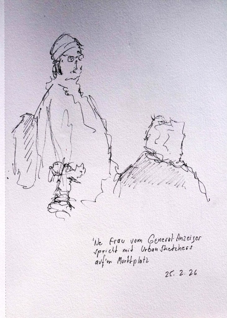 Alfred – Eine Frau vom General Anzeiger spricht mit Urban Sketchers auf dem Marktplatz