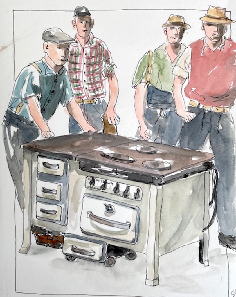 Kirsten – „Männer an den Herd!“ – freie Interpretation der AusstellungsstückeCornelia J. – Zeichner vor den Schaukästen