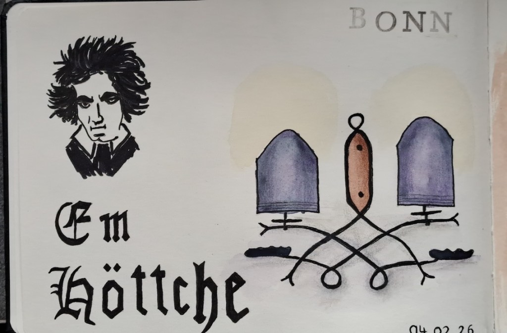 Das Höttche ist das Bierlokal direkt links neben dem Alten Rathaus auf dem Marktplatz in der Bonner Innenstadt. Der Eingang ist klein und versteckt, aber das Lokal weitet sich in dieser Ecke enorm und hat auch Platz für uns Zeichner – ein Tisch ist reserviert für die Urban Sketcher ab 18 Uhr. Bei einem leckeren Getränk oder auch einem guten Imbiss können wir das holzgetäfelte Ambiente zeichnen, evtl. sind auch ein paar Karnevalsdekorationen zu sichten und natürlich das uns immer begleitende Thema: unsere MitzeichnerInnen! Also freut Euch auf ein lockeres Zusammensein bei Bier und Bratwurst mit Stift und Papier!