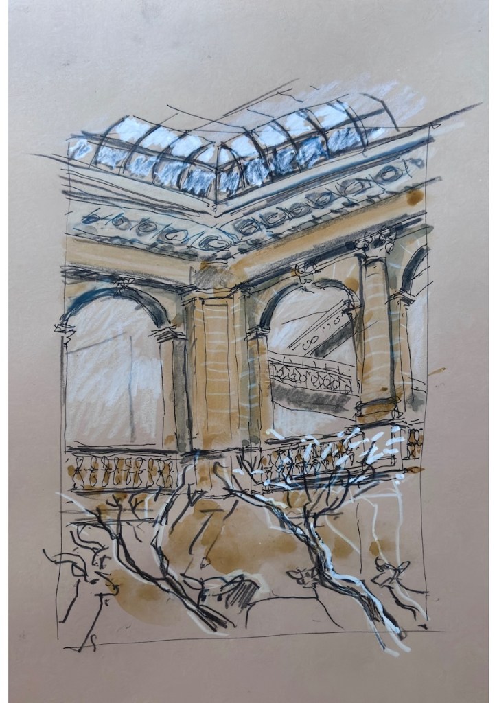 Dort kann man sich am Buffet etwas Leckeres zusammenstellen oder auch nur ein Getränk nehmen, an der Kasse bezahlen (Gewichtspreis, einheitlich) und sich dann ein interessantes Plätzchen zum Essen und Zeichnen suchen. Das Interieur, die Kunst an den Wänden, Pflanzen und Menschen bieten viele Motive – ebenso die Passage und der Garten des Restaurants.