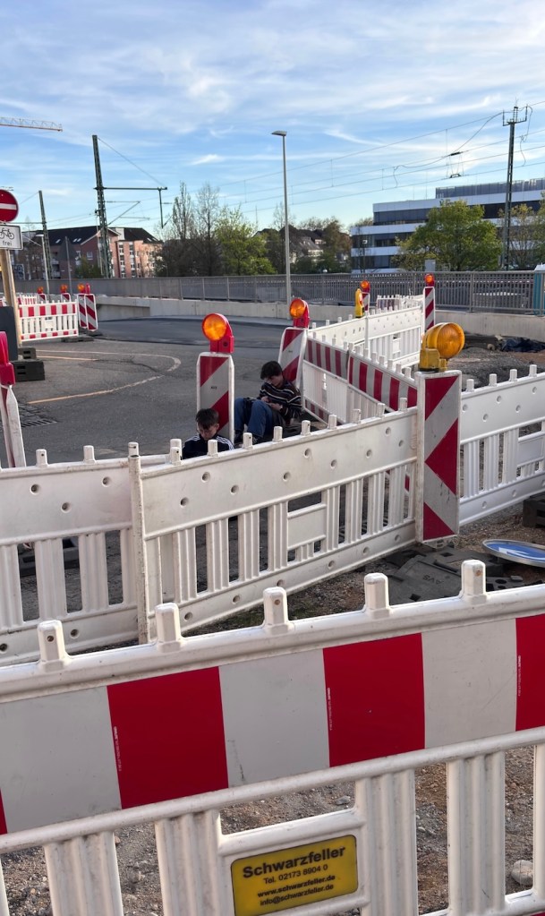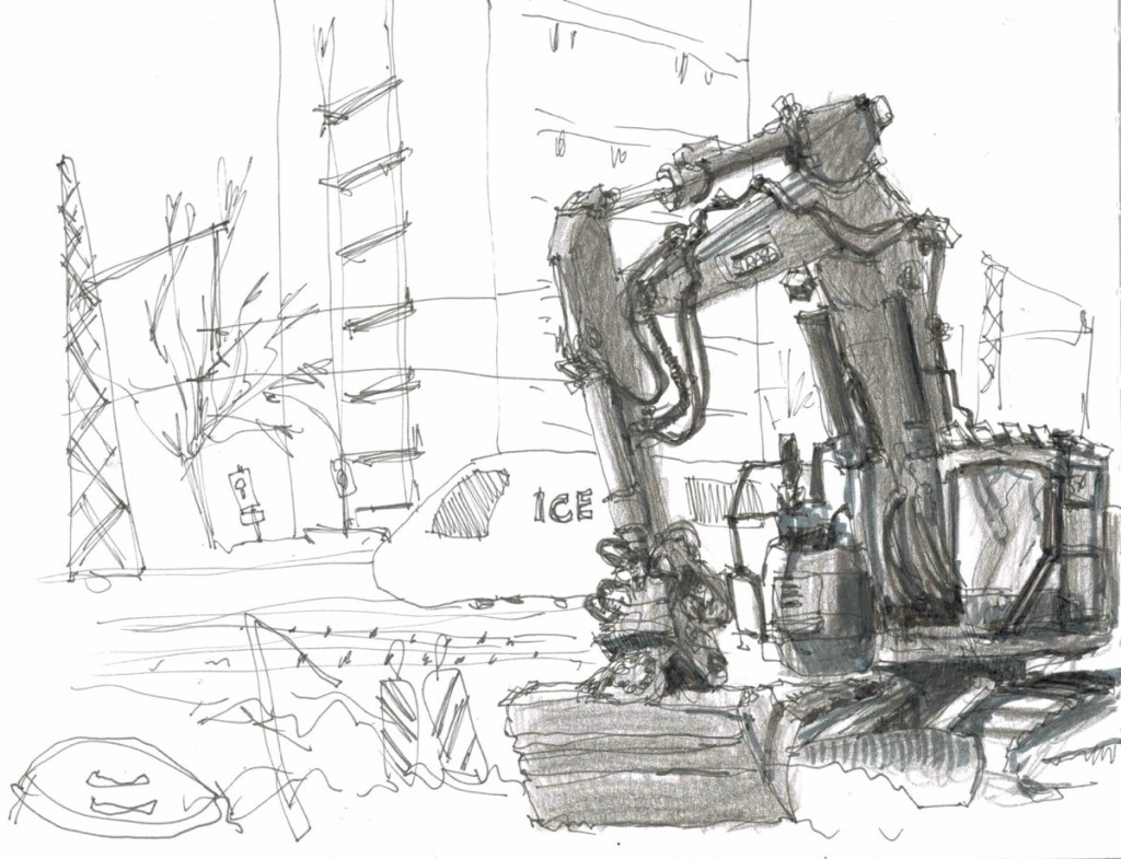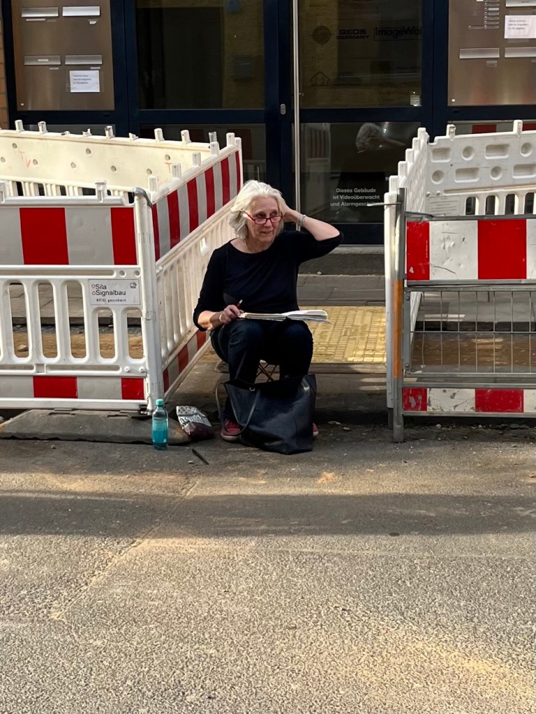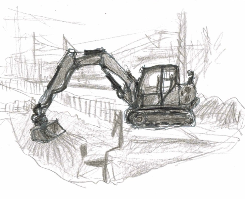 Auf der Straße wird noch gebaggert; aber das stört die Sketcher nicht.