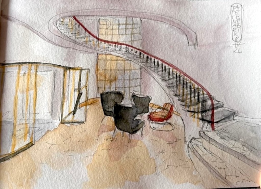 Stuart – Doppelseite im Skizzenbuch mit Impressionen aus den UntergeschossSandra – so schön sieht es von innen aus: Foyer im „Haus der Geschichte“