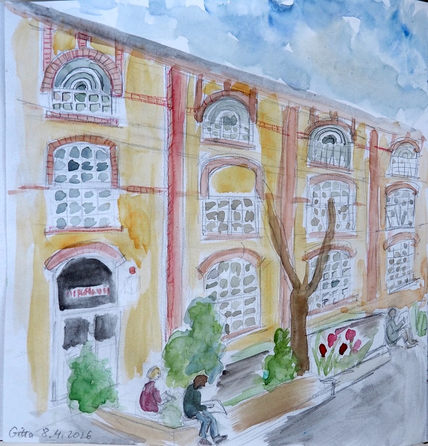 Treffpunkt und Ablauf: Es gibt einen festen Treffpunkt für alle, die bei der Führung dabei sein möchten. Um 18 Uhr treffen wir uns vor dem Eingang zum Haus in der Auguststraße 12 … hier ist auch unser Treffpunkt für die Vernissage um 19:25 Uhr. Setzt euch zum zeichnen an den verschiedenen Ecken und in den verschiedenen Innenhöfen, mit euren mitgebrachten Hockern.
