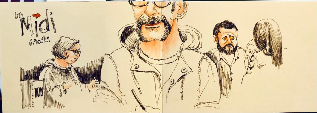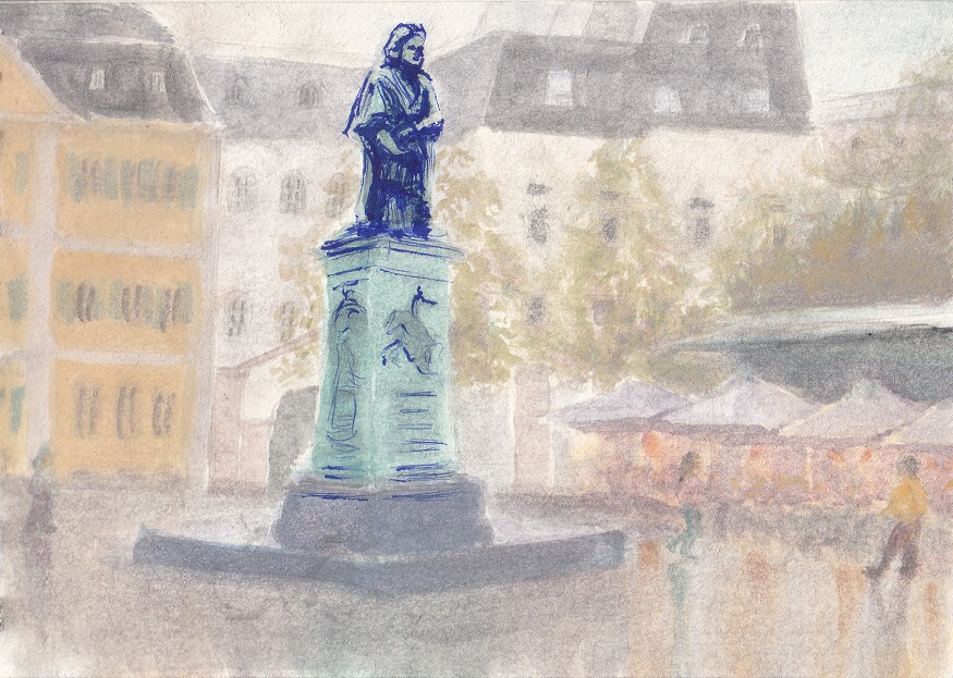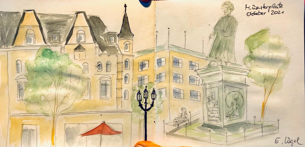 Nächsten Mittwoch, 6.10.2021, wollen wir uns mal wieder auf dem Münsterplatz treffen, mit der Option sich in Café Midi zu setzen, wenn es draussen zu unwirtlich ist. Motive gibt es ja dort genug! Zeichnen ist ab 17 Uhr, die Vernissage um 19 Uhr an der Statue von Beethoven.