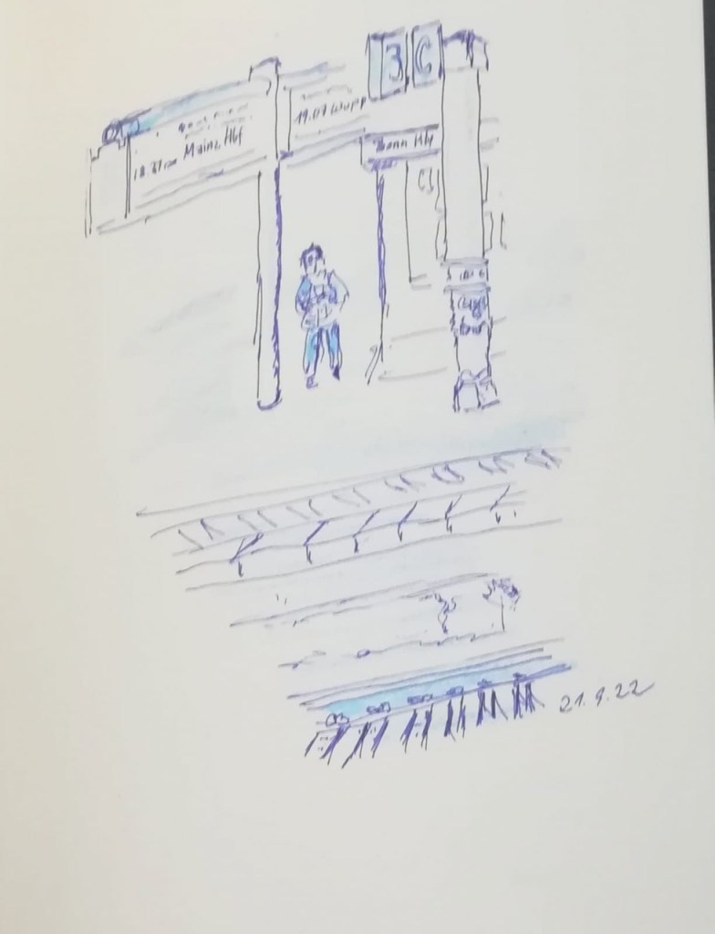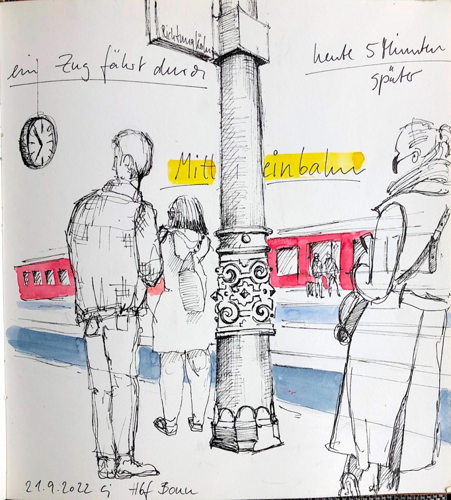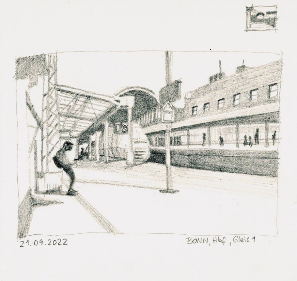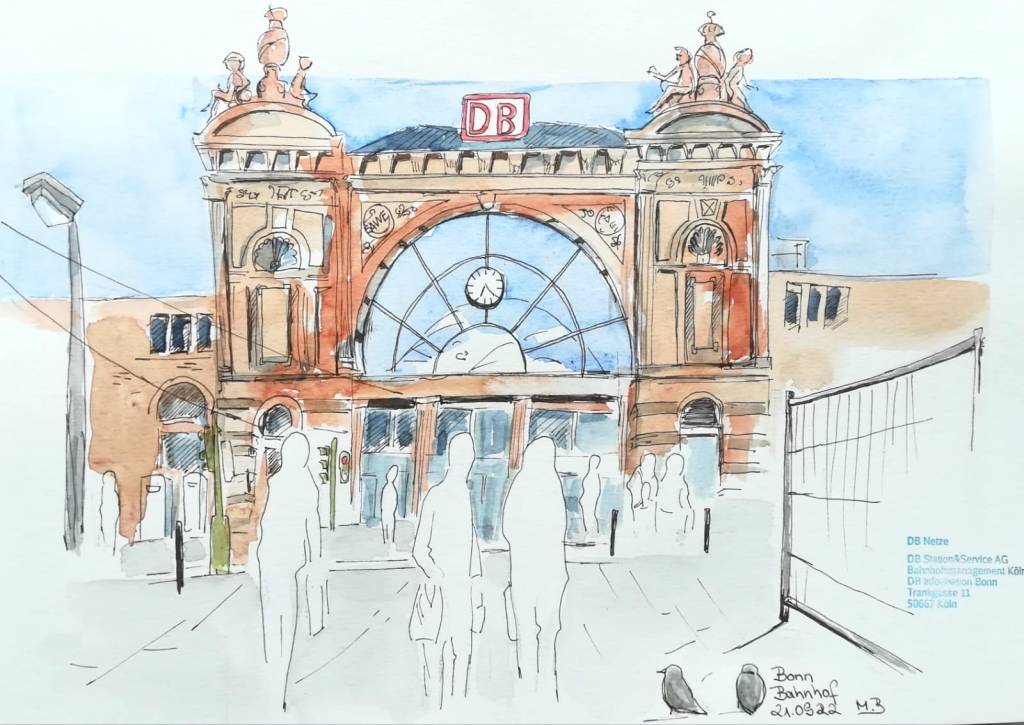 Die Tage werden merklich kürzer und kälter; wir müssen uns nach wettergeschützten Orten umsehen. Am Mittwoch, dem 21.09.2022, treffen wir uns ab 18 Uhr im Gebäude des Hauptbahnhofs Bonn. Dort können wir die Reisenden beobachten, Wartende, Eilende, am Ständchen stehende, oder auch die Architektur des Bahnhofs und der Gleisüberdachung zeichnen – interessante Szenen gibt es sicher genug! Vor Regen sind wir dort geschützt; eine warme Jacke zu tragen ist aber ratsam. Die Vernissage machen wir in der Halle des Hauptgebäudes um 19:45 Uhr.
