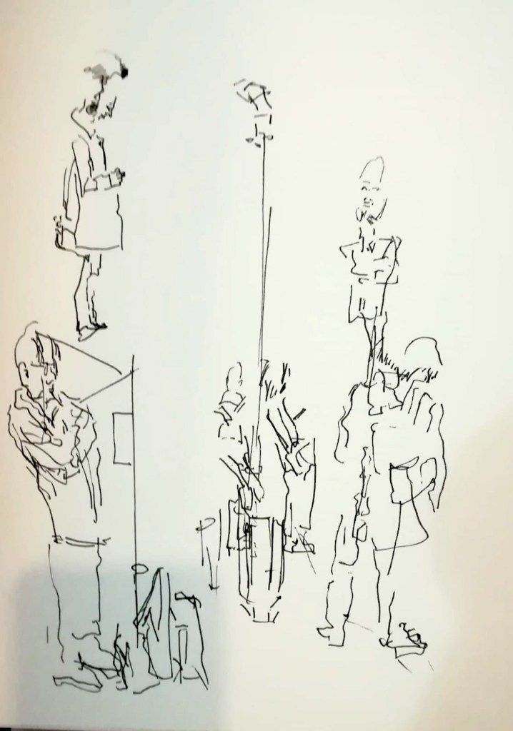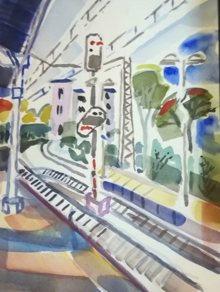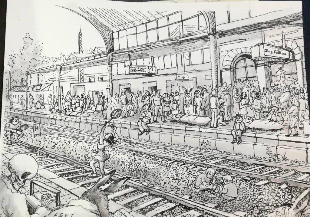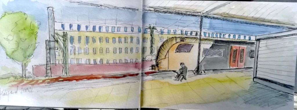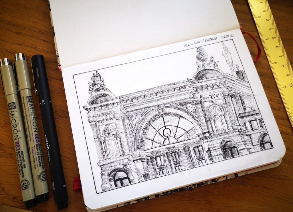 Die Tage werden merklich kürzer und kälter; wir müssen uns nach wettergeschützten Orten umsehen. Am Mittwoch, dem 21.09.2022, treffen wir uns ab 18 Uhr im Gebäude des Hauptbahnhofs Bonn. Dort können wir die Reisenden beobachten, Wartende, Eilende, am Ständchen stehende, oder auch die Architektur des Bahnhofs und der Gleisüberdachung zeichnen – interessante Szenen gibt es sicher genug! Vor Regen sind wir dort geschützt; eine warme Jacke zu tragen ist aber ratsam. Die Vernissage machen wir in der Halle des Hauptgebäudes um 19:45 Uhr.