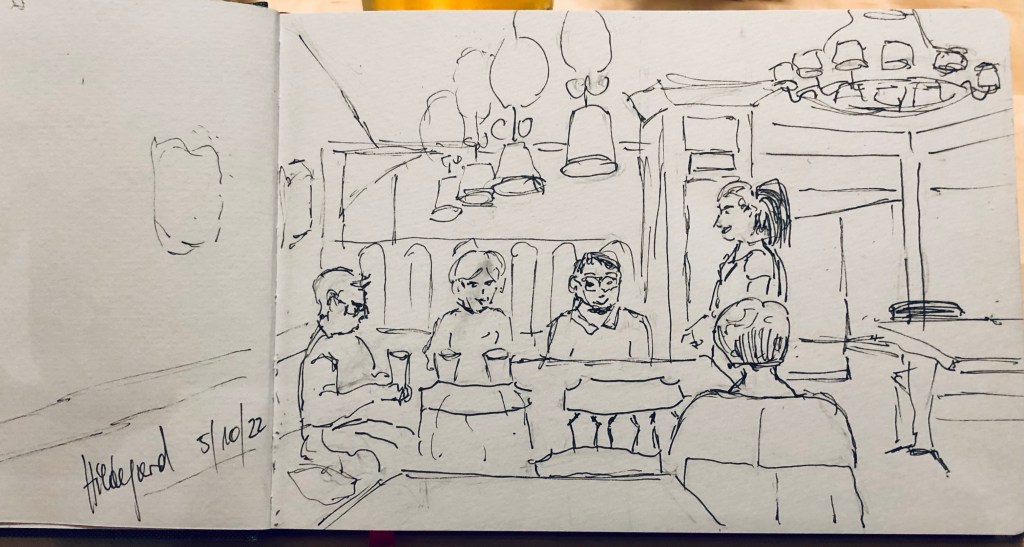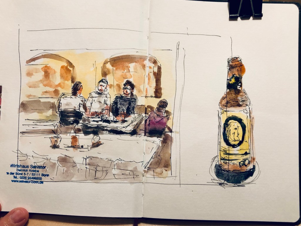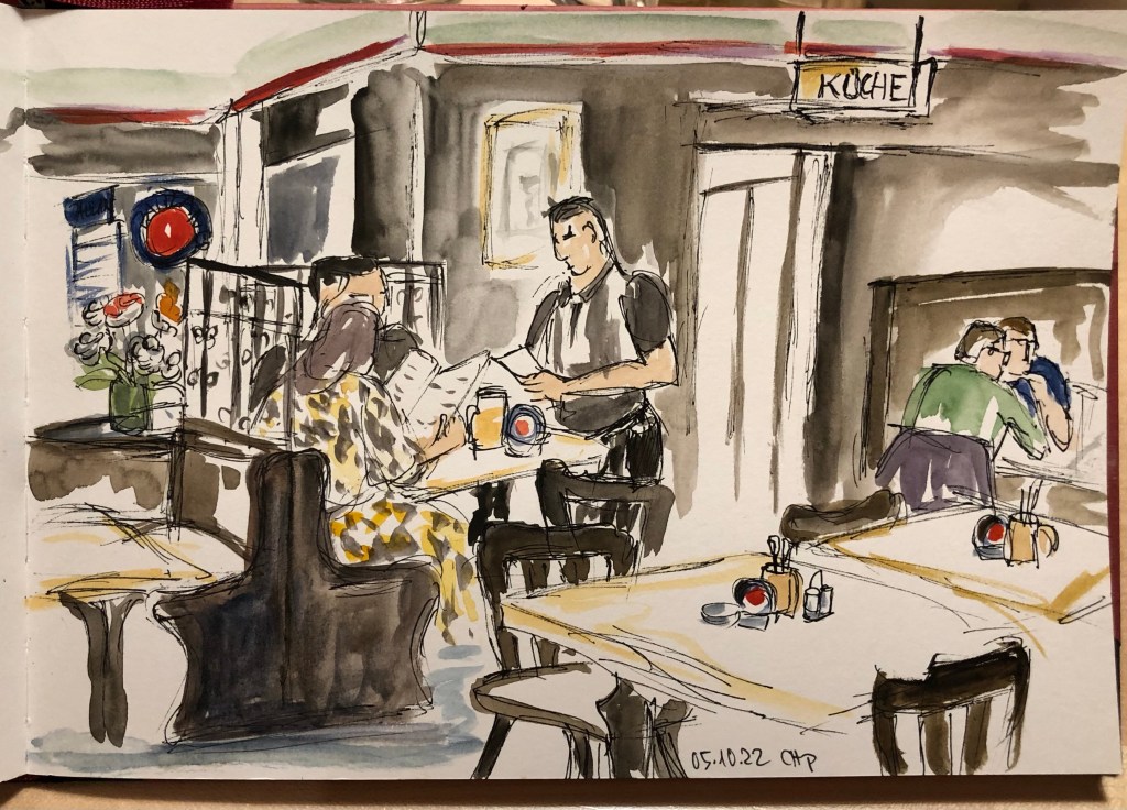 Diesmal geht es in eine Gaststätte. Am kommenden Mittwoch, dem 5.10.2022, treffen wir uns ab 18 Uhr im Wirtshaus „Salvator“, In der Sürst 5-7, Bonn Innenstadt. Der Gastraum ist recht groß, einen Tisch haben wir nicht bestellt, wer zuerst da ist, besetzt einen nicht zu kleinen Tisch. Evtl. können wir uns auch auf mehrere Tische verteilen; wir sollten aber darauf achten, dass wir den übrigen Gästen noch genug Platz lassen. Oder es ist so schön, dass wir draußen sitzen können! Essen und Trinken ist natürlich angesagt und darf auch gezeichnet werden. Sonst natürlich noch Mitzeichner, sonstiges Publikum, die Inneneinrichtung und die Oktoberfest Stimmung. Die Vernissage findet um 19:45 Uhr statt – wo, das wird sich zeigen.