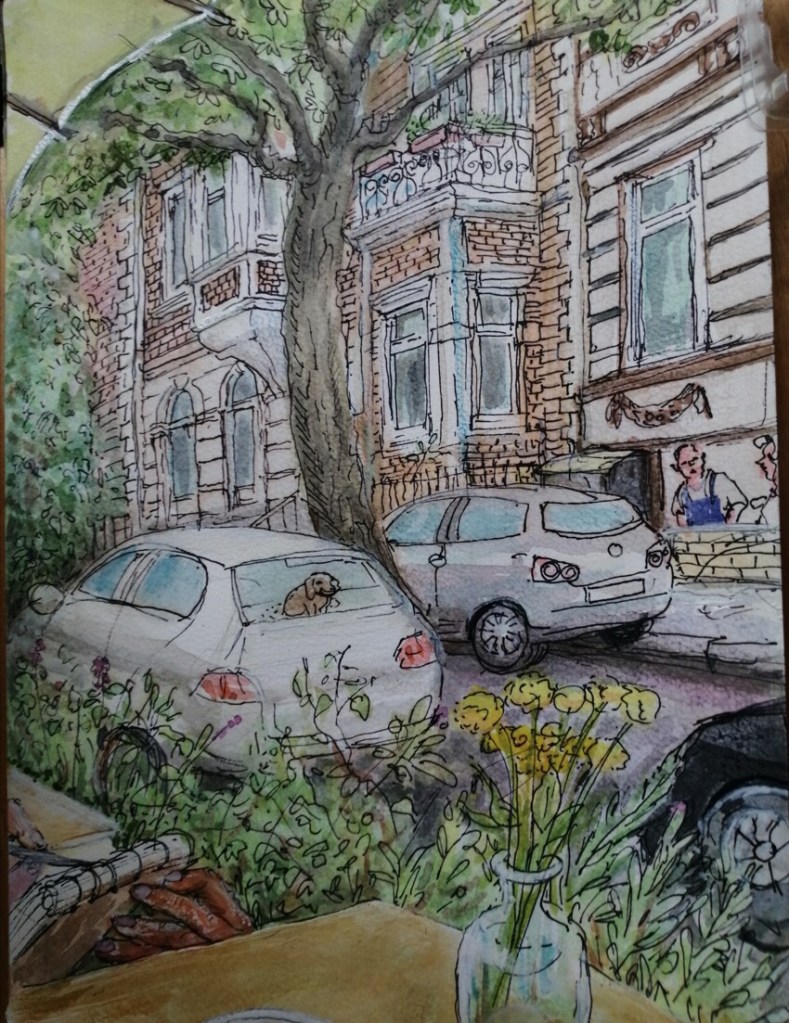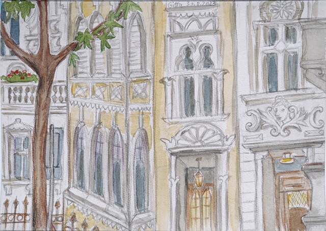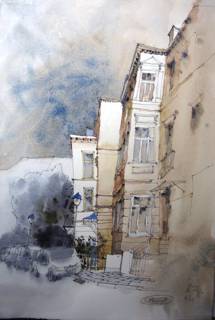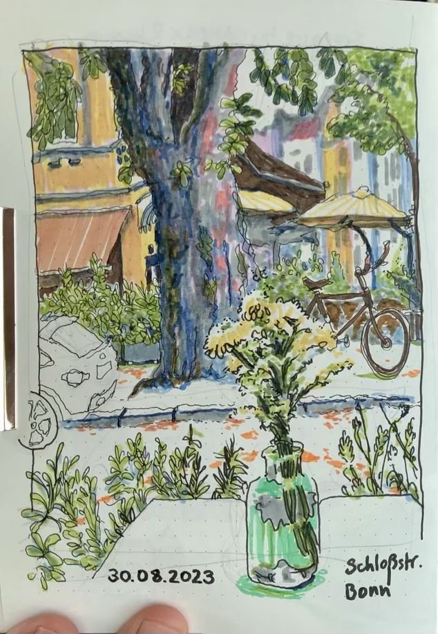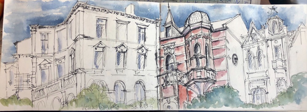 Am nächsten Mittwoch, dem 30.8.2023, treffen wir uns ab 18 Uhr in der Bonner Südstadt: in der Kurfürstenstraße, Schlossstraße und im Venusbergweg stehen prachtvolle Häuser aus der Gründerzeit; diese wollen wir uns anschauen und skizzieren. Auch Blicke in den Botanischen Garten sind vom Venusbergweg aus möglich. Die Vernissage machen wir um 19:30 Uhr an der Ecke Venusbergweg / Schlossstraße.