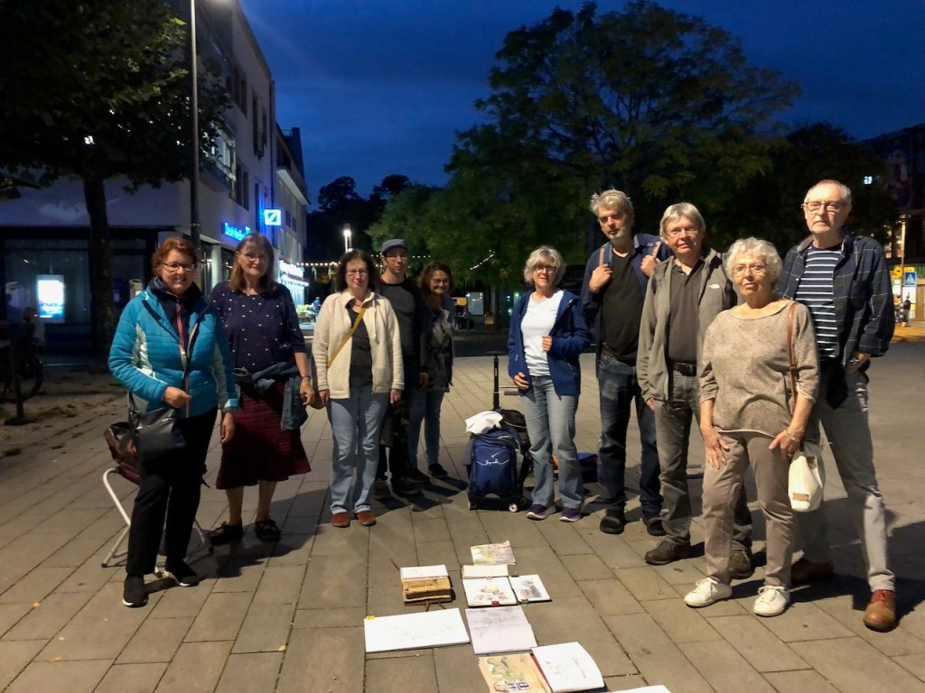 Zu Zeichnen gibt es neben dem Stadtplatz mit dem Kinopolis auch Gastronomie unter netten kleinen Bäumen, Altbauten und einen reizvollen Durchblick durch die Oststraße zur Godesburg. Die Vernissage machen wir am Eingang zur Oststraße um 19:30 Uhr.