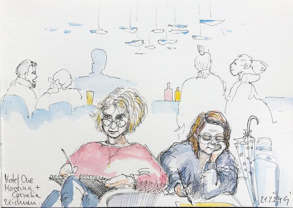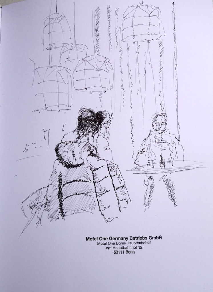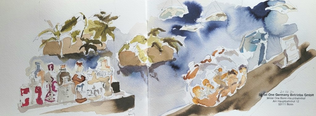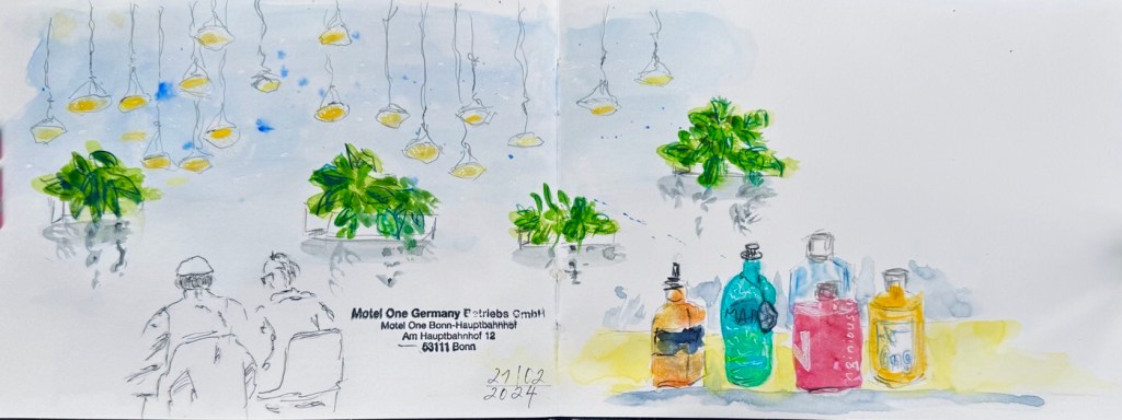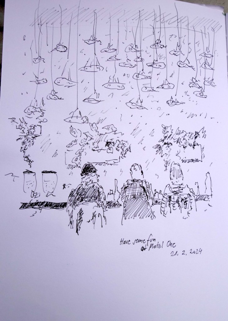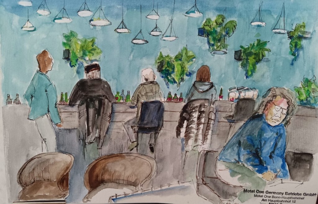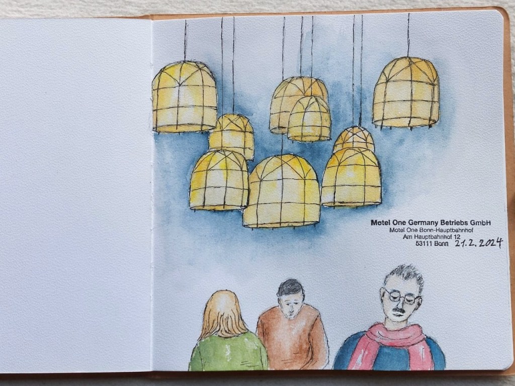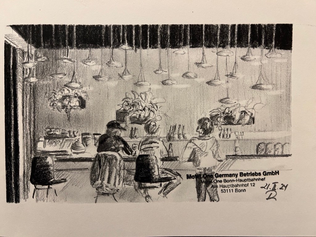 Eine kurze Nachfrage dort, ob wir Zeichener mal kommen können, stieß auf offene Ohren und eine freundliches „Selbstverständlich, gerne!“. So treffen wir uns am kommenden Mittwoch, dem 21.02.024, ab 18 Uhr – oder auch früher –  in der Lounge/ Bar vom Motel One am Hauptbahnhof Bonn, Ecke Thomas Mann Straße; der Zugang ist von der Maximilianstraße aus oder von der Straße „Am Hauptbahnhof“. Das Ambiente ist sehr ansprechend und voller Zeichenmotive: besonders die verschiedenen Lampenkreationen oder auch die Galerie der Leuchtgloben. Es gibt eine Bar, an der man sich etwas zu trinken und Kleinigkeiten zu Essen holen kann, und dann kann man gemütlich in ganz unterschiedlichen Ecken sitzen, von Plüsch bis Korb, von Ohren bis Schaukel… und zeichnen. Für die Vernissage finden wir einen Platz um ca. 19:45 Uhr.