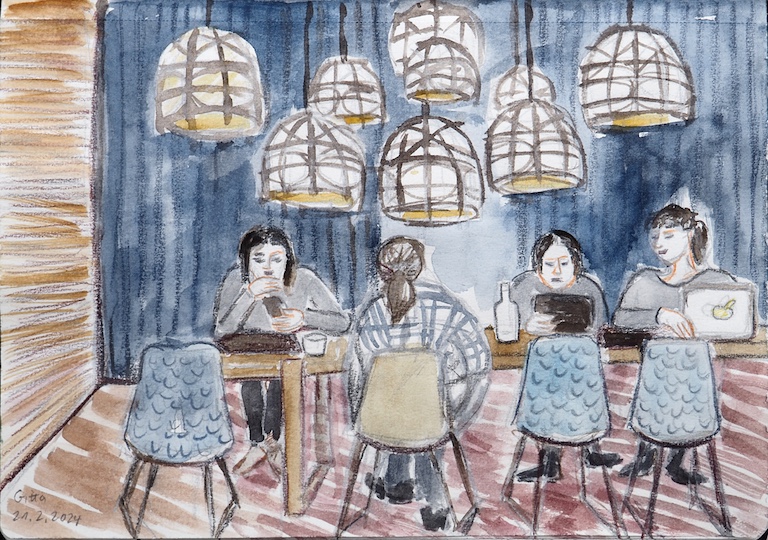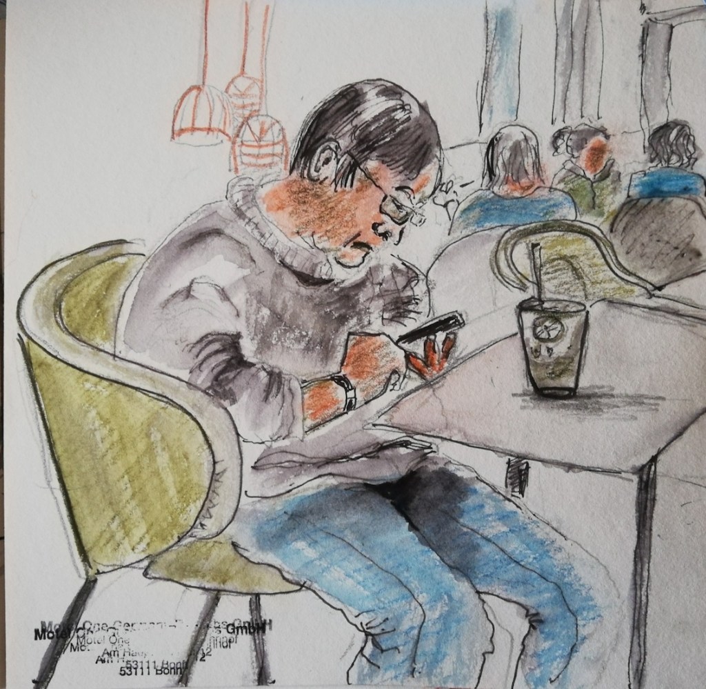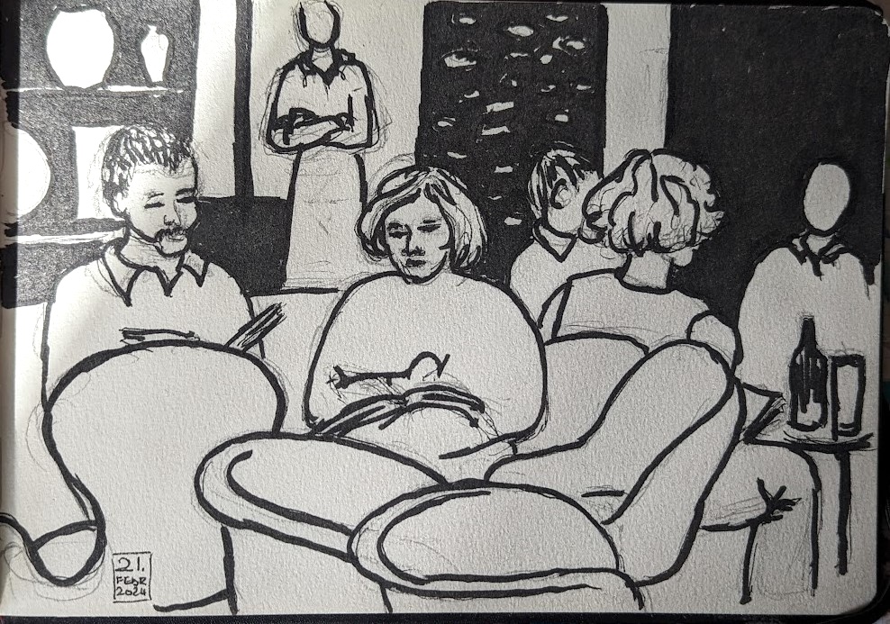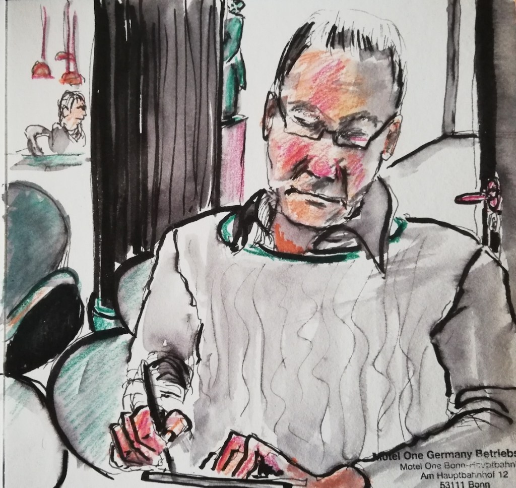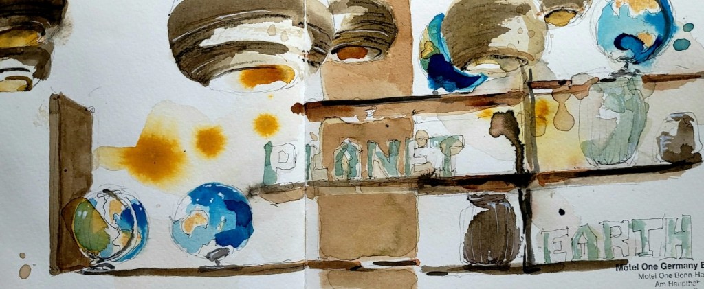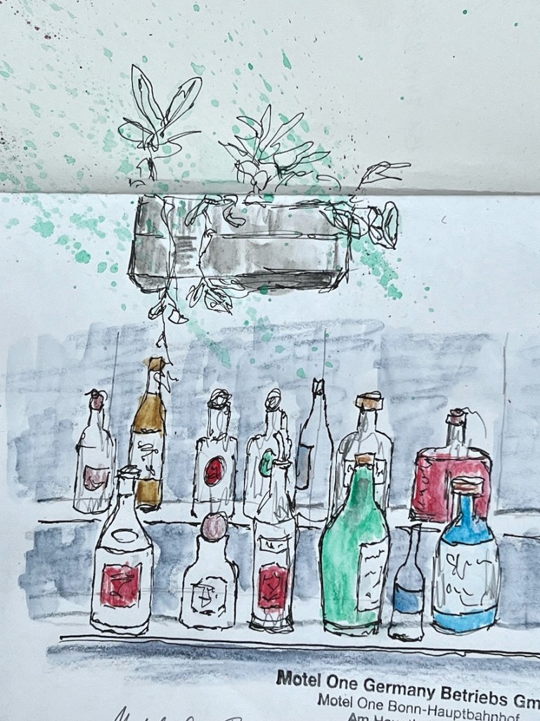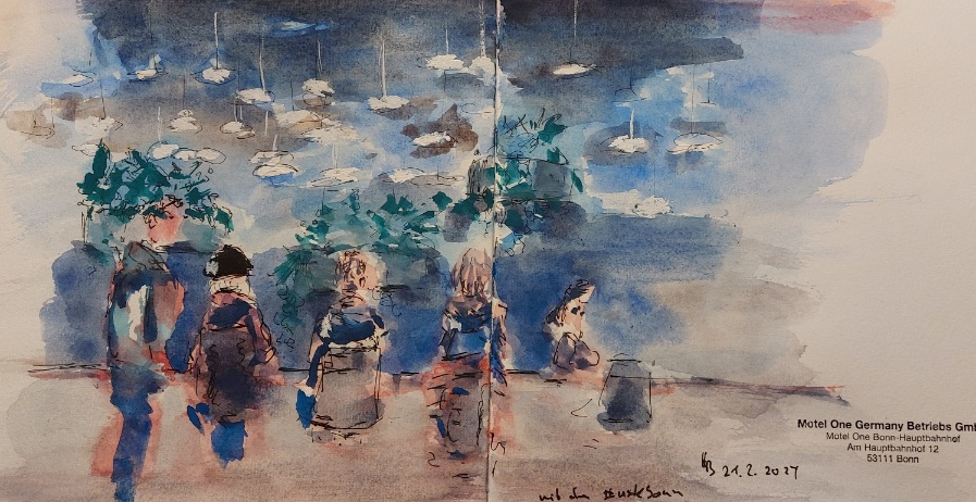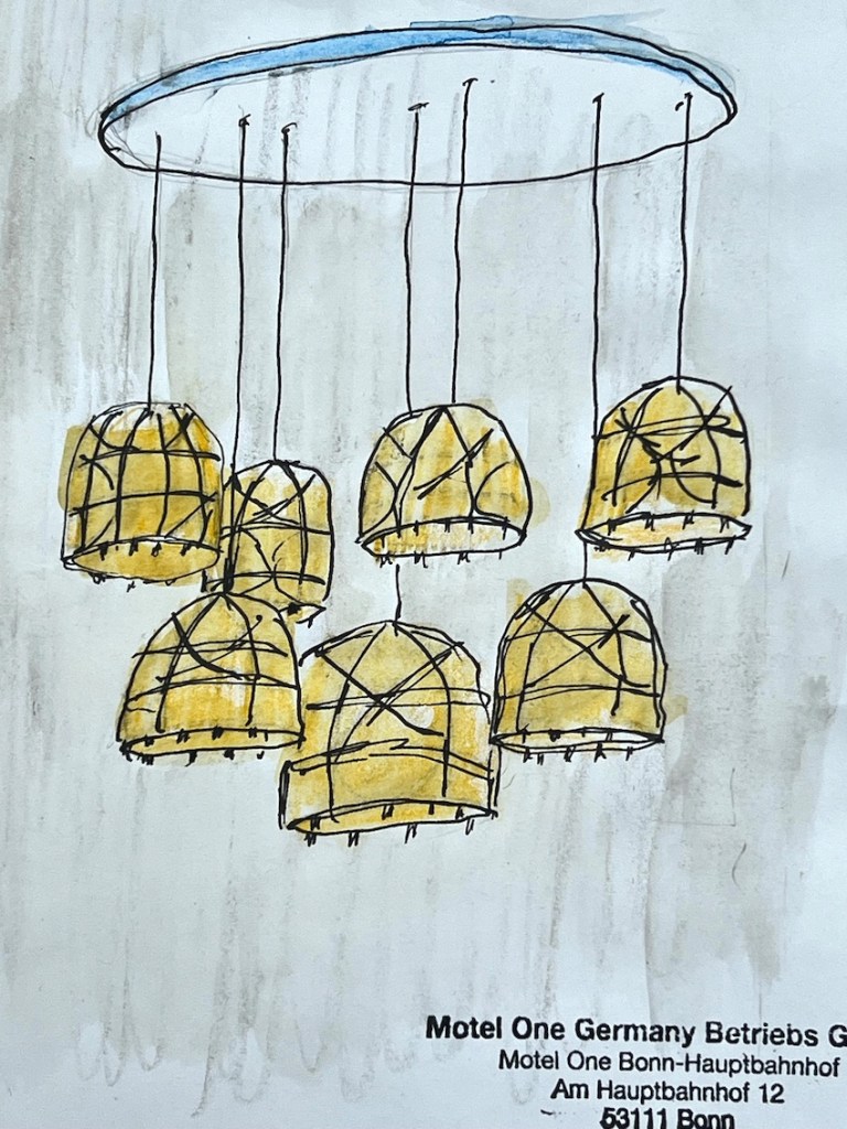 Eine kurze Nachfrage dort, ob wir Zeichener mal kommen können, stieß auf offene Ohren und eine freundliches „Selbstverständlich, gerne!“. So treffen wir uns am kommenden Mittwoch, dem 21.02.024, ab 18 Uhr – oder auch früher –  in der Lounge/ Bar vom Motel One am Hauptbahnhof Bonn, Ecke Thomas Mann Straße; der Zugang ist von der Maximilianstraße aus oder von der Straße „Am Hauptbahnhof“. Das Ambiente ist sehr ansprechend und voller Zeichenmotive: besonders die verschiedenen Lampenkreationen oder auch die Galerie der Leuchtgloben. Es gibt eine Bar, an der man sich etwas zu trinken und Kleinigkeiten zu Essen holen kann, und dann kann man gemütlich in ganz unterschiedlichen Ecken sitzen, von Plüsch bis Korb, von Ohren bis Schaukel… und zeichnen. Für die Vernissage finden wir einen Platz um ca. 19:45 Uhr.