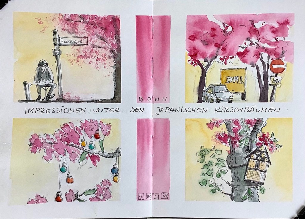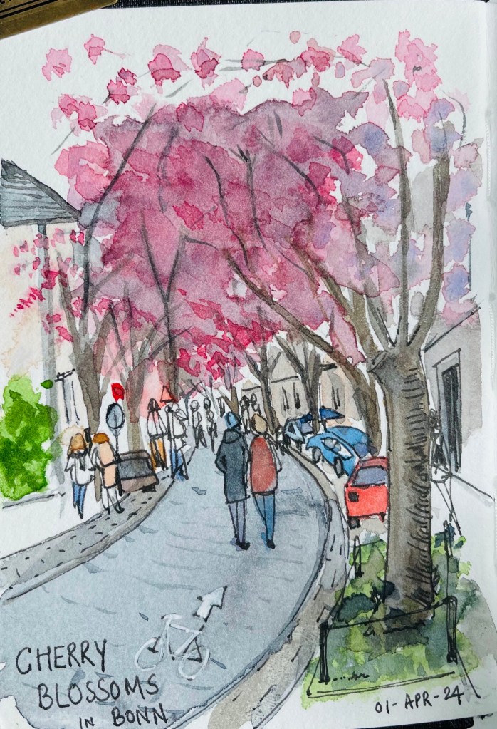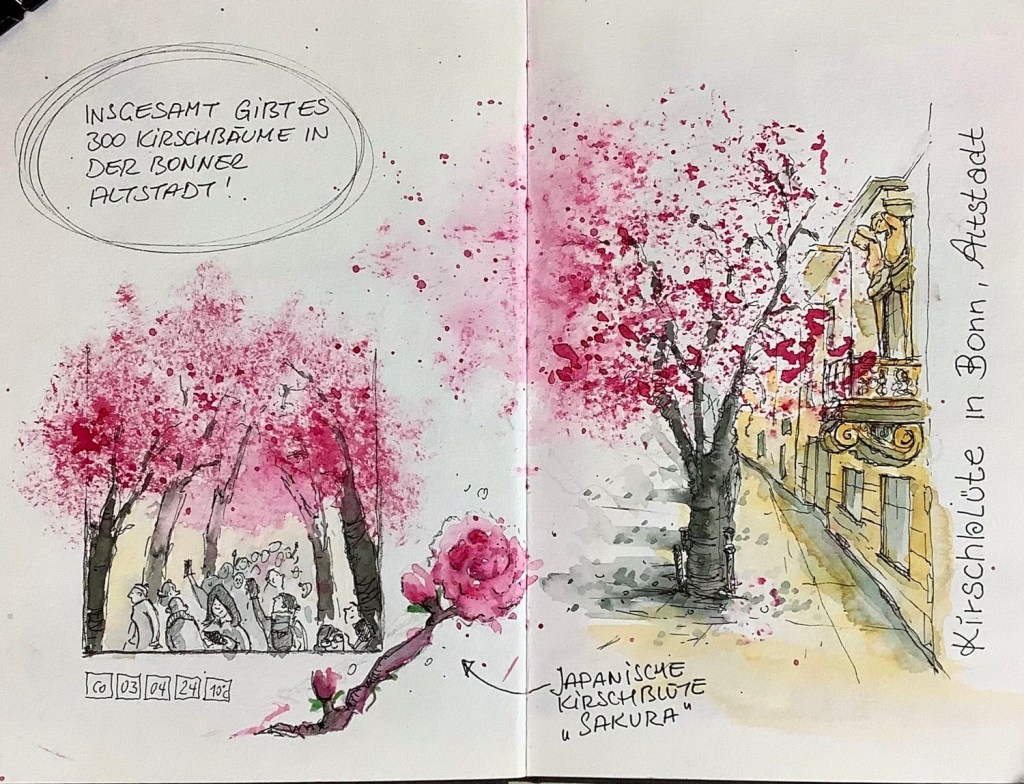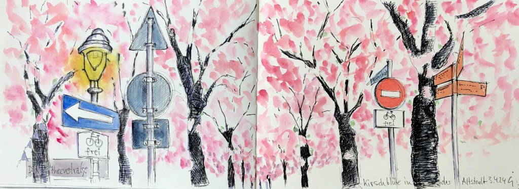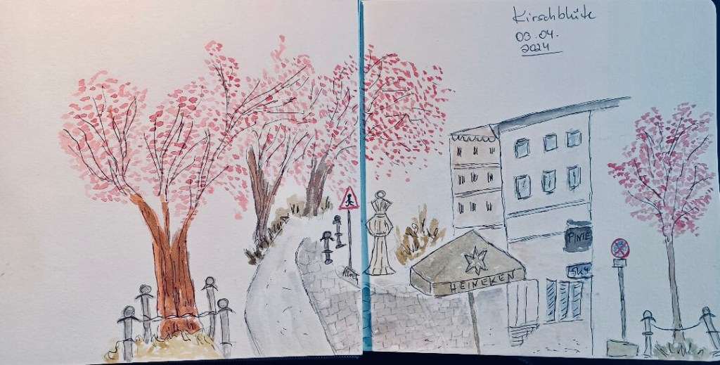 Am kommenden Mittwoch, dem 3.4.2024, treffen wir uns ab 18 Uhr in der Altstadt Bonn um – wie jedes Jahr – die Kirschblüte zu zeichnen. Treffpunkt ist die Heerstraße / Ecke Dorotheenstraße; dort machen wir dann die Vernissage um 19:45 Uhr. Ansonsten gibt es natürlich viele schöne Stellen, an denen man die Blüten wie auch ihre Auswirkungen auf die Mitmenschen zeichnen kann, evtl. auch aus der regensicheren Position eines Cafés, denn das Wetter ist noch etwas unsicher. Immerhin eine Stunde länger hell! Bushaltestelle ist „Dorotheenstraße“ gleich um die Ecke, Buslinien 604 und 605; die Haltestelle „Maxstraße“ ist z.Z. außer Betrieb.