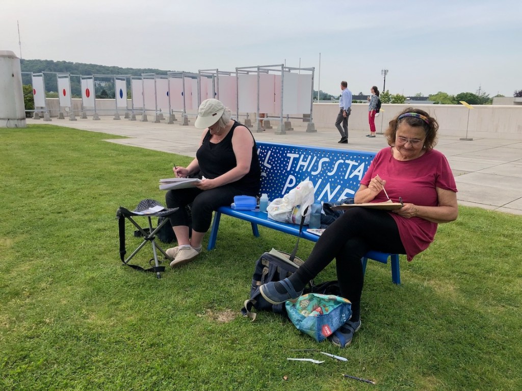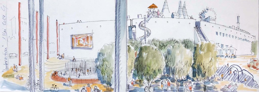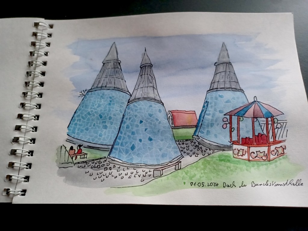 Wir Urban Sketchers sind auch dort dabei und machen mit und halten in unseren Skizzen fest, was dort geboten wird und was die Leute daraus machen. Von 15 – 18 Uhr, treffen wir uns diesmal und die Vernissage machen wir um 17:45 Uhr am Fuß der großen Treppe auf das Museumsdach der Bundeskunsthalle.