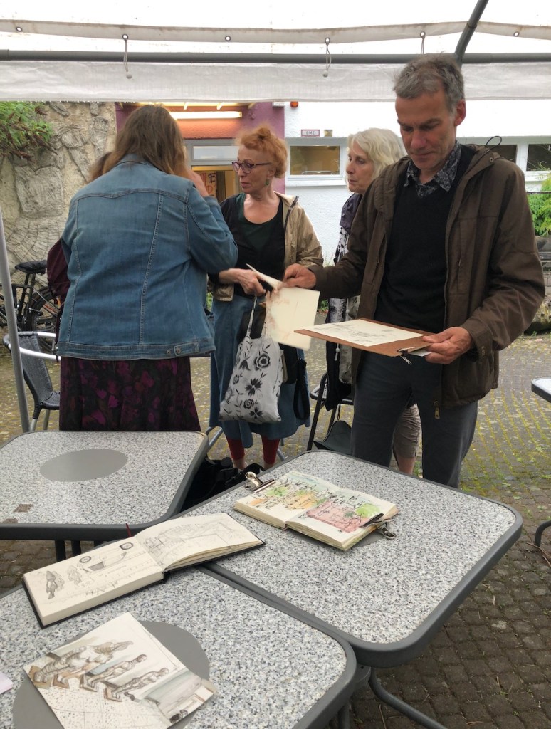 Cornelia J. – ab und zu Regen: Zeichner unterm Zelt im Hof des Frauenmuseums